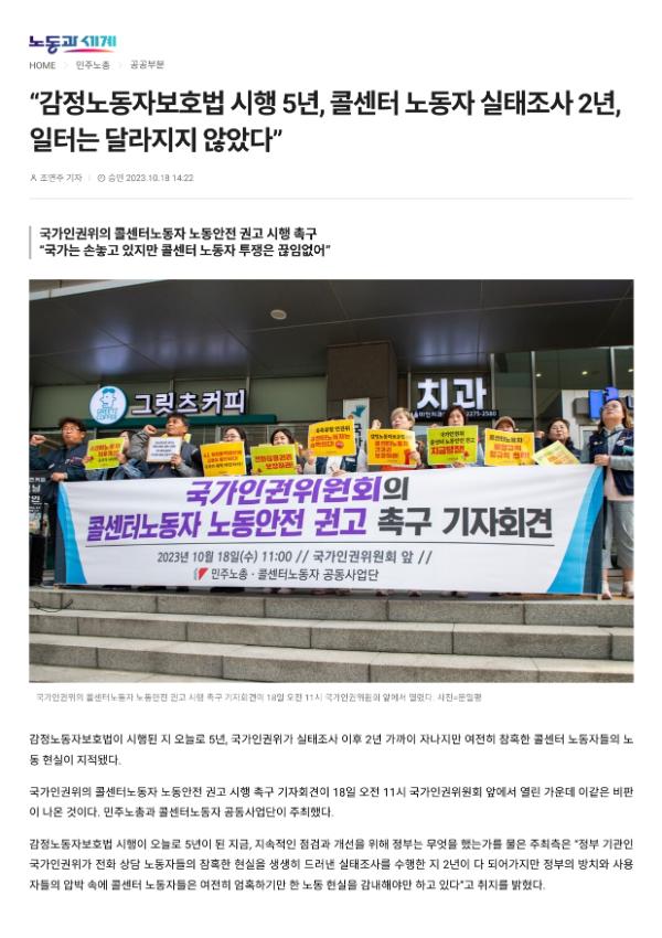 [기사] “감정노동자보호법 시행 5년, 콜센터 노동자 실태조사 2년, 일터는 달라지지 않았다”