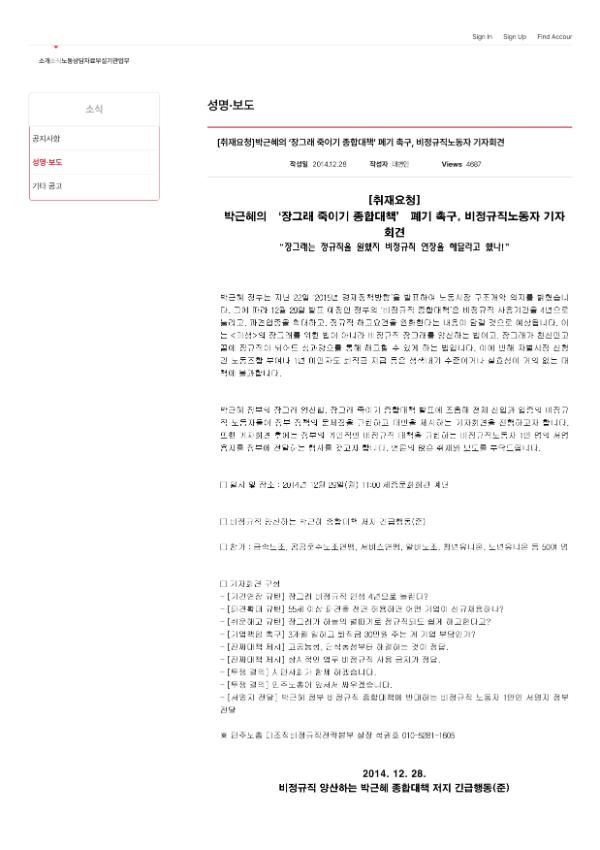 [취재요청] 박근혜의 장그래 죽이기 종합대책 폐기 촉구, 비정규직노동자 기자회견