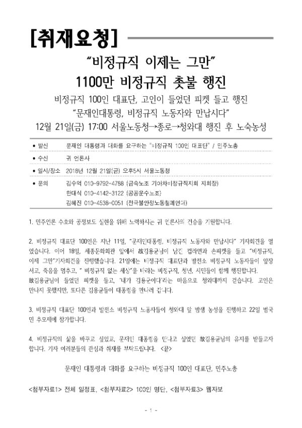 [취재요청] 비정규직 이제는 그만 1,100만 비정규직 촛불 행진