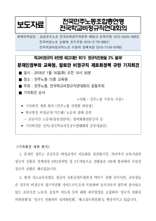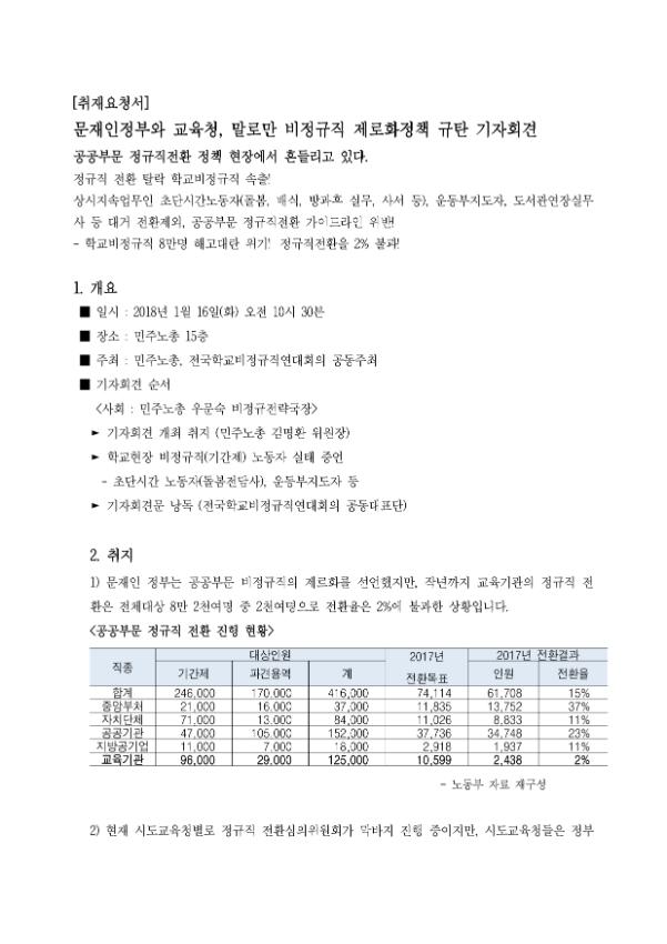 [취재요청] 문재인정부와 교육청, 말로만 비정규직 제로화정책 규탄 기자회견
