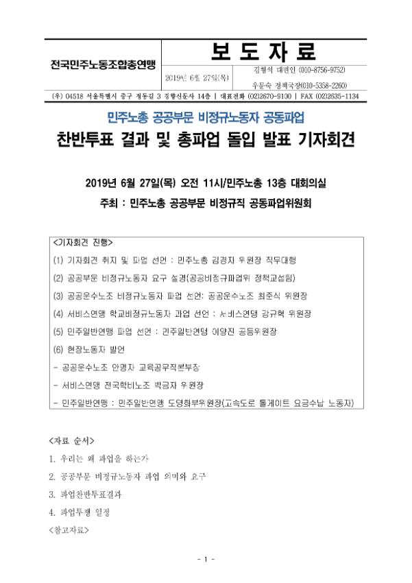 [보도자료] 민주노총 공공부문 비정규노동자 공동파업 찬반투표 결과 및 총파업 돌입 발표 기자회견