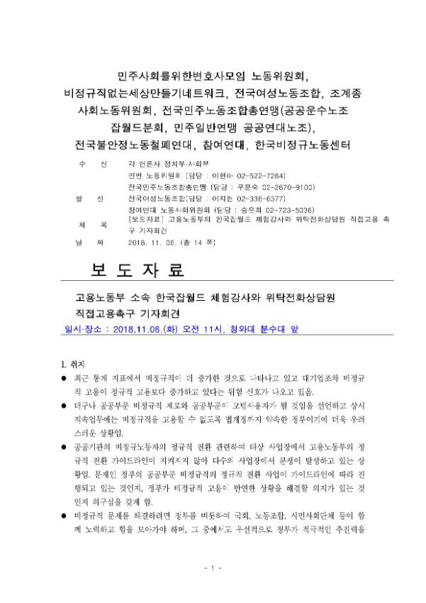 [보도자료] 고용노동부 소속 한국잡월드 체험강사와 위탁전화상담원 직접고용촉구 기자회견