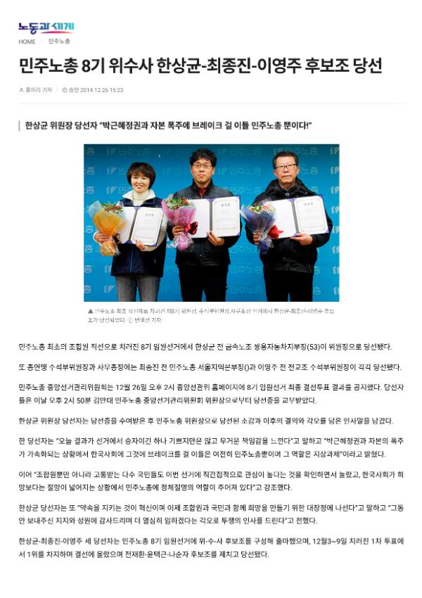 [기사] 민주노총 8기 위수사 한상균.최종진.이영주 후보조 당선