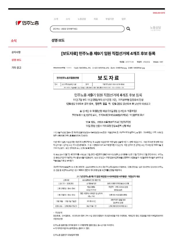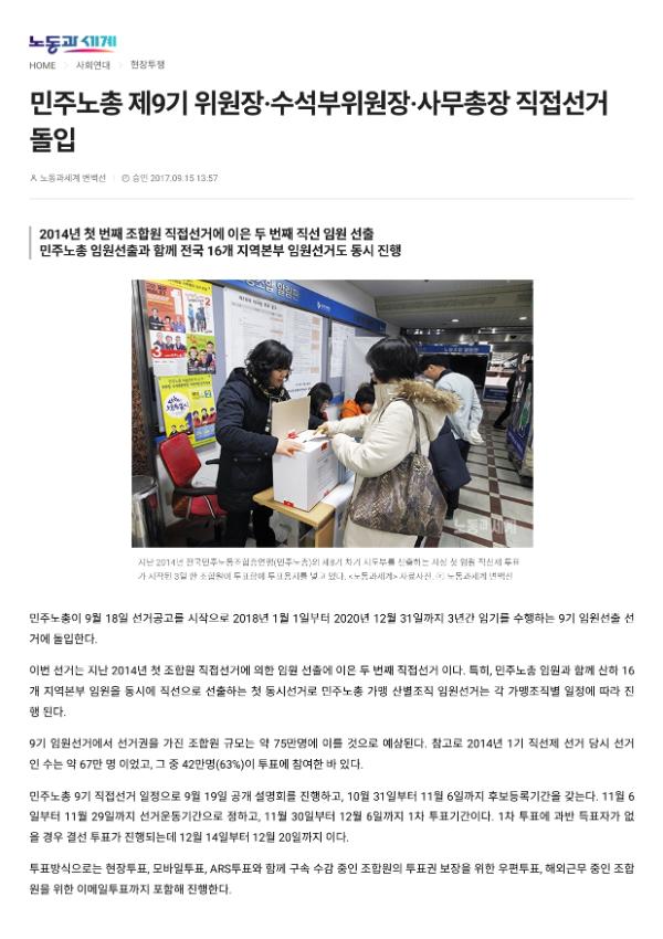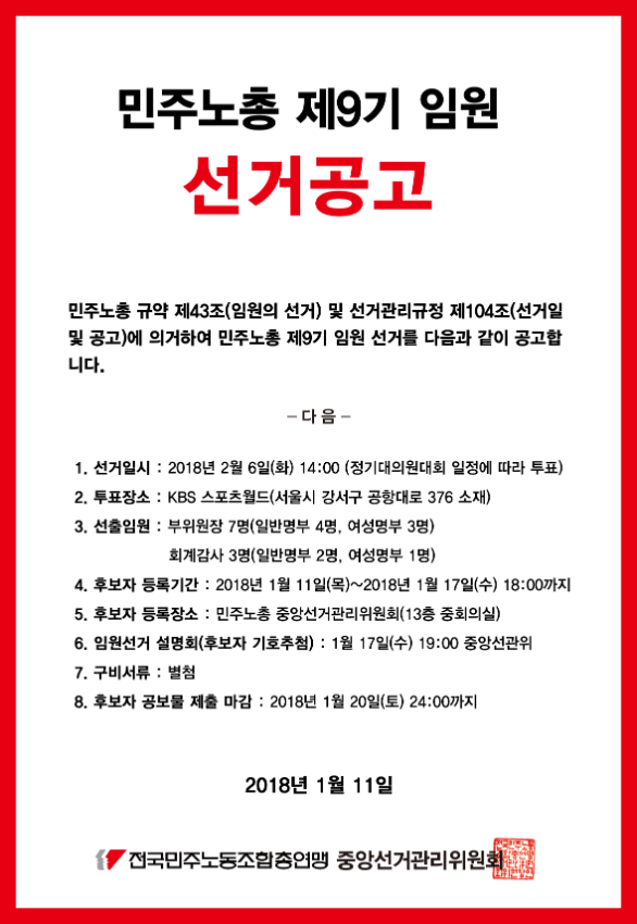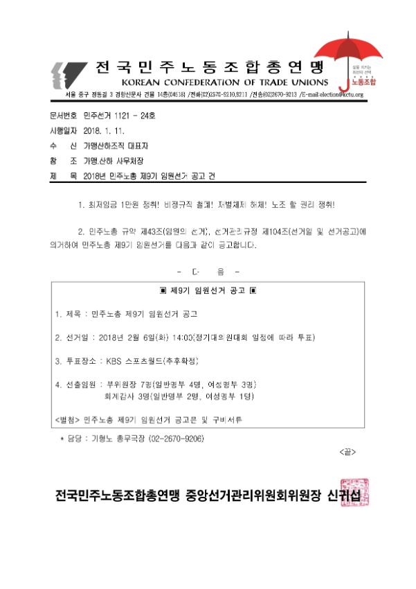 [보도자료] [공문]2018년 민주노총 제9기 임원선거 공고 건