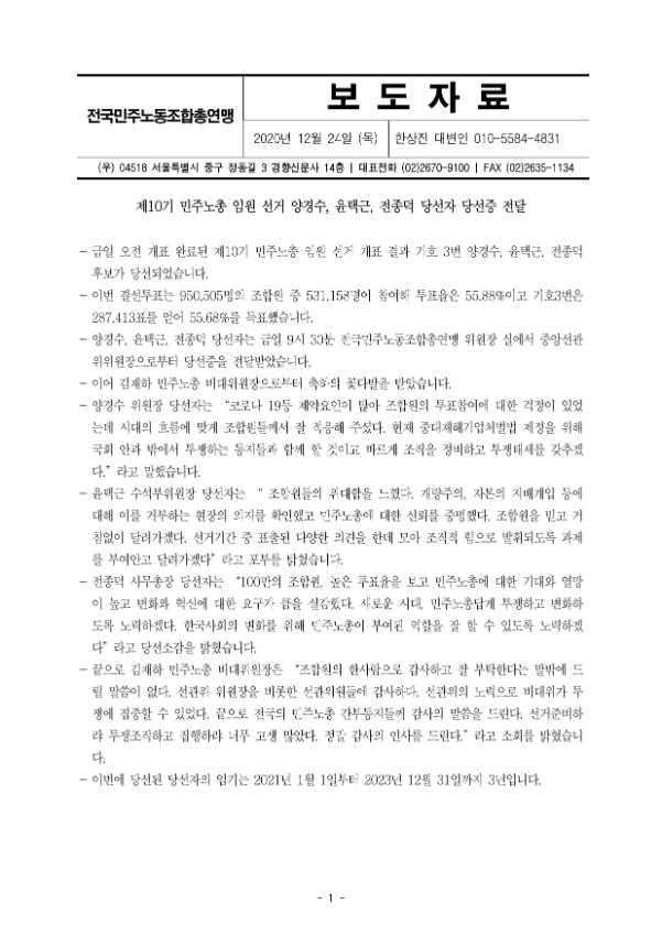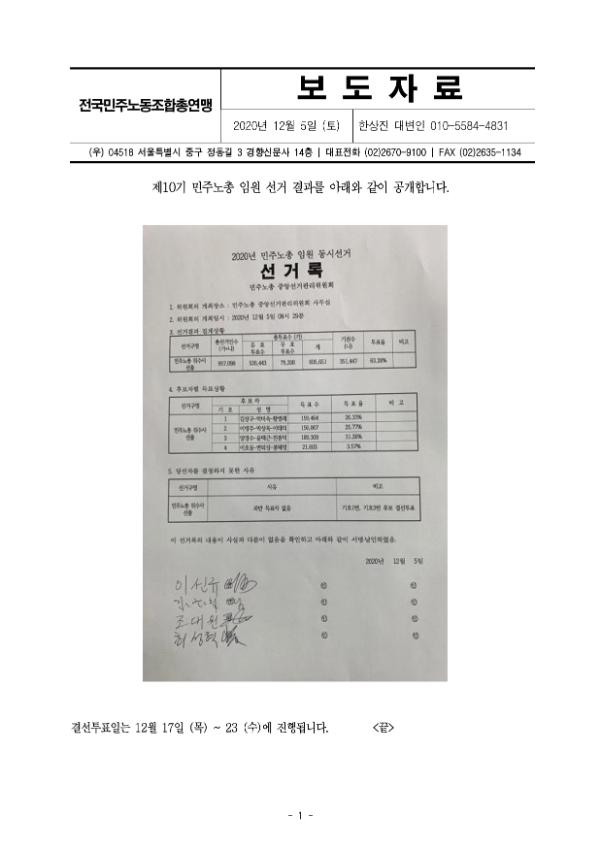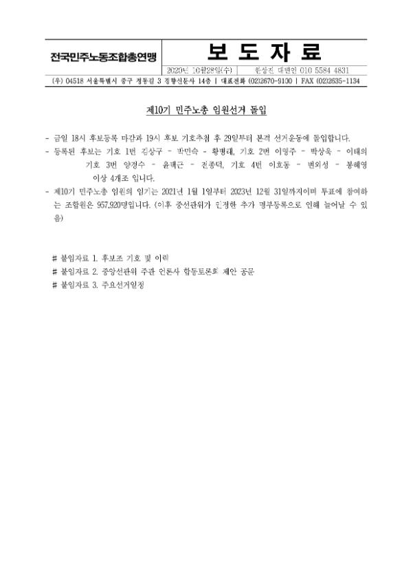 [보도자료] 제10기 민주노총 임원 선거 결과