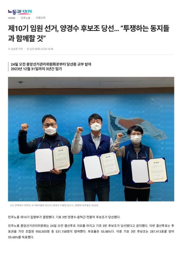 [기사] 제10기 임원 선거, 양경수 후보조 당선…투쟁하는 동지들과 함께할 것