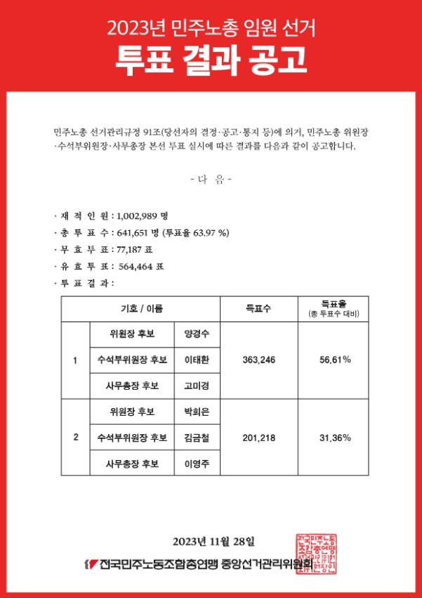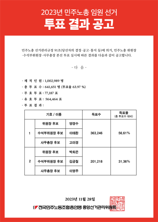 [웹자보] 2023년 민주노총 임원 선거 투표 결과 공고