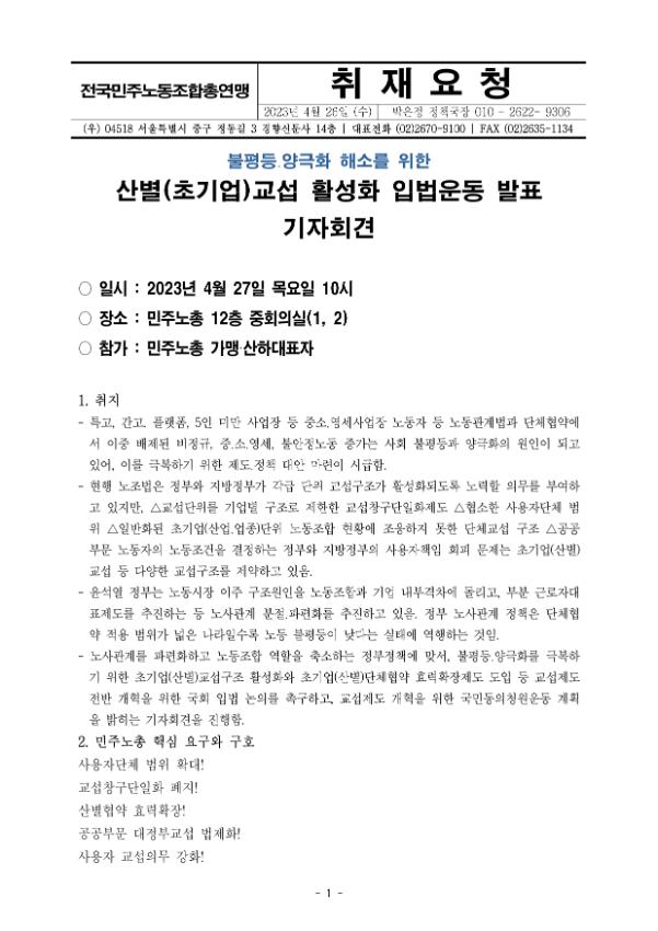 [취재요청] 산별(초기업)교섭 활성화 입법운동 발표 기자회견