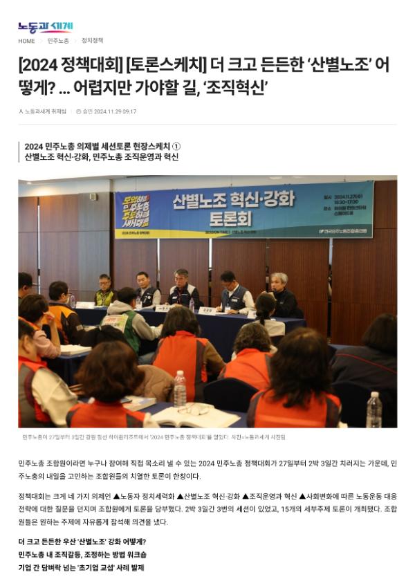 [기사] [2024 정책대회]더 크고 든든한 산별노조 어떻게…어렵지만 가야할 길, 조직혁신