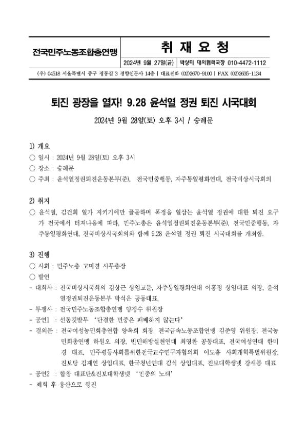 민주노총이 2024년 9월28일 전국동시다발 ‘퇴진광장을 열자! 9.28 윤석열정권 퇴진 시국대회’를 열고 윤석열 퇴진을 본격화했다. 전국동시다발로 열린 시국대회에는 민주노총 조합원을 비롯해 농민과 빈민 등 각계각층 민중도 함께했다. 5천여 명이 참여한 수도권대회는 본집회를 마친 뒤 용산 대통령실을 향해 행진하던 대오가 항의행동을 펼치던 중 민주노총 조합원 1명이 연행되는 일이 벌어졌다.