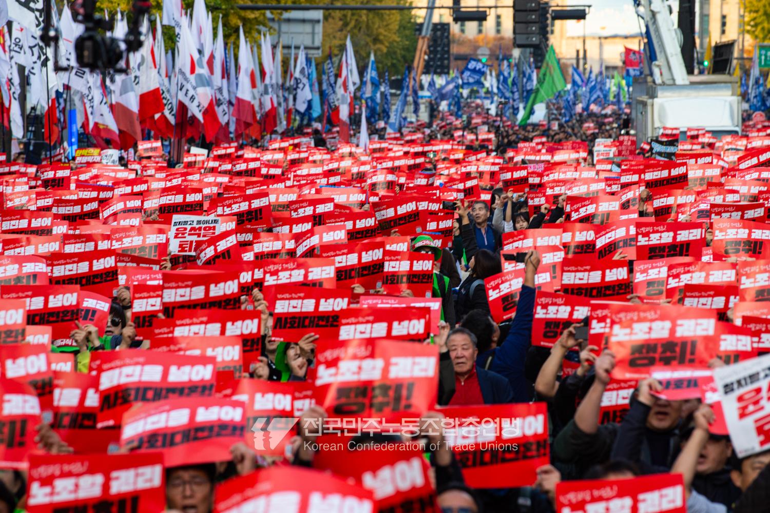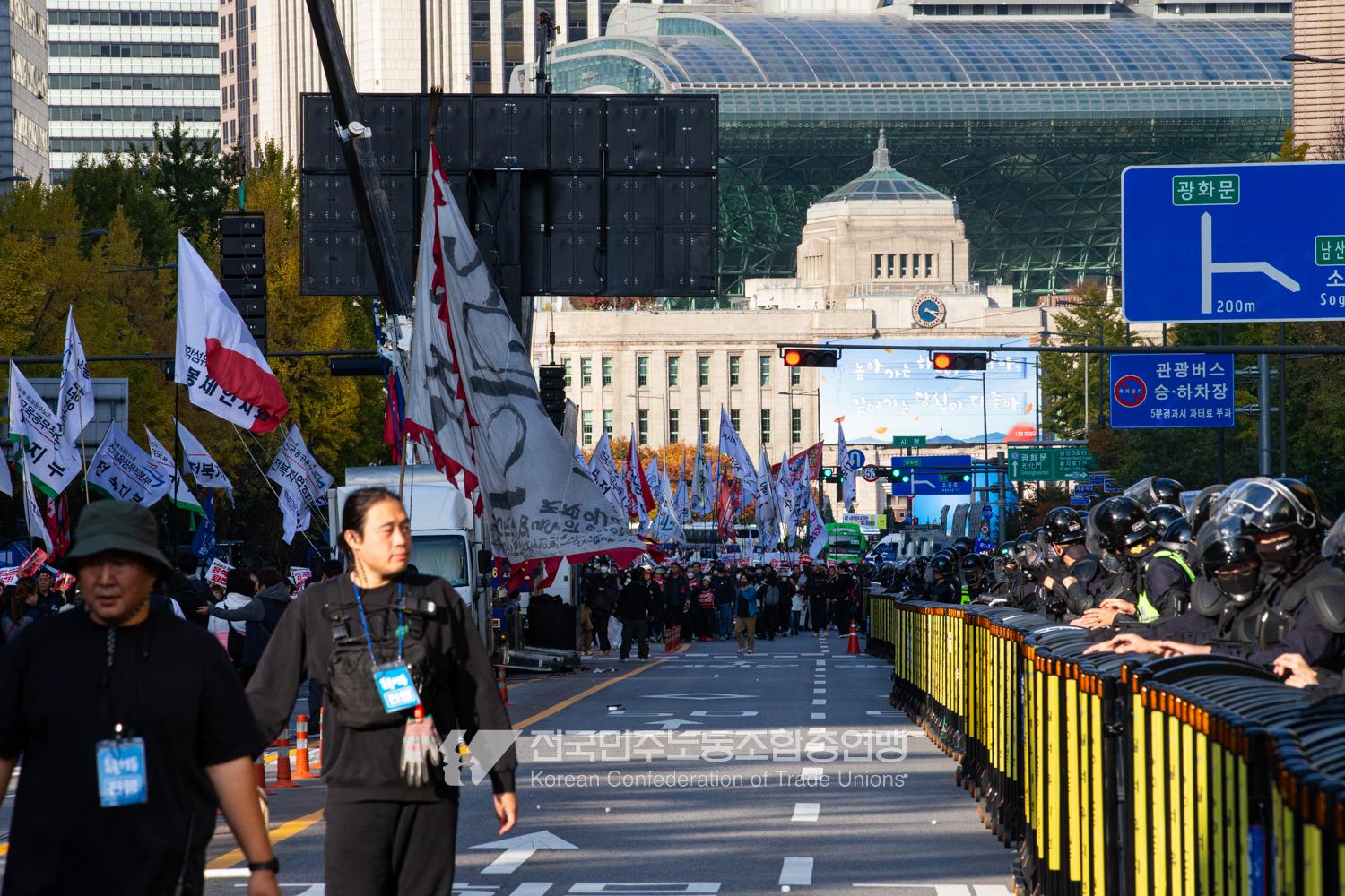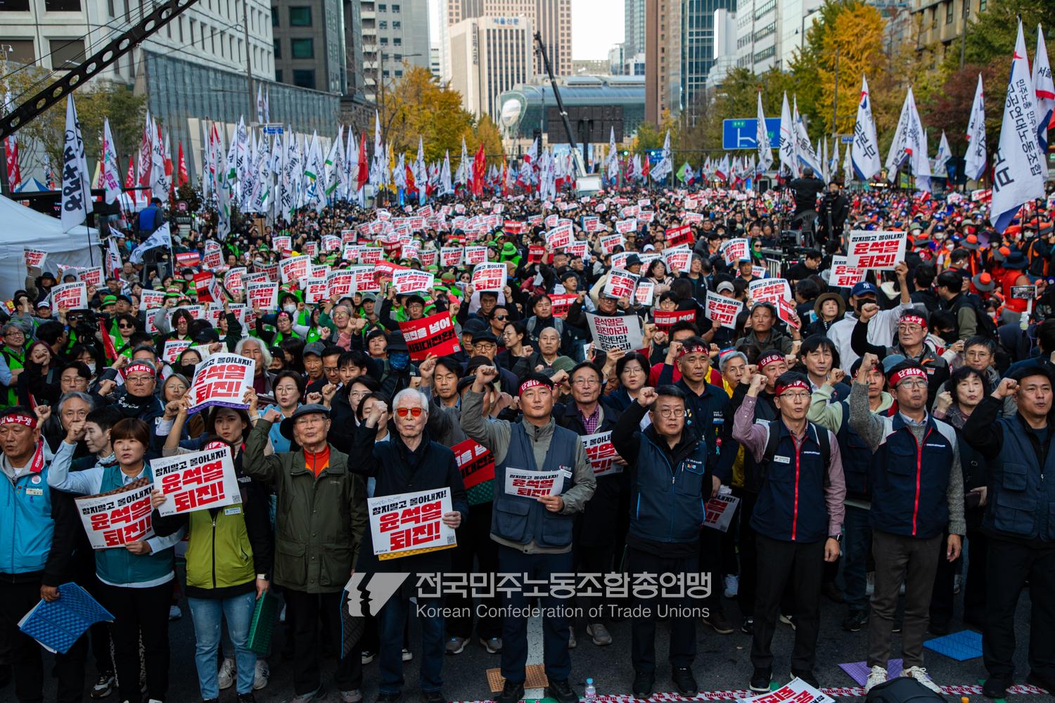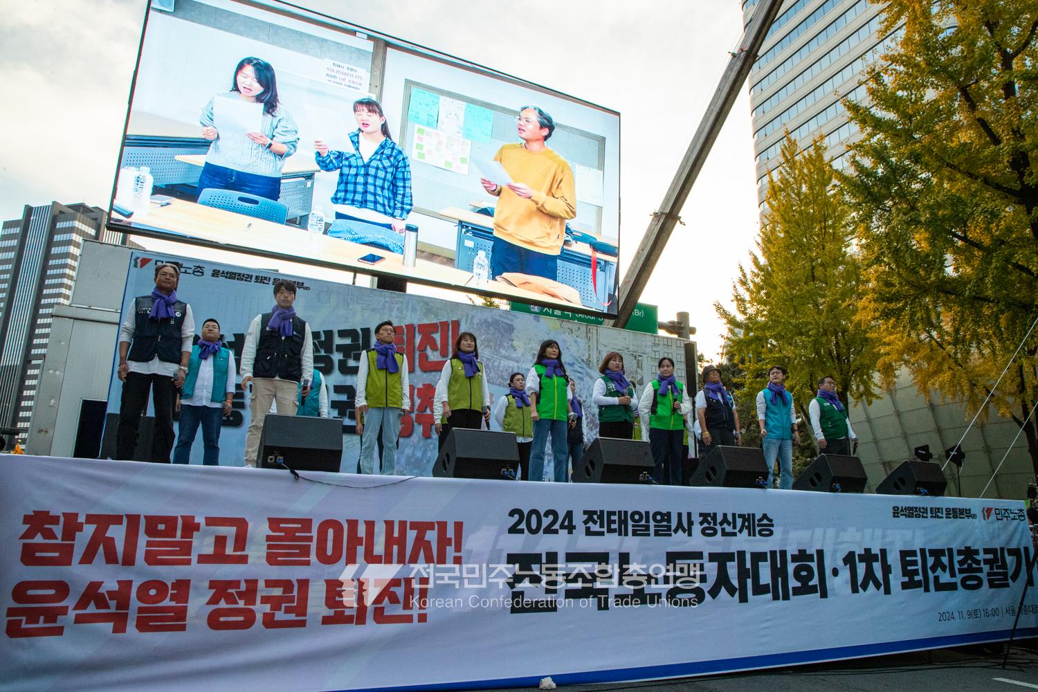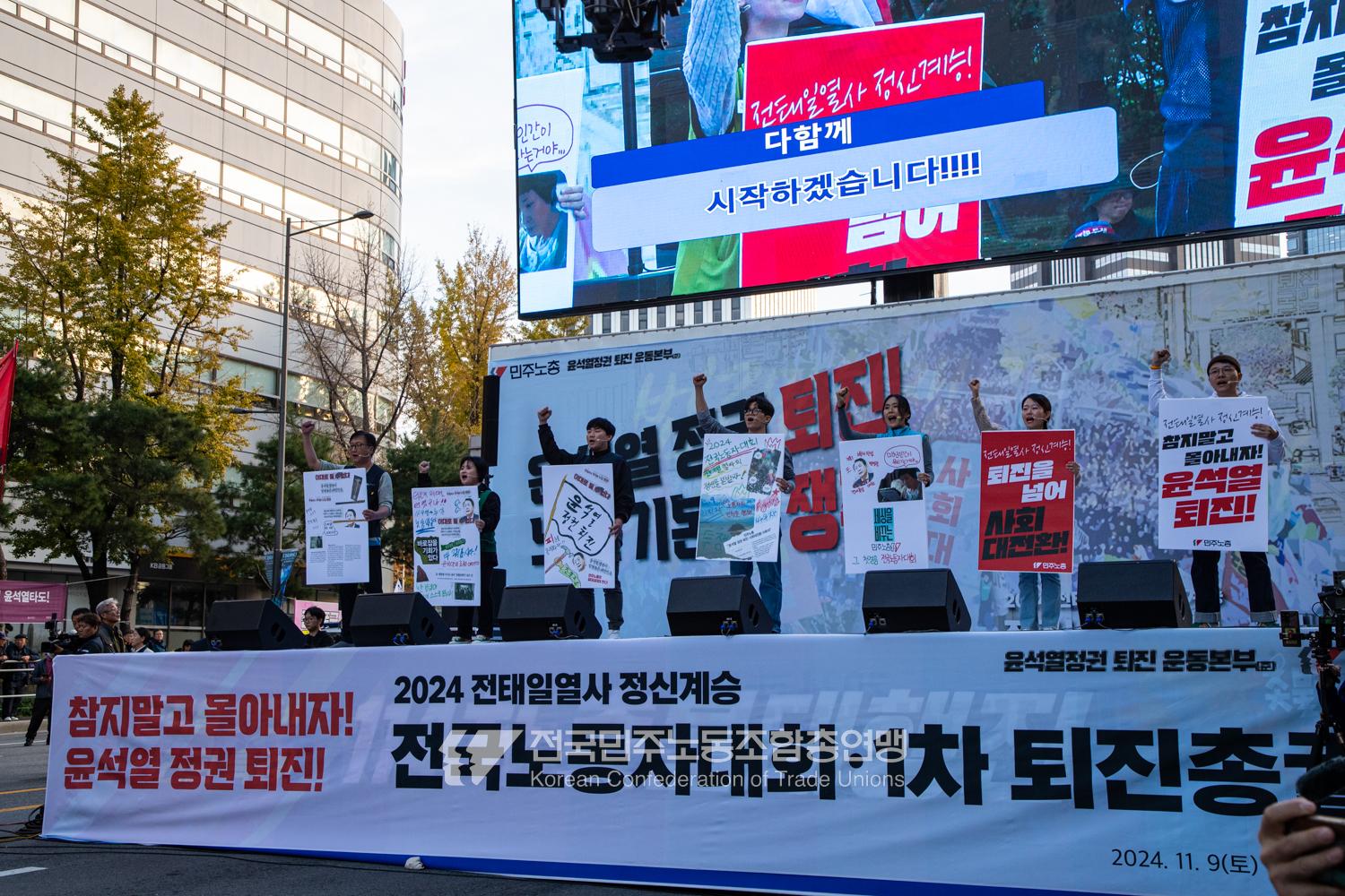 민주노총 10만여 조합원이 2024년 11월9일 서울 세종대로에 모여 윤석열정권 퇴진광장을 열기 위한 전태일열사 정신계승 2024 전국노동자대회를 열었다. 민주노총 16개 산별연맹이 도심 14곳에서 사전대회를 연 뒤 각기 다른 경로로 행진하며 본대회 장소로 모였다. 행진 과정에서 경찰의 과도한 도발과 폭력으로 인해 부상자 및 연행자가 다수 발생하기도 했다.