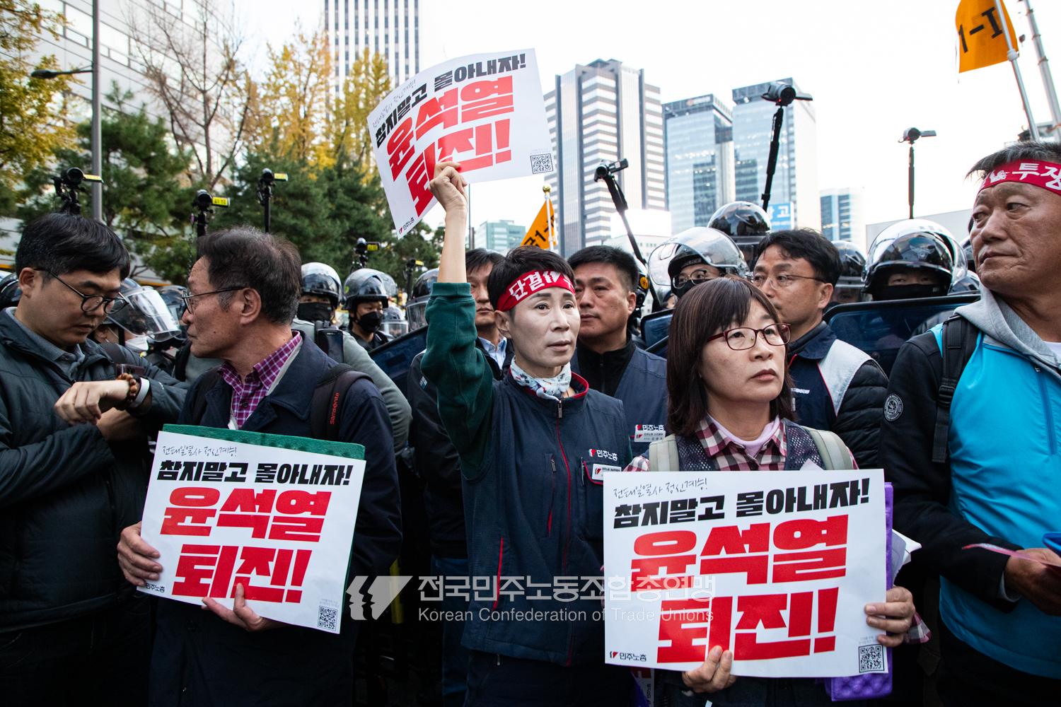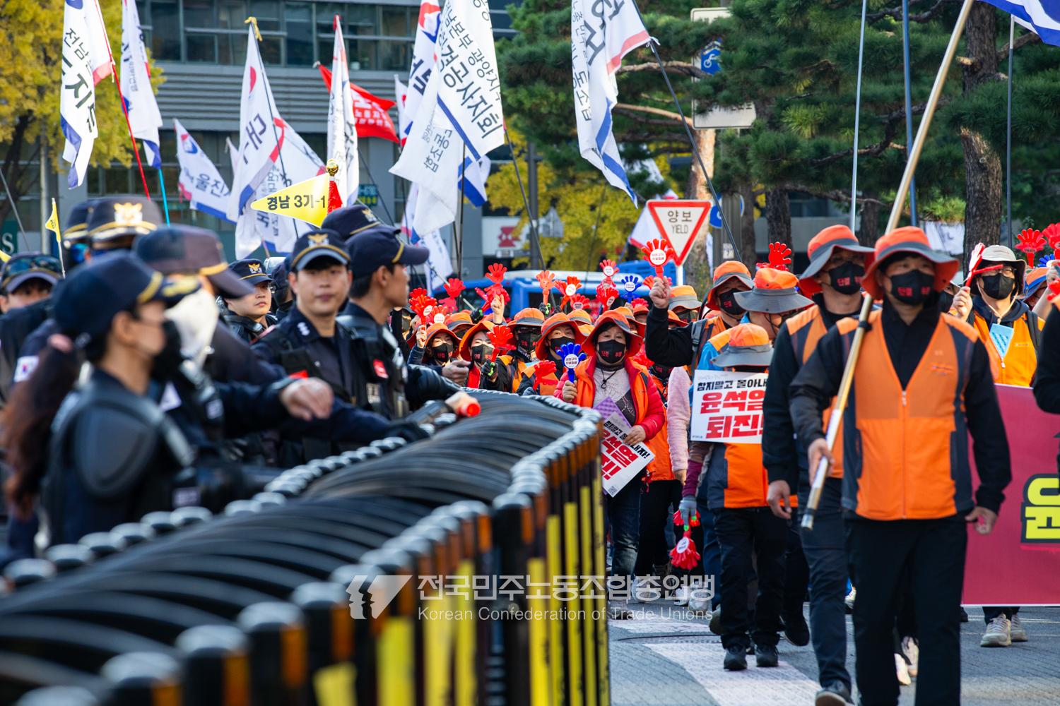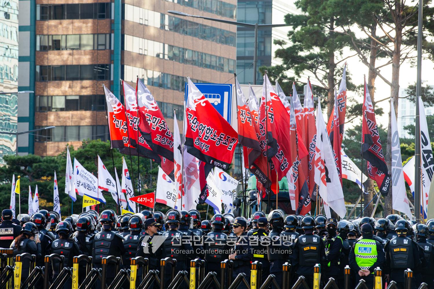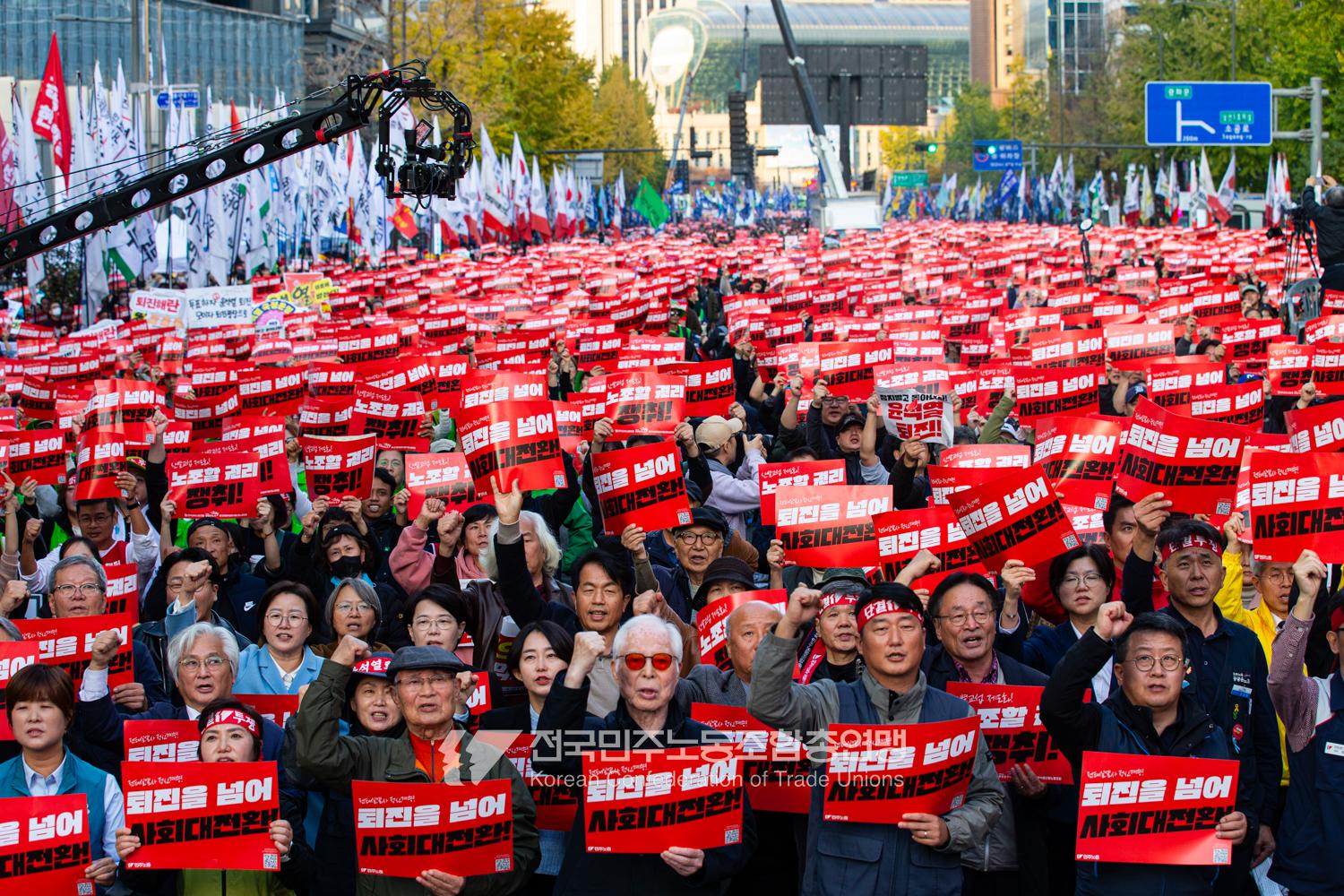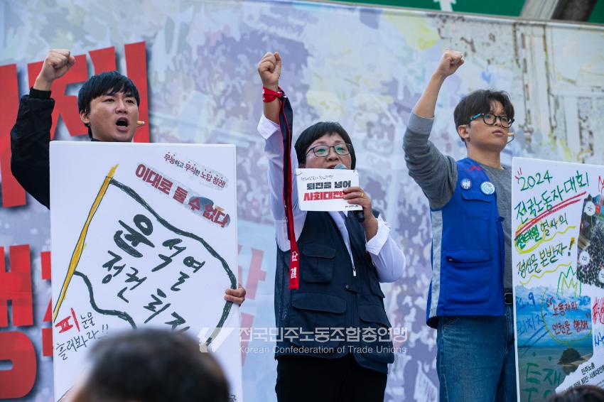 민주노총 10만여 조합원이 2024년 11월9일 서울 세종대로에 모여 윤석열정권 퇴진광장을 열기 위한 전태일열사 정신계승 2024 전국노동자대회를 열었다. 민주노총 16개 산별연맹이 도심 14곳에서 사전대회를 연 뒤 각기 다른 경로로 행진하며 본대회 장소로 모였다. 행진 과정에서 경찰의 과도한 도발과 폭력으로 인해 부상자 및 연행자가 다수 발생하기도 했다.