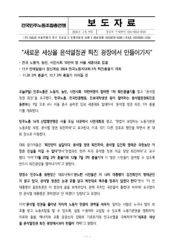 민주노총 10만여 조합원이 2024년 11월9일 서울 세종대로에 모여 윤석열정권 퇴진광장을 열기 위한 전태일열사 정신계승 2024 전국노동자대회를 열었다. 민주노총 16개 산별연맹이 도심 14곳에서 사전대회를 연 뒤 각기 다른 경로로 행진하며 본대회 장소로 모였다. 행진 과정에서 경찰의 과도한 도발과 폭력으로 인해 부상자 및 연행자가 다수 발생하기도 했다.