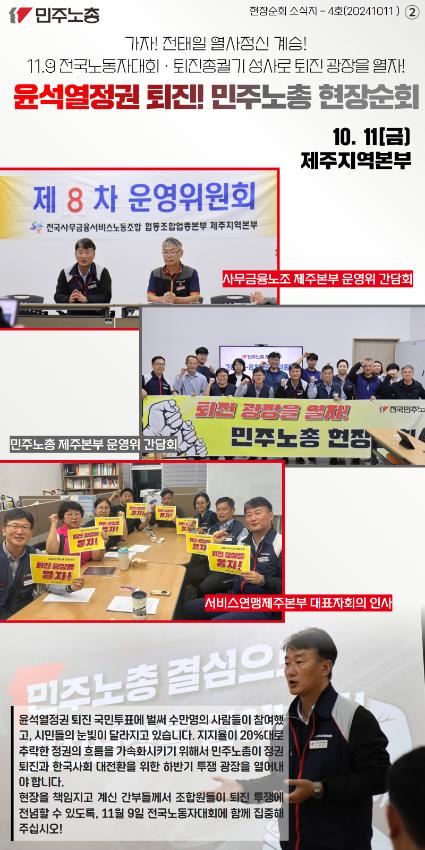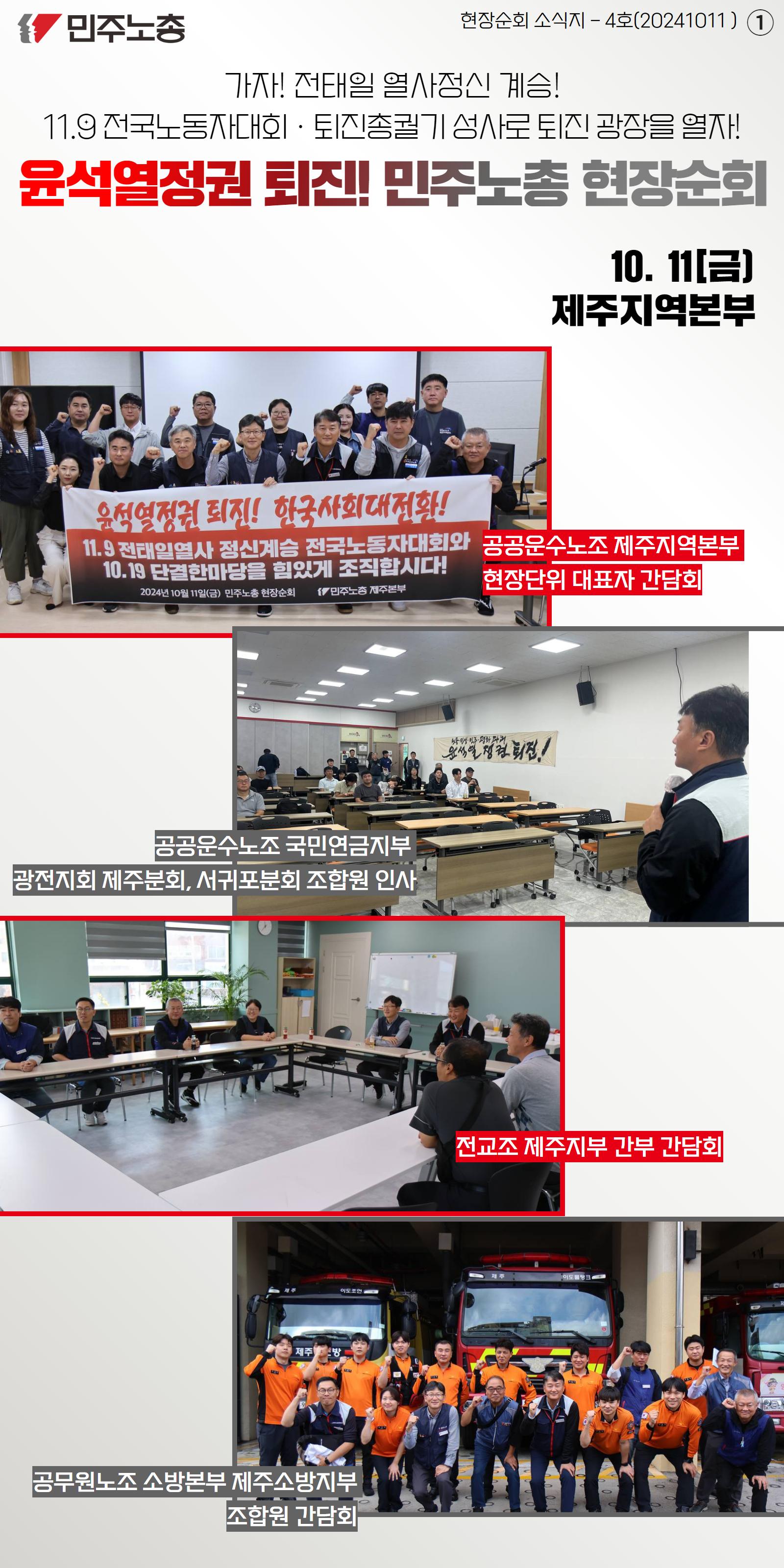 민주노총 10만여 조합원이 2024년 11월9일 서울 세종대로에 모여 윤석열정권 퇴진광장을 열기 위한 전태일열사 정신계승 2024 전국노동자대회를 열었다. 민주노총 16개 산별연맹이 도심 14곳에서 사전대회를 연 뒤 각기 다른 경로로 행진하며 본대회 장소로 모였다. 행진 과정에서 경찰의 과도한 도발과 폭력으로 인해 부상자 및 연행자가 다수 발생하기도 했다.