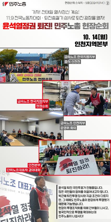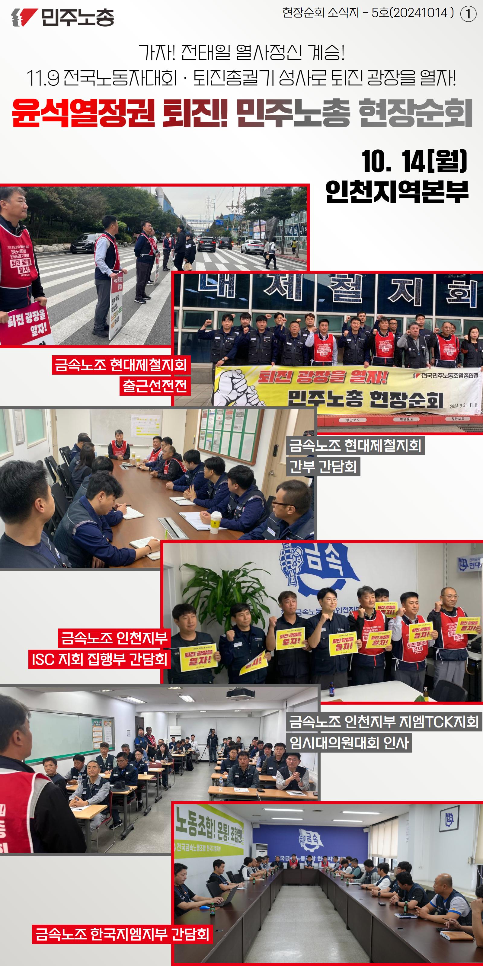 민주노총 10만여 조합원이 2024년 11월9일 서울 세종대로에 모여 윤석열정권 퇴진광장을 열기 위한 전태일열사 정신계승 2024 전국노동자대회를 열었다. 민주노총 16개 산별연맹이 도심 14곳에서 사전대회를 연 뒤 각기 다른 경로로 행진하며 본대회 장소로 모였다. 행진 과정에서 경찰의 과도한 도발과 폭력으로 인해 부상자 및 연행자가 다수 발생하기도 했다.