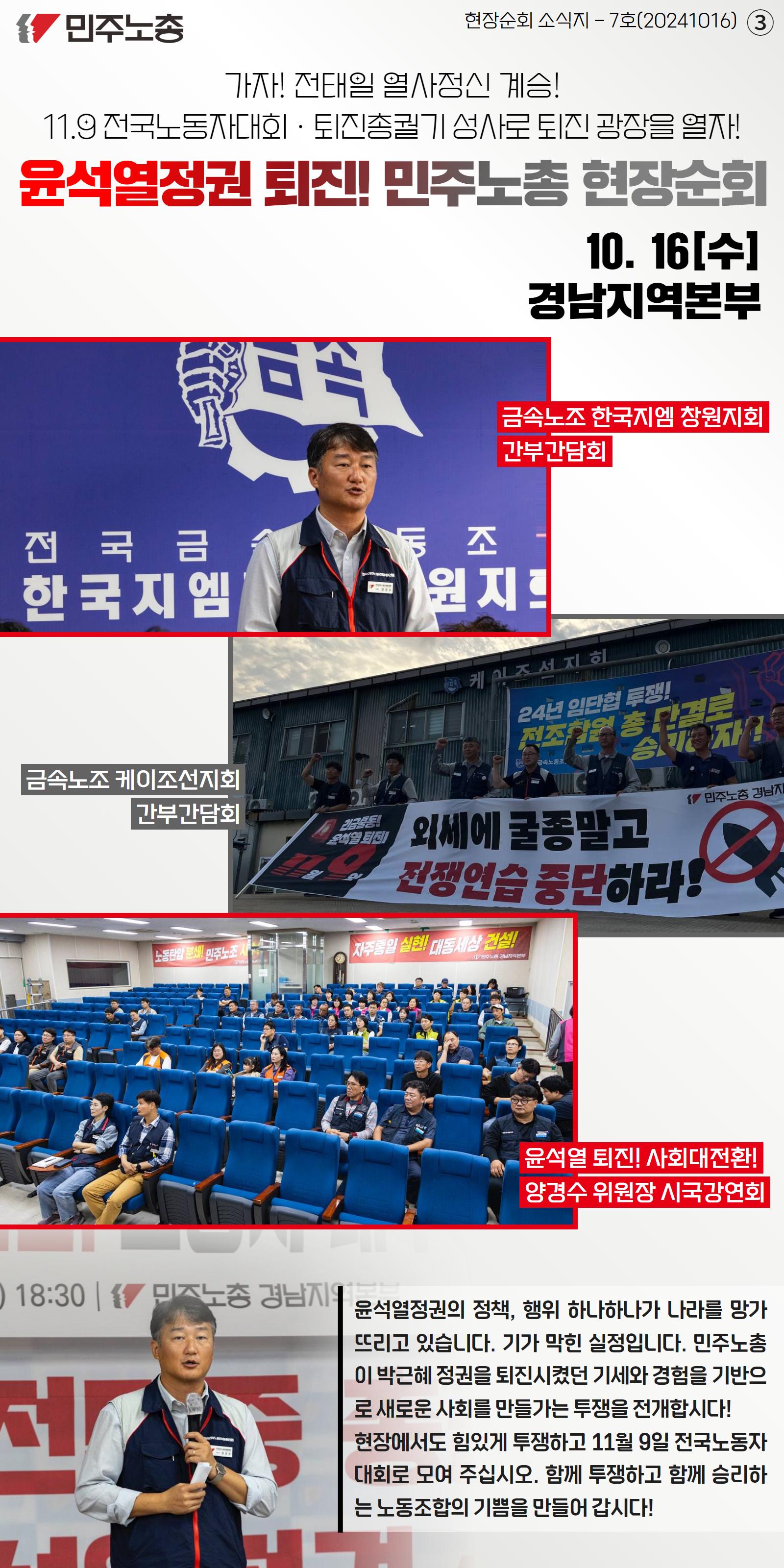 민주노총 10만여 조합원이 2024년 11월9일 서울 세종대로에 모여 윤석열정권 퇴진광장을 열기 위한 전태일열사 정신계승 2024 전국노동자대회를 열었다. 민주노총 16개 산별연맹이 도심 14곳에서 사전대회를 연 뒤 각기 다른 경로로 행진하며 본대회 장소로 모였다. 행진 과정에서 경찰의 과도한 도발과 폭력으로 인해 부상자 및 연행자가 다수 발생하기도 했다.