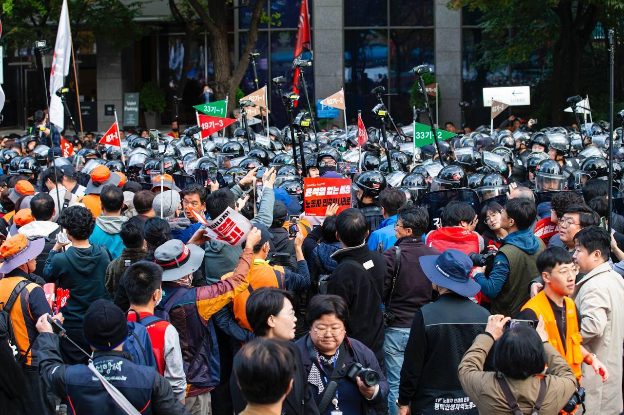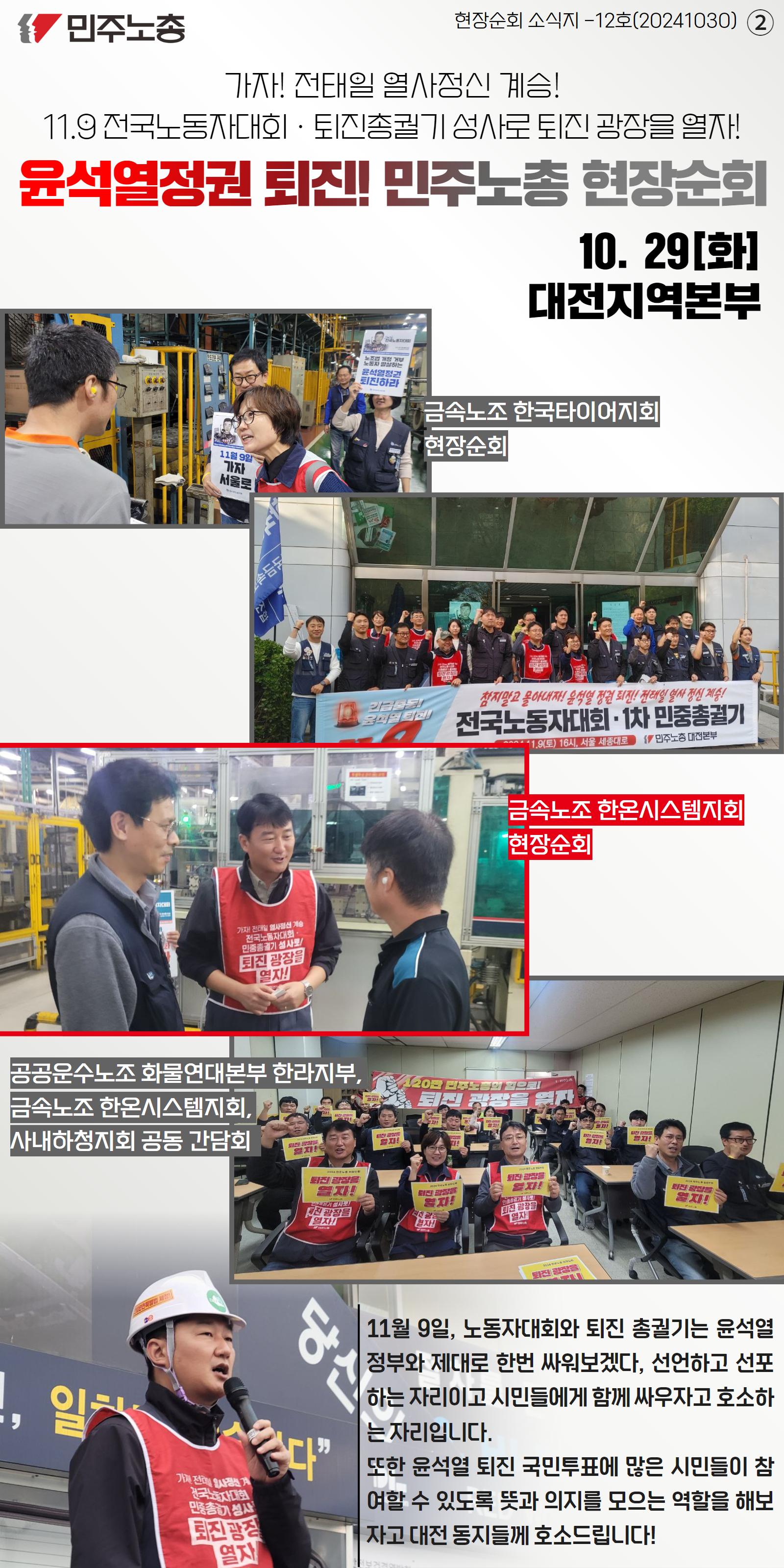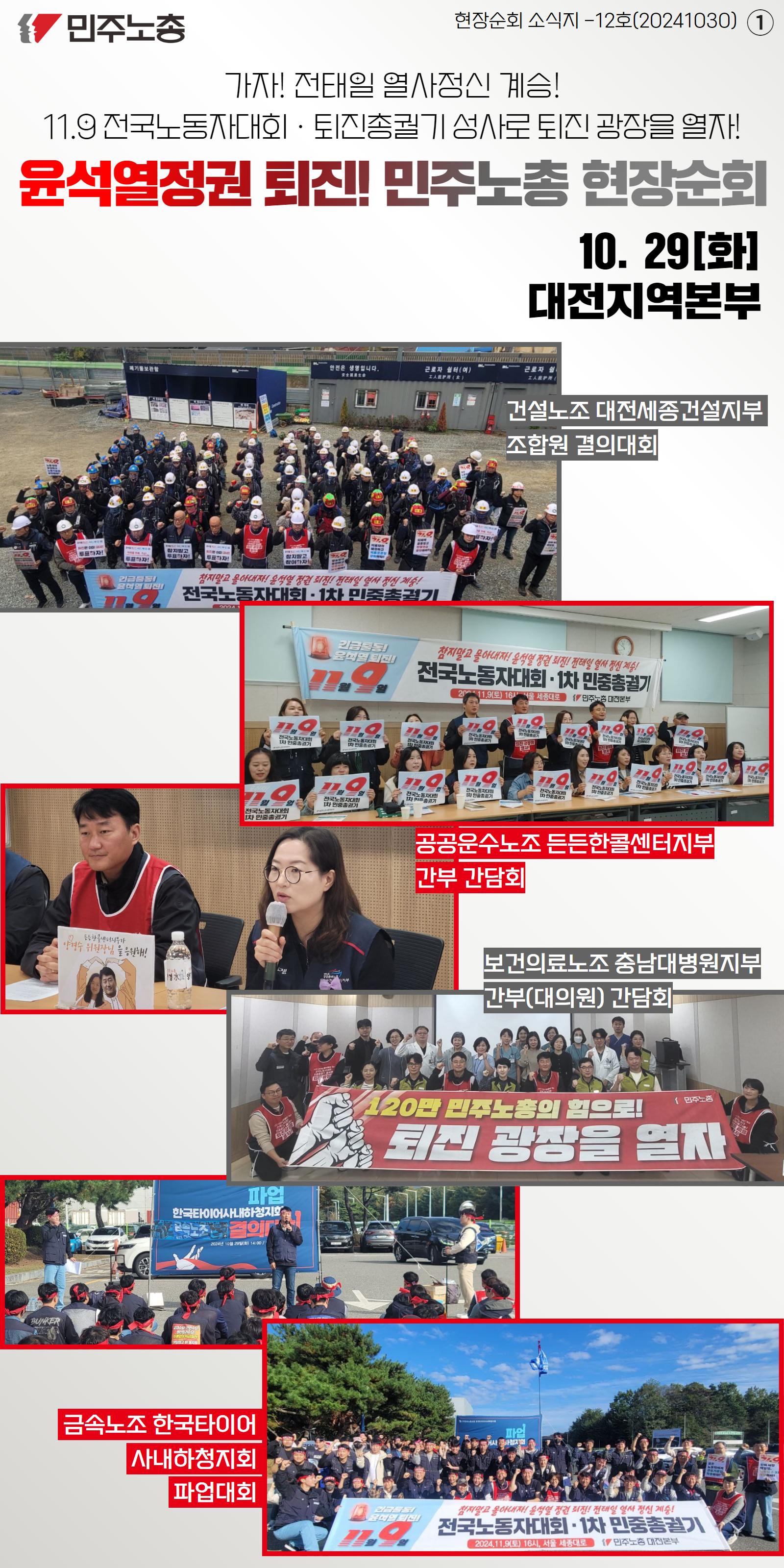 민주노총 10만여 조합원이 2024년 11월9일 서울 세종대로에 모여 윤석열정권 퇴진광장을 열기 위한 전태일열사 정신계승 2024 전국노동자대회를 열었다. 민주노총 16개 산별연맹이 도심 14곳에서 사전대회를 연 뒤 각기 다른 경로로 행진하며 본대회 장소로 모였다. 행진 과정에서 경찰의 과도한 도발과 폭력으로 인해 부상자 및 연행자가 다수 발생하기도 했다.