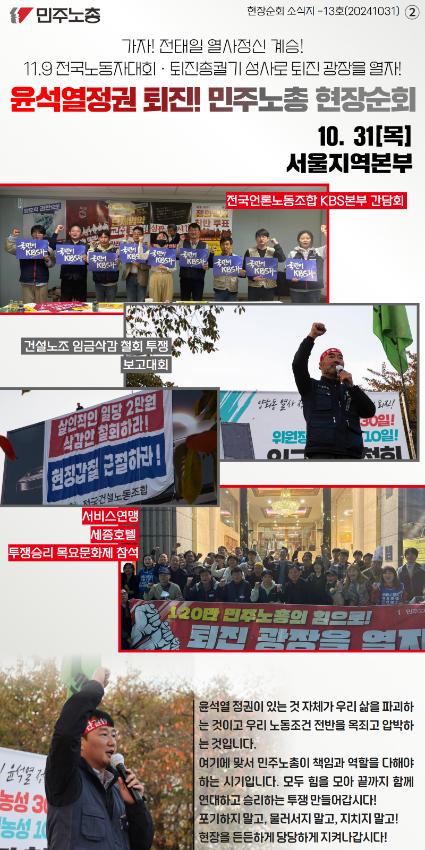 민주노총 10만여 조합원이 2024년 11월9일 서울 세종대로에 모여 윤석열정권 퇴진광장을 열기 위한 전태일열사 정신계승 2024 전국노동자대회를 열었다. 민주노총 16개 산별연맹이 도심 14곳에서 사전대회를 연 뒤 각기 다른 경로로 행진하며 본대회 장소로 모였다. 행진 과정에서 경찰의 과도한 도발과 폭력으로 인해 부상자 및 연행자가 다수 발생하기도 했다.