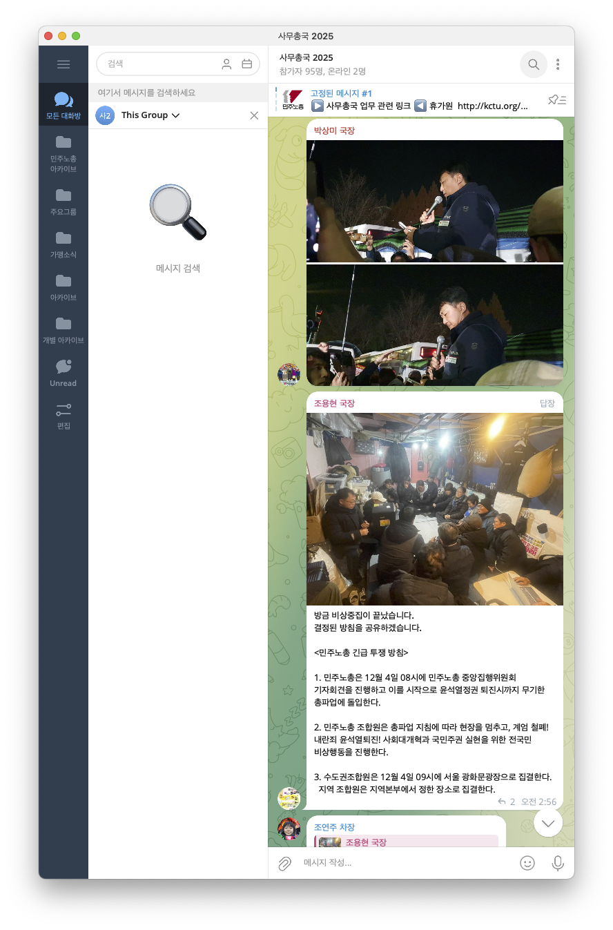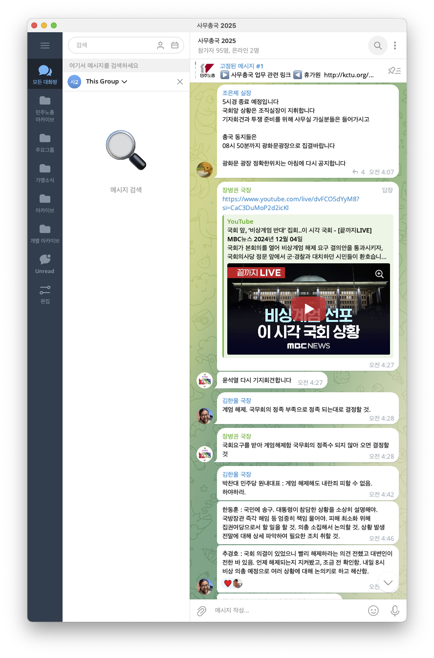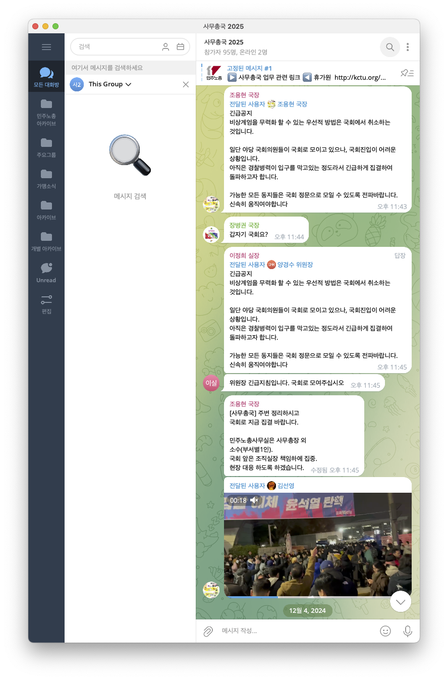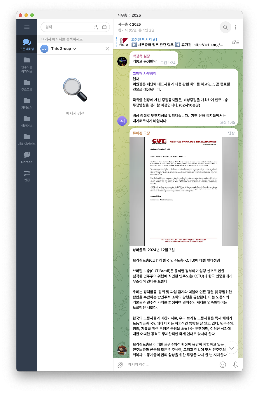 대통령 윤석열이 2024년 12월3일 밤 10시23분경 기습적으로 비상계엄을 선포했다. 1979년 10월26일 이래 45년 만에 선포된 비상계엄으로 사실상 친위쿠데타이자 내란이었다. 비상계엄이 선포된 직후 민주노총을 비롯한 시민들은 즉각 국회의사당 앞에 모여 국회를 사수하며 상황을 주시했고, 국회의원 190명이 본회의장에 모여 계엄 해제 요구를 의결했다. 민주노총은 12월4일 새벽 2시10분 국회 앞 금속노조 자동차판매연대지회 농성장에서 비상 중앙집행위원회를 열고 윤석열정권 퇴진 시까지 무기한 총파업 돌입과 전국민 비상행동을 진행한다는 지침을 정했다.