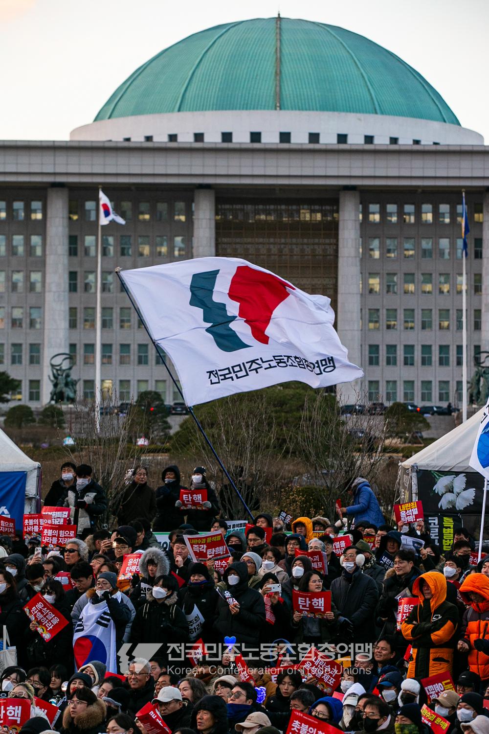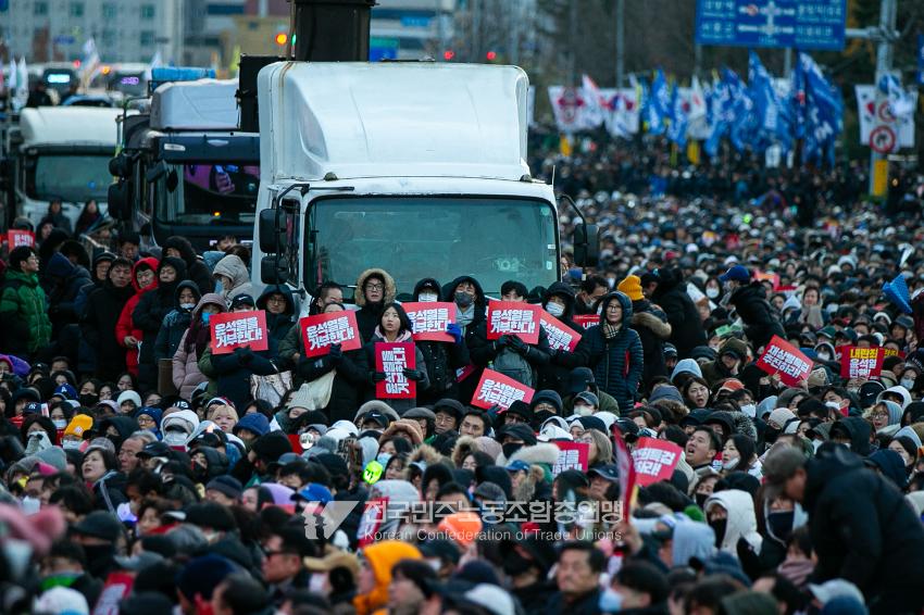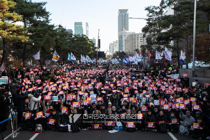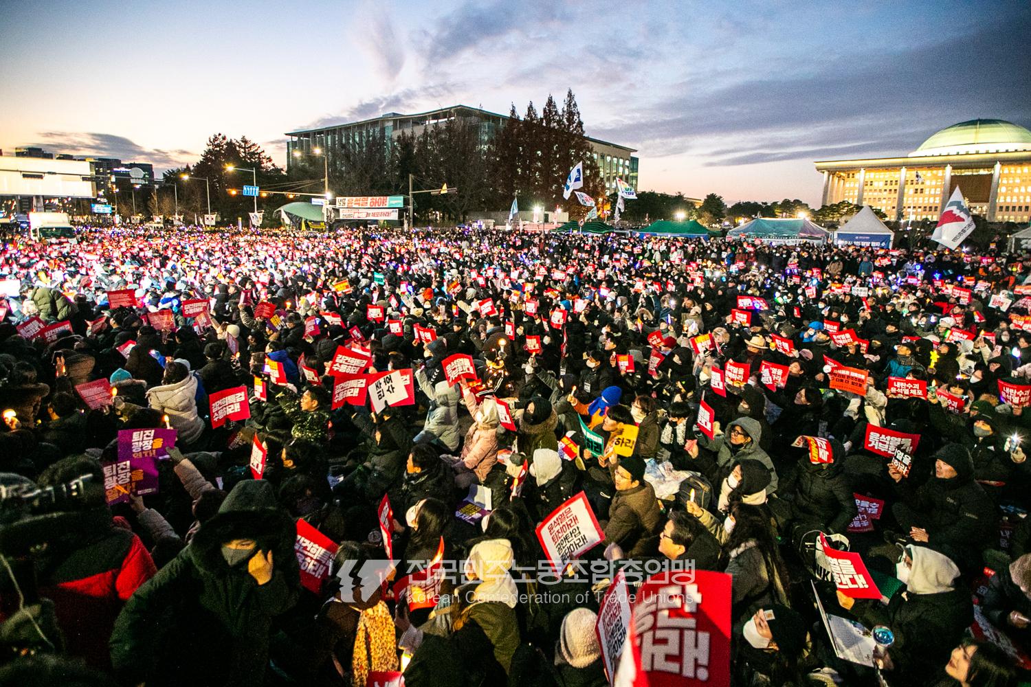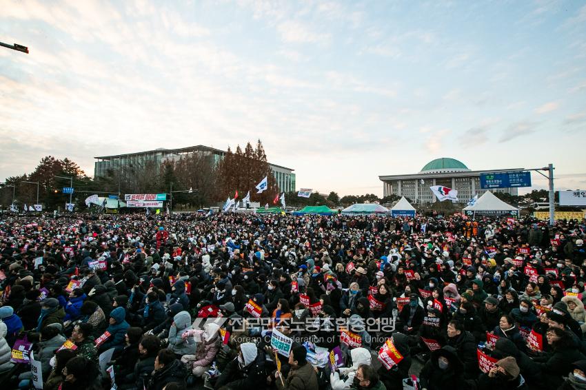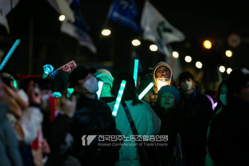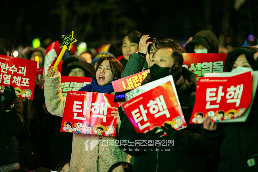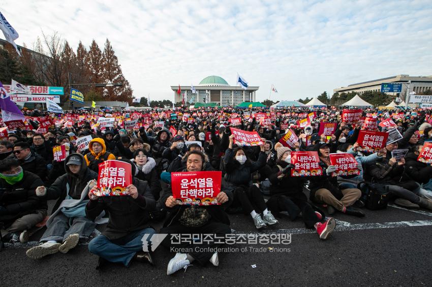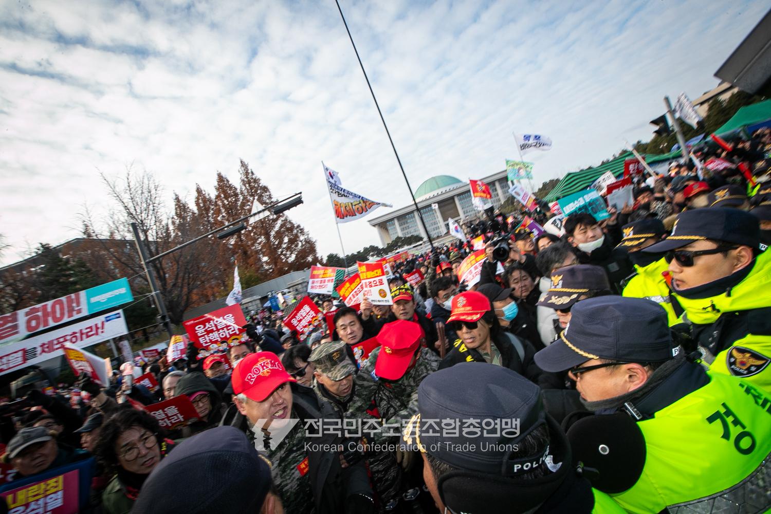 국민의힘이 윤석열의 12.3 비상계엄의 공범임이 확인됐다. 2024년 12월7일 100만 시민이 여의도 국회 앞에 모여 ‘내란죄 윤석열 퇴진! 국민주권 실현! 사회대개혁! 범국민촛불대행진’을 열고 국회 본회의 상황을 주시한 상황에서, 국민의힘은 끝내 탄핵소추안 표결에 참여하지 않았다. 국회 앞에 모인 시민들이 ‘투표해’를 외쳤지만 결국 우원식 국회의장은 오후 9시20분 탄핵소추안 폐기를 선언했다. 집회 시작을 앞둔 오후 1시경 100만 시민이 국회 앞에 모여 인산인해를 이루는데도 경찰이 폴리스 라인을 치고 더 넓은 공간을 내주지 않자 양경수 민주노총 위원장은 민주노총 조합원들을 일으켜 경찰을 뚫고 “길을 열 것”을 주문했다. ‘길을 여는 민주노총’의 시작이었다.
