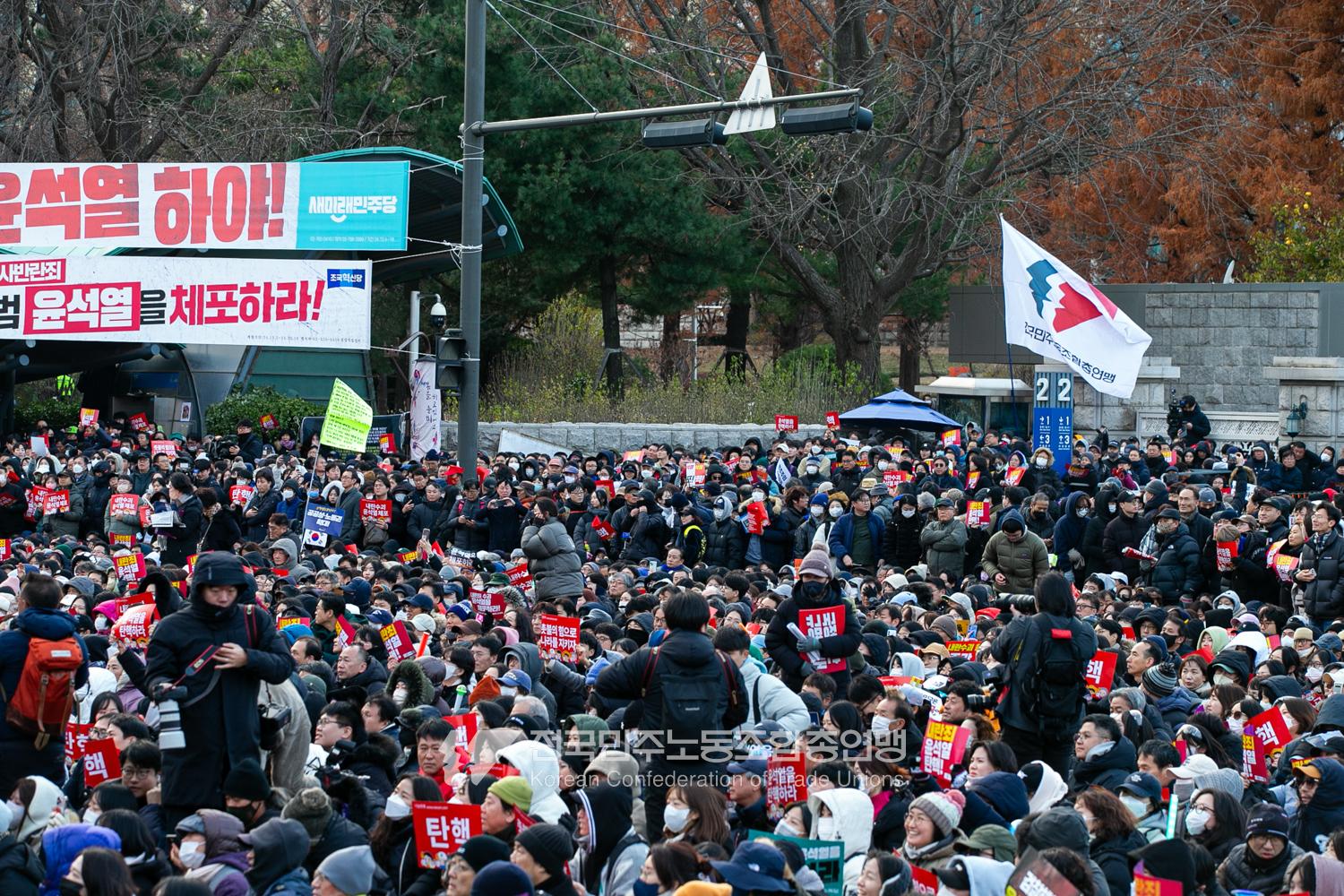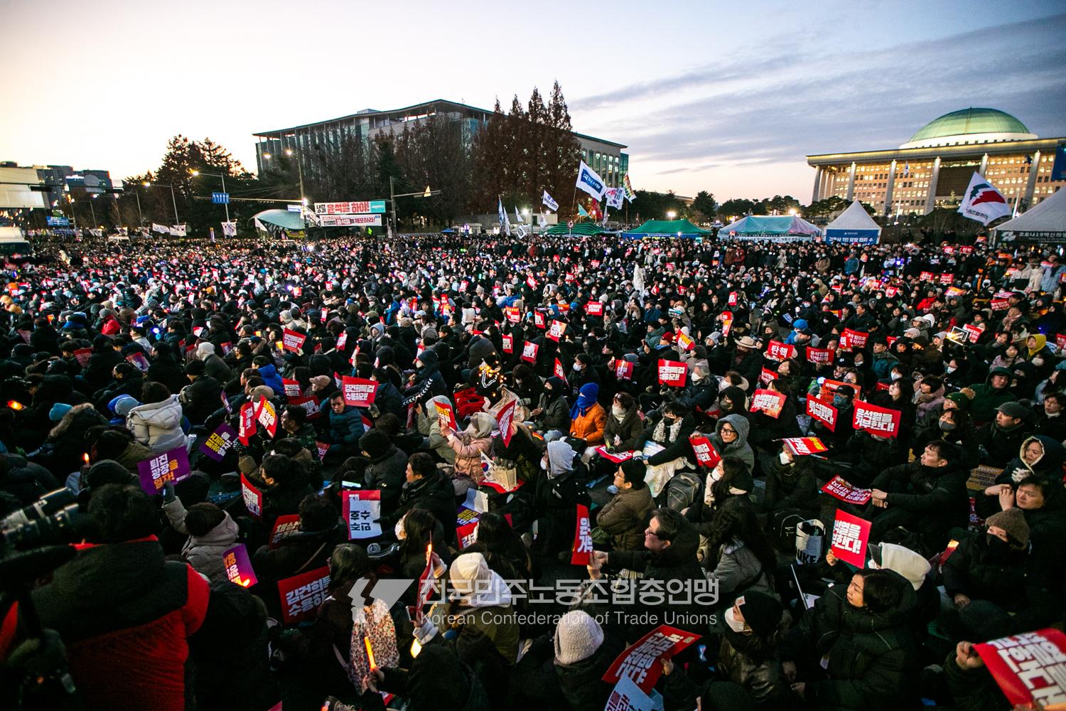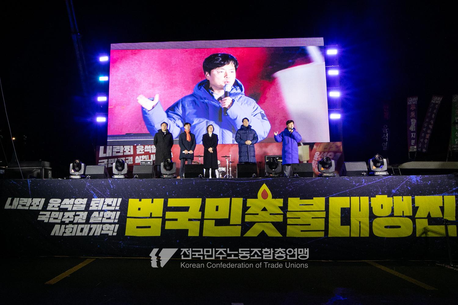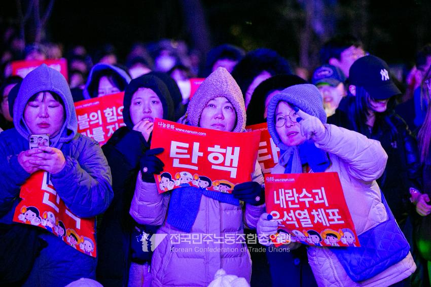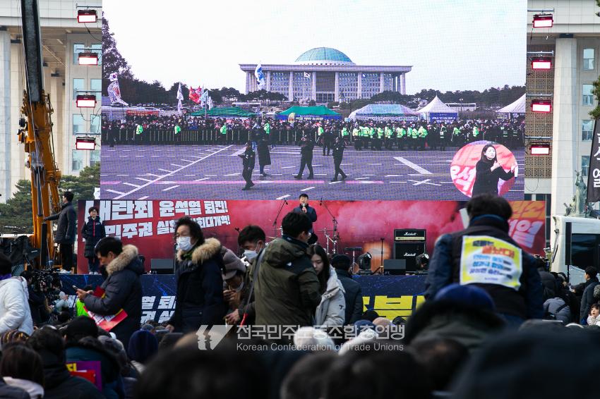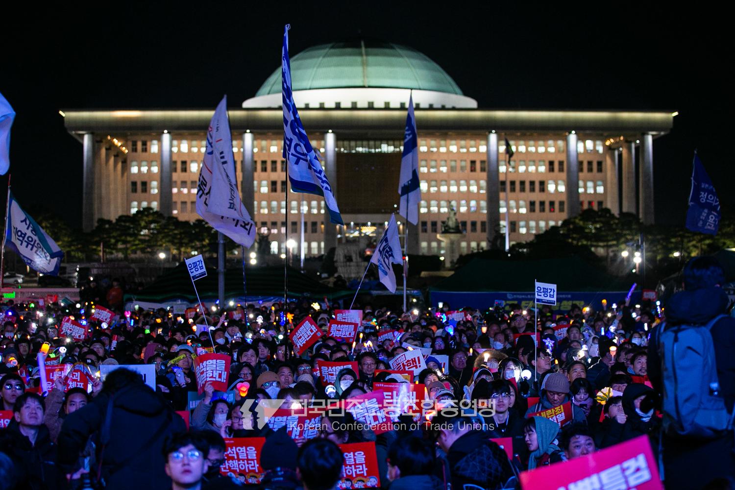 국민의힘이 윤석열의 12.3 비상계엄의 공범임이 확인됐다. 2024년 12월7일 100만 시민이 여의도 국회 앞에 모여 ‘내란죄 윤석열 퇴진! 국민주권 실현! 사회대개혁! 범국민촛불대행진’을 열고 국회 본회의 상황을 주시한 상황에서, 국민의힘은 끝내 탄핵소추안 표결에 참여하지 않았다. 국회 앞에 모인 시민들이 ‘투표해’를 외쳤지만 결국 우원식 국회의장은 오후 9시20분 탄핵소추안 폐기를 선언했다. 집회 시작을 앞둔 오후 1시경 100만 시민이 국회 앞에 모여 인산인해를 이루는데도 경찰이 폴리스 라인을 치고 더 넓은 공간을 내주지 않자 양경수 민주노총 위원장은 민주노총 조합원들을 일으켜 경찰을 뚫고 “길을 열 것”을 주문했다. ‘길을 여는 민주노총’의 시작이었다.