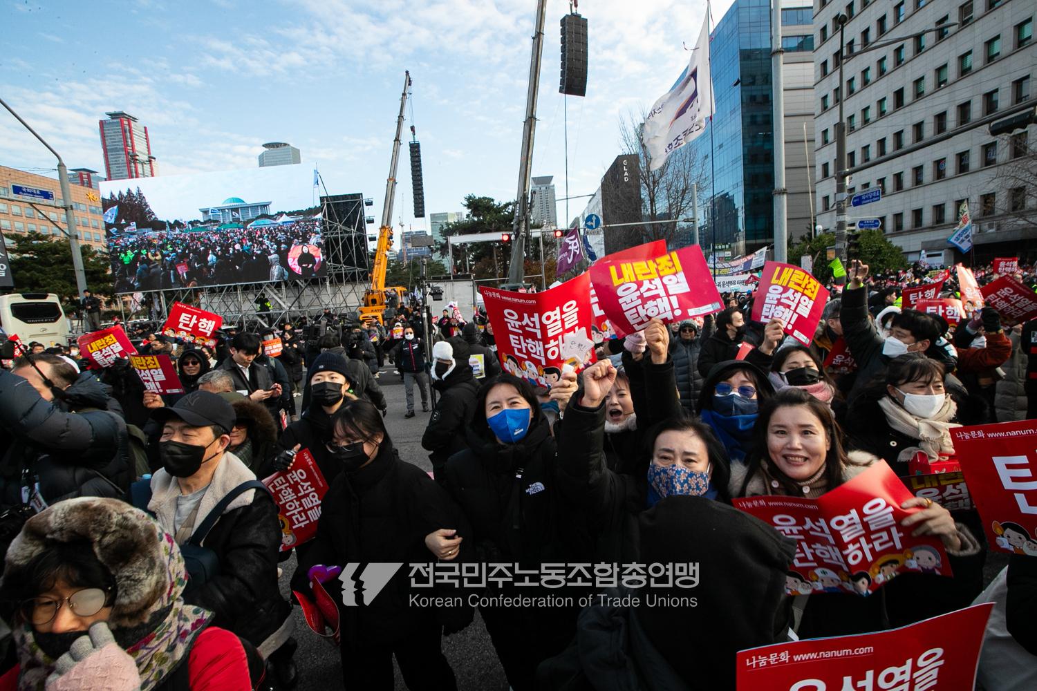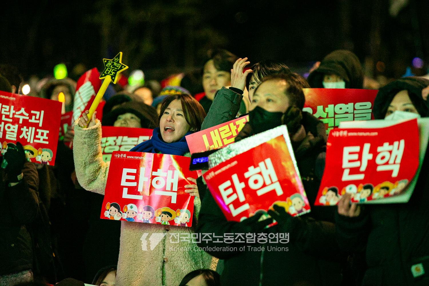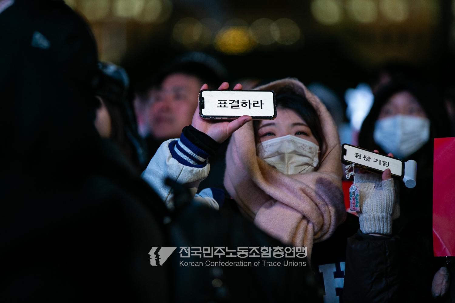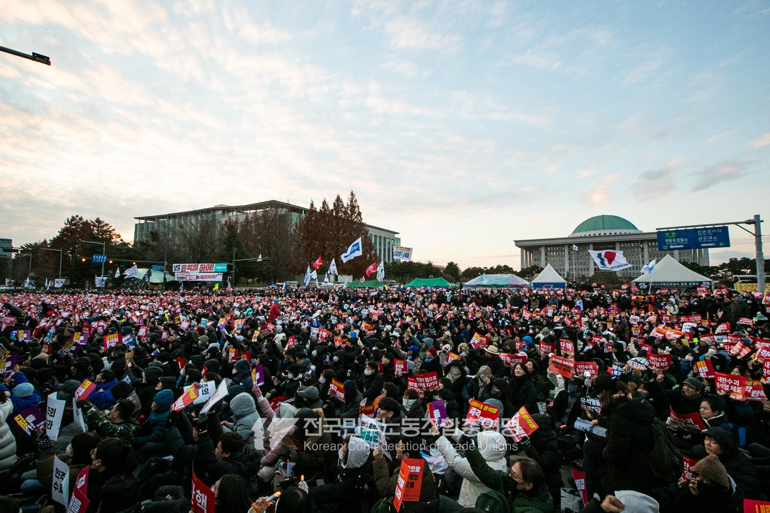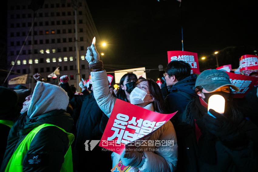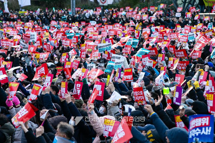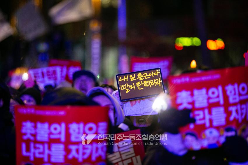 국민의힘이 윤석열의 12.3 비상계엄의 공범임이 확인됐다. 2024년 12월7일 100만 시민이 여의도 국회 앞에 모여 ‘내란죄 윤석열 퇴진! 국민주권 실현! 사회대개혁! 범국민촛불대행진’을 열고 국회 본회의 상황을 주시한 상황에서, 국민의힘은 끝내 탄핵소추안 표결에 참여하지 않았다. 국회 앞에 모인 시민들이 ‘투표해’를 외쳤지만 결국 우원식 국회의장은 오후 9시20분 탄핵소추안 폐기를 선언했다. 집회 시작을 앞둔 오후 1시경 100만 시민이 국회 앞에 모여 인산인해를 이루는데도 경찰이 폴리스 라인을 치고 더 넓은 공간을 내주지 않자 양경수 민주노총 위원장은 민주노총 조합원들을 일으켜 경찰을 뚫고 “길을 열 것”을 주문했다. ‘길을 여는 민주노총’의 시작이었다.