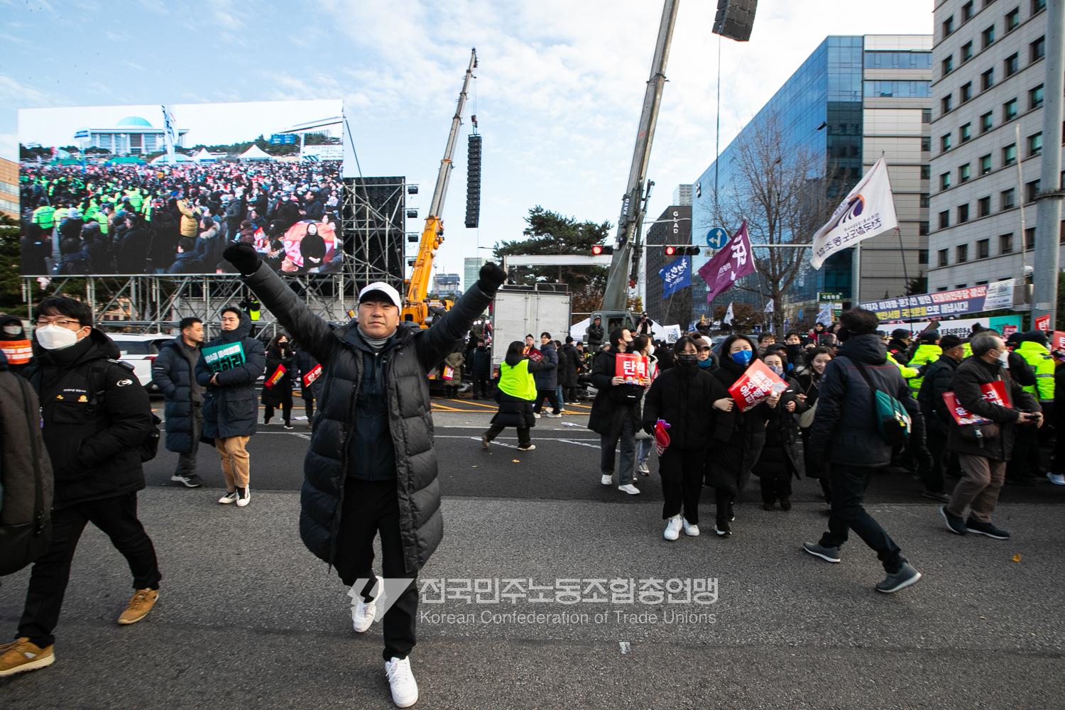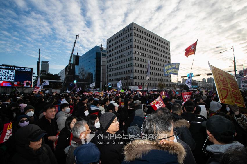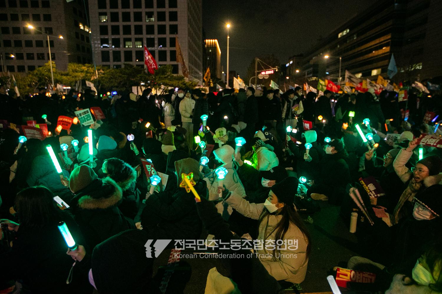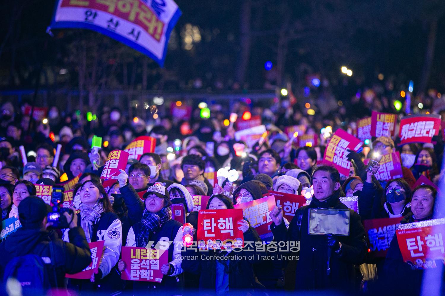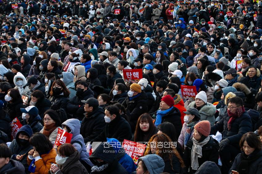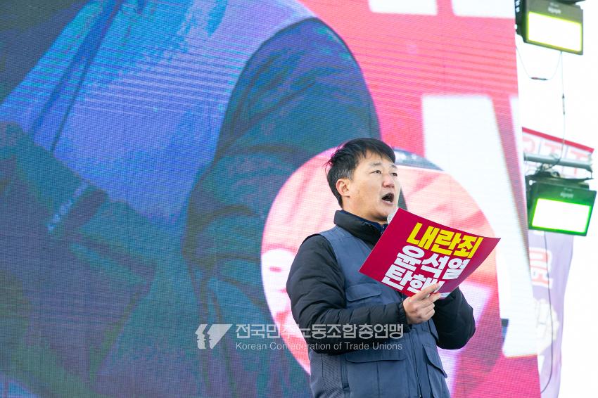 국민의힘이 윤석열의 12.3 비상계엄의 공범임이 확인됐다. 2024년 12월7일 100만 시민이 여의도 국회 앞에 모여 ‘내란죄 윤석열 퇴진! 국민주권 실현! 사회대개혁! 범국민촛불대행진’을 열고 국회 본회의 상황을 주시한 상황에서, 국민의힘은 끝내 탄핵소추안 표결에 참여하지 않았다. 국회 앞에 모인 시민들이 ‘투표해’를 외쳤지만 결국 우원식 국회의장은 오후 9시20분 탄핵소추안 폐기를 선언했다. 집회 시작을 앞둔 오후 1시경 100만 시민이 국회 앞에 모여 인산인해를 이루는데도 경찰이 폴리스 라인을 치고 더 넓은 공간을 내주지 않자 양경수 민주노총 위원장은 민주노총 조합원들을 일으켜 경찰을 뚫고 “길을 열 것”을 주문했다. ‘길을 여는 민주노총’의 시작이었다.