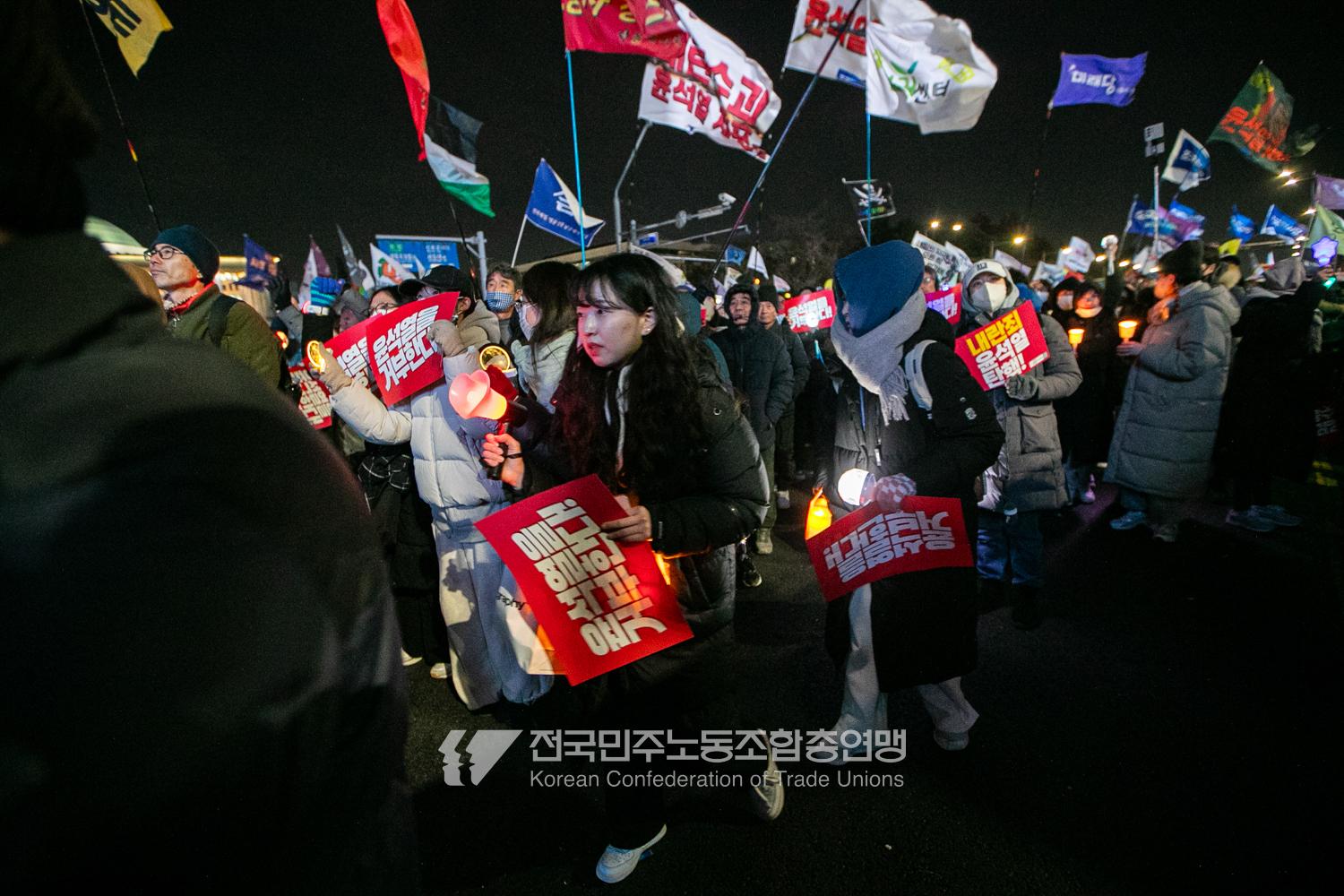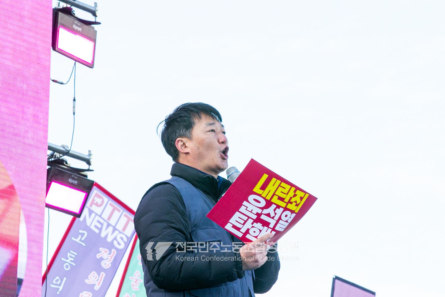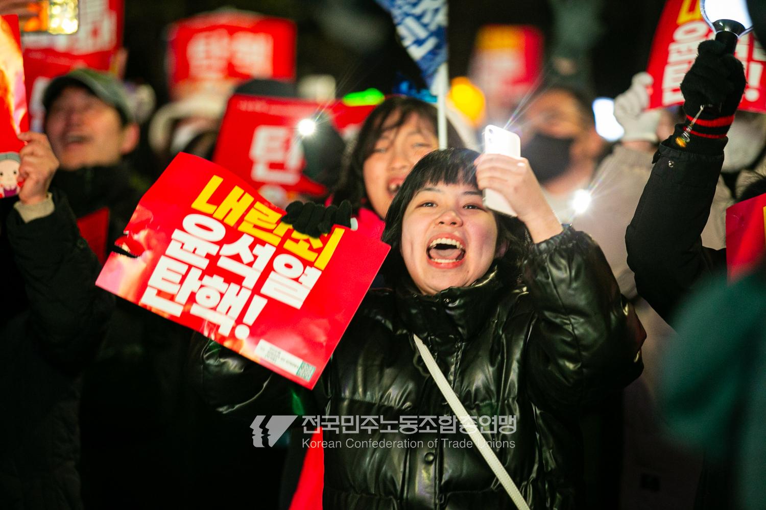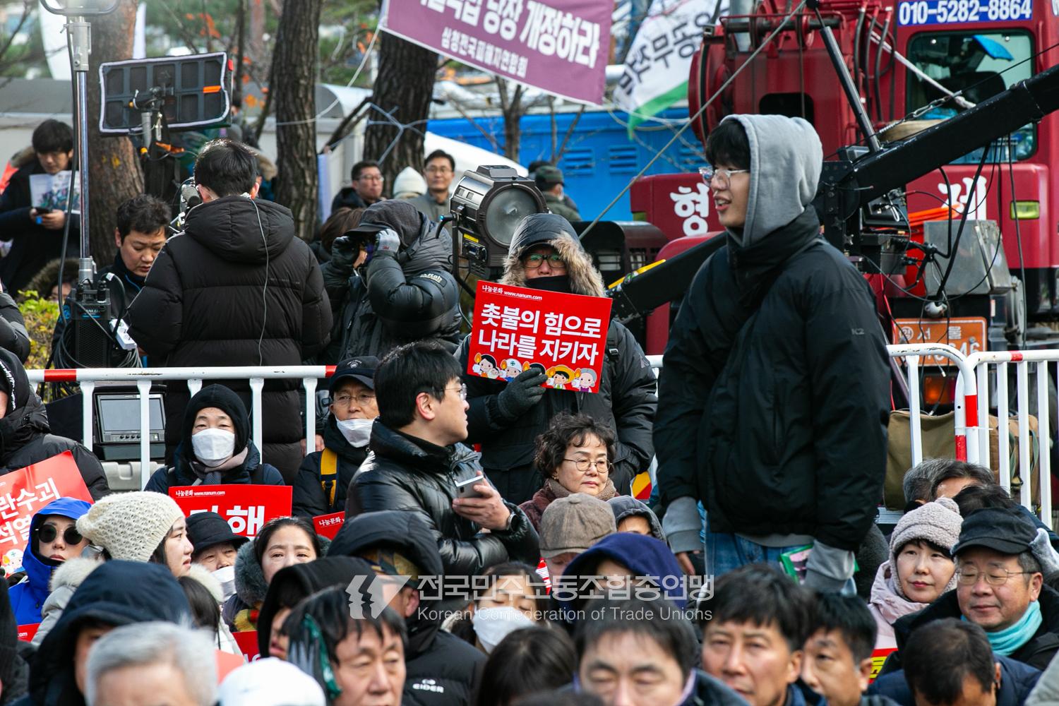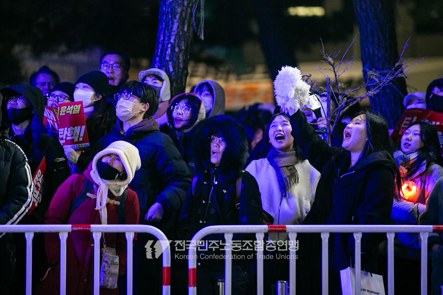 국민의힘이 윤석열의 12.3 비상계엄의 공범임이 확인됐다. 2024년 12월7일 100만 시민이 여의도 국회 앞에 모여 ‘내란죄 윤석열 퇴진! 국민주권 실현! 사회대개혁! 범국민촛불대행진’을 열고 국회 본회의 상황을 주시한 상황에서, 국민의힘은 끝내 탄핵소추안 표결에 참여하지 않았다. 국회 앞에 모인 시민들이 ‘투표해’를 외쳤지만 결국 우원식 국회의장은 오후 9시20분 탄핵소추안 폐기를 선언했다. 집회 시작을 앞둔 오후 1시경 100만 시민이 국회 앞에 모여 인산인해를 이루는데도 경찰이 폴리스 라인을 치고 더 넓은 공간을 내주지 않자 양경수 민주노총 위원장은 민주노총 조합원들을 일으켜 경찰을 뚫고 “길을 열 것”을 주문했다. ‘길을 여는 민주노총’의 시작이었다.