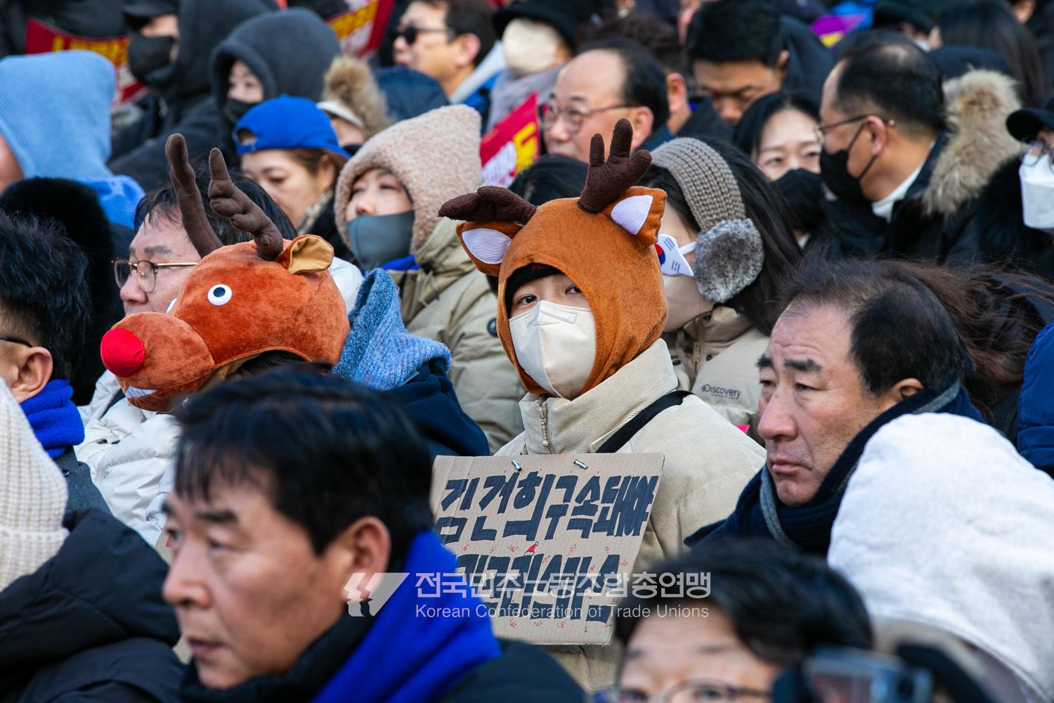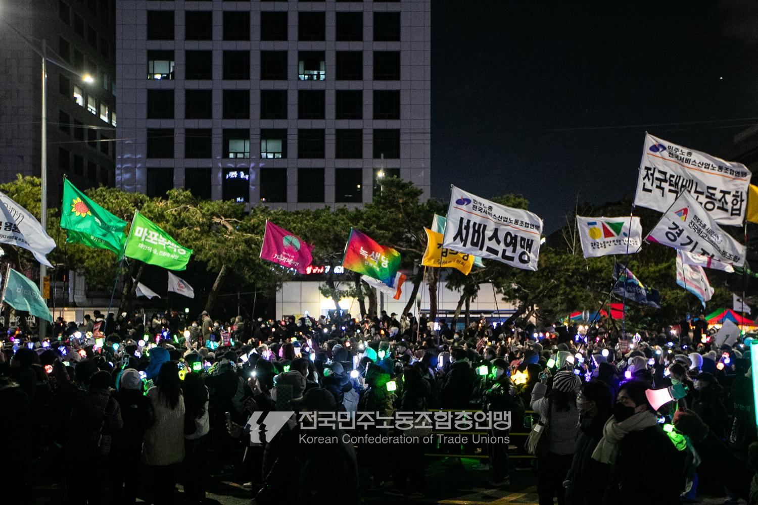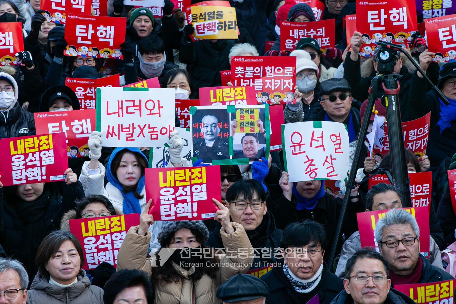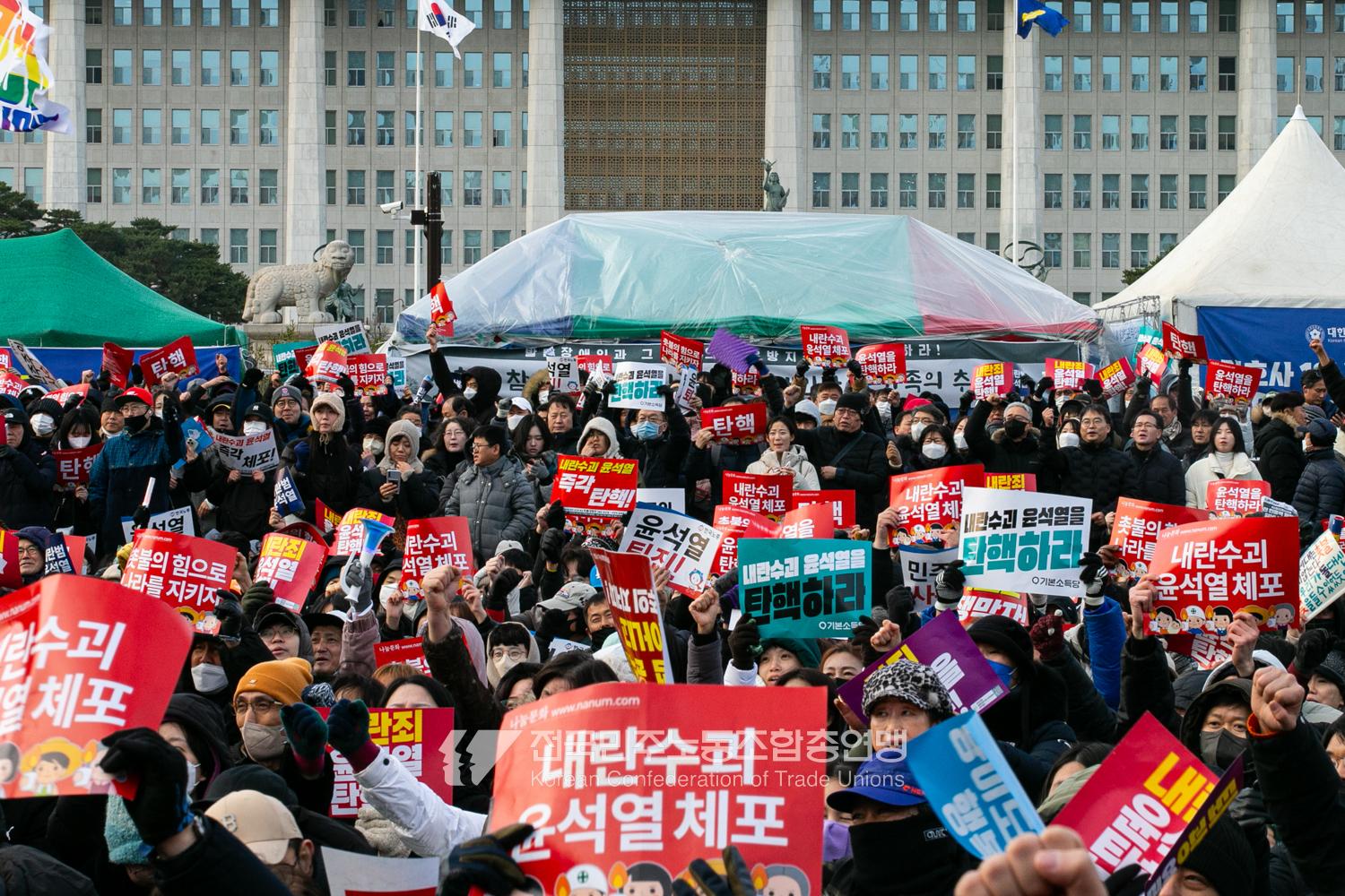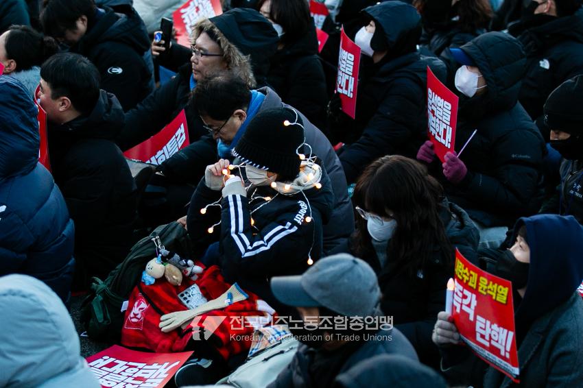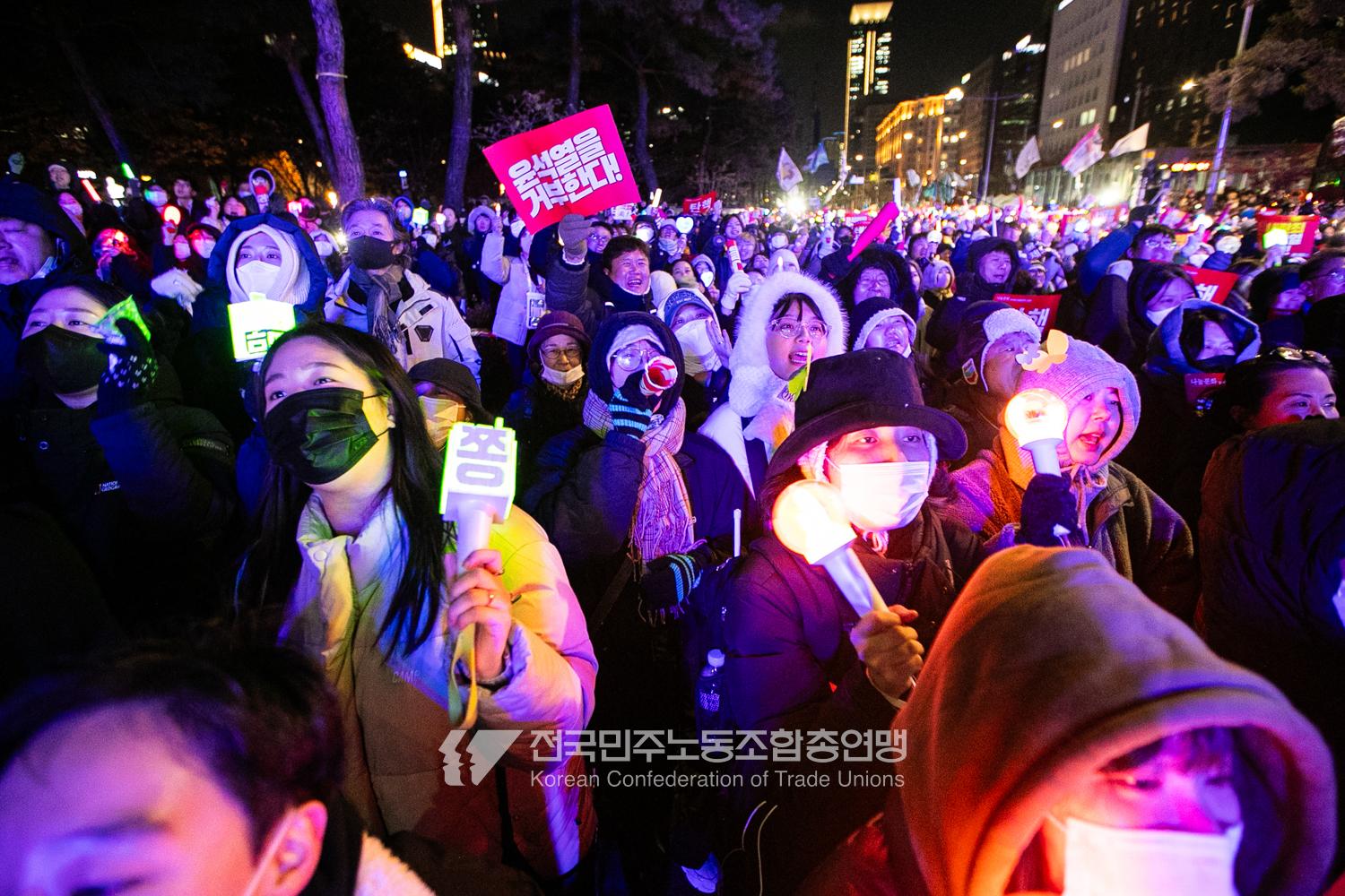 국민의힘이 윤석열의 12.3 비상계엄의 공범임이 확인됐다. 2024년 12월7일 100만 시민이 여의도 국회 앞에 모여 ‘내란죄 윤석열 퇴진! 국민주권 실현! 사회대개혁! 범국민촛불대행진’을 열고 국회 본회의 상황을 주시한 상황에서, 국민의힘은 끝내 탄핵소추안 표결에 참여하지 않았다. 국회 앞에 모인 시민들이 ‘투표해’를 외쳤지만 결국 우원식 국회의장은 오후 9시20분 탄핵소추안 폐기를 선언했다. 집회 시작을 앞둔 오후 1시경 100만 시민이 국회 앞에 모여 인산인해를 이루는데도 경찰이 폴리스 라인을 치고 더 넓은 공간을 내주지 않자 양경수 민주노총 위원장은 민주노총 조합원들을 일으켜 경찰을 뚫고 “길을 열 것”을 주문했다. ‘길을 여는 민주노총’의 시작이었다.