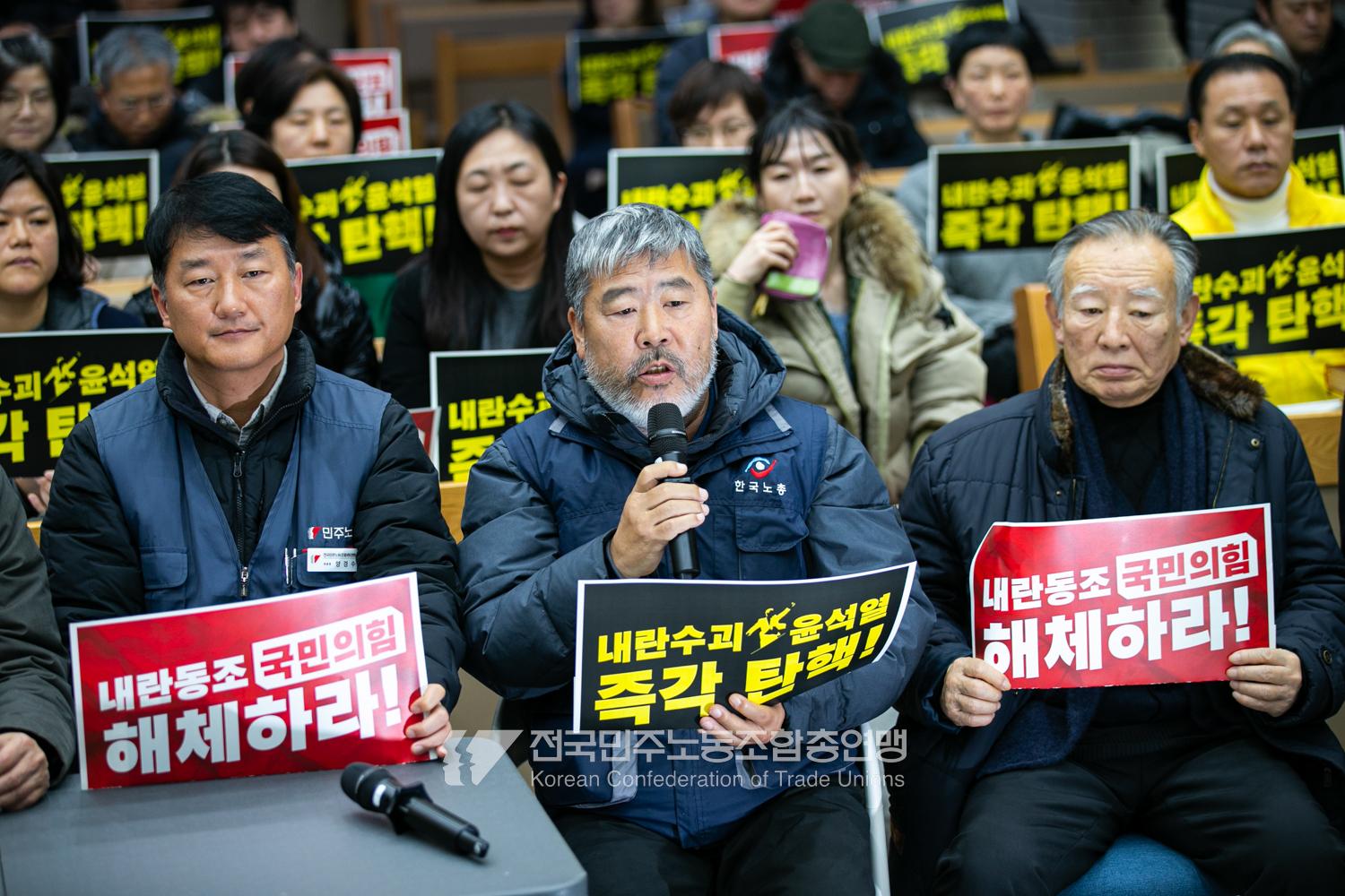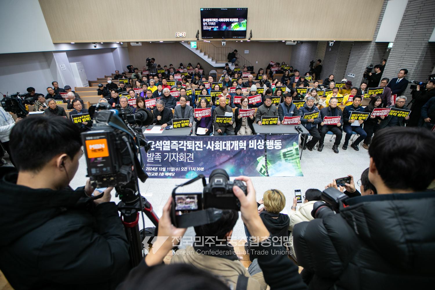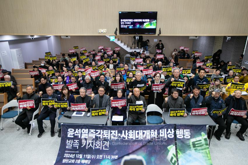 민주노총을 비롯한 전국의 1,700여 노동시민사회단체가 모여 ‘윤석열즉각퇴진・사회대개혁 비상행동’을 발족했다. 2024년 12월11일 오전 서울 향린교회 2층 예배당에 모인 이들은 회의를 거쳐 “윤석열 퇴진뿐 아니라 한국사회를 근본적으로 변화시킬 논의도 할 것”이라고 밝혔다. 비상행동의 활동목표와 방향은 △내란수괴 윤석열 즉각 퇴진 (탄핵 체포 구금) △내란동조 국민의힘 해체 △내란 동조자 처벌 △국민주권 실현 및 한국사회대개혁 등이다.