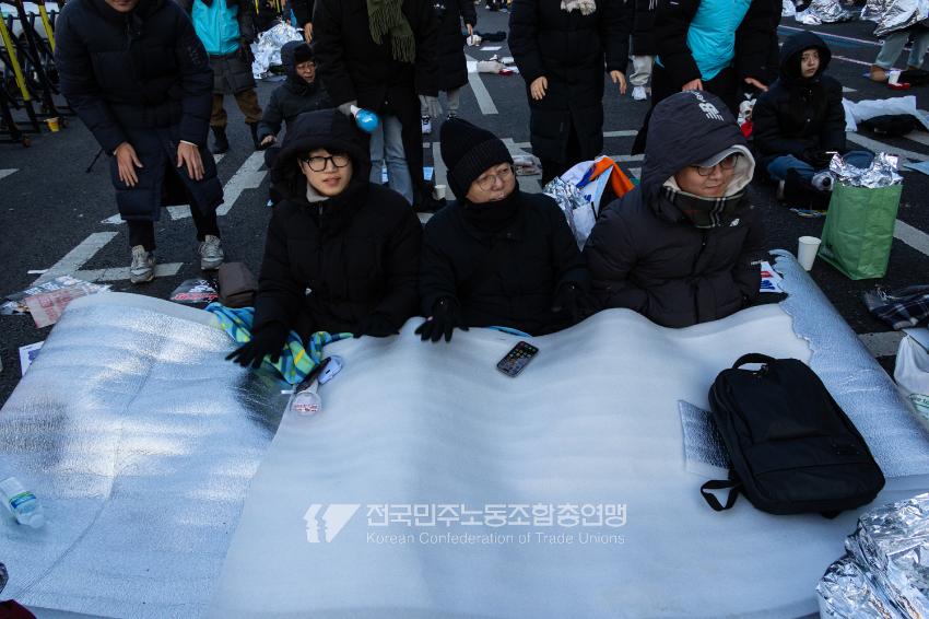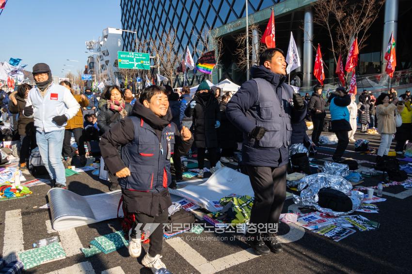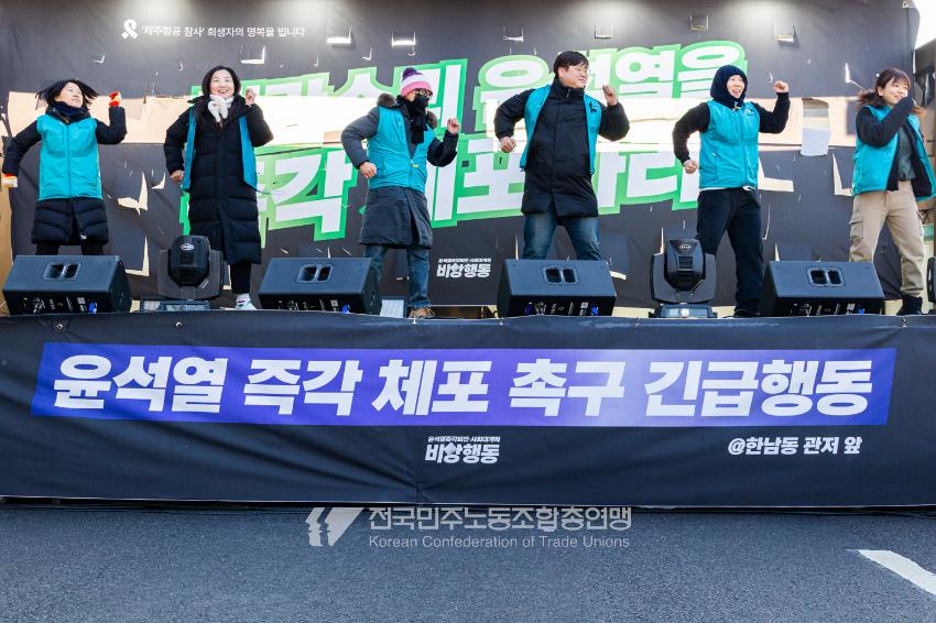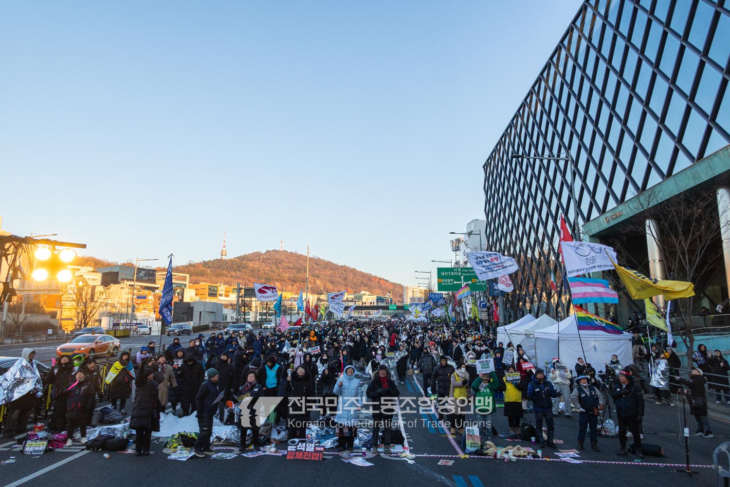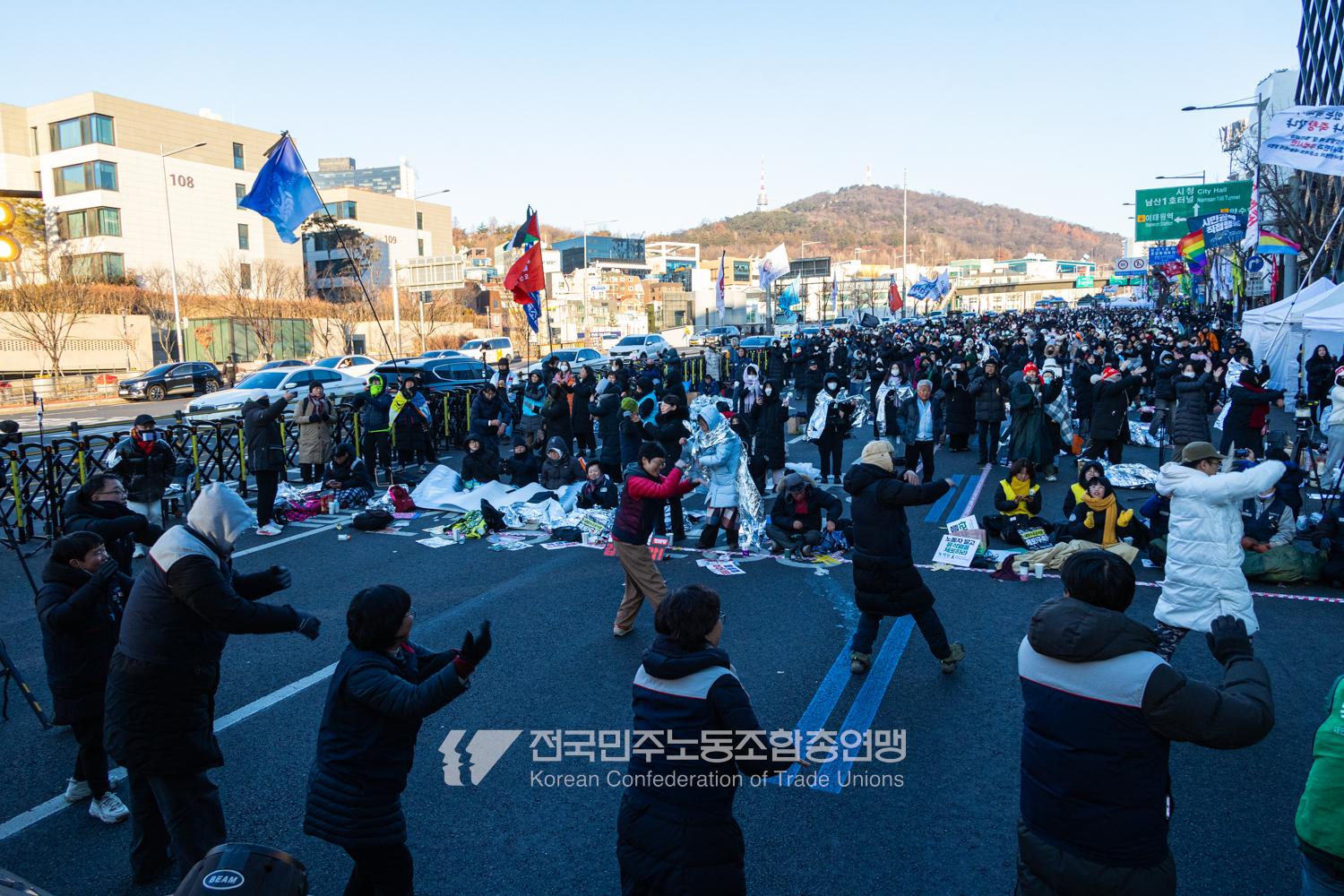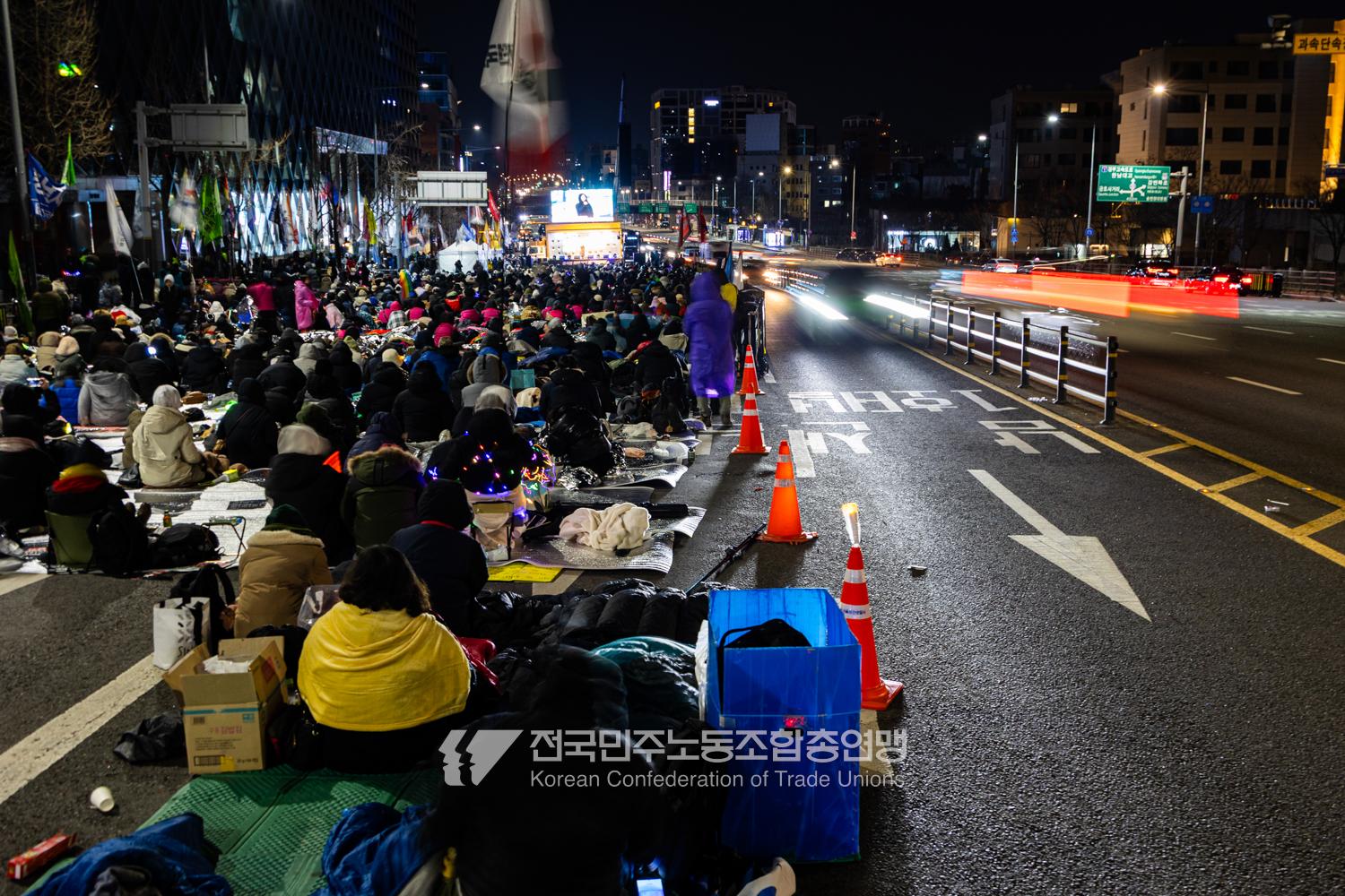 공수처가 윤석열 체포에 실패하고 돌아선 상황에서 민주노총은 치열한 체포・구속 투쟁에 돌입했다. “식민지배 철폐에 나섰던 독립군의 심정으로, 독재 멈추기에 나섰던 시민군의 심정”으로 투쟁을 결의하고 집회신고가 된 한남대로에 눌러 앉았다. SNS에서 소식을 들은 시민들이 ‘남태령 대첩을 이어가겠다’ ‘남태령에서 진 빚을 갚겠다’라며 한남대로에 모여들었다. 또 전국 각지에서 민주노총과 시민들을 후원하기 위한 각종 음식과 물품이 한남대로에 도착했다.