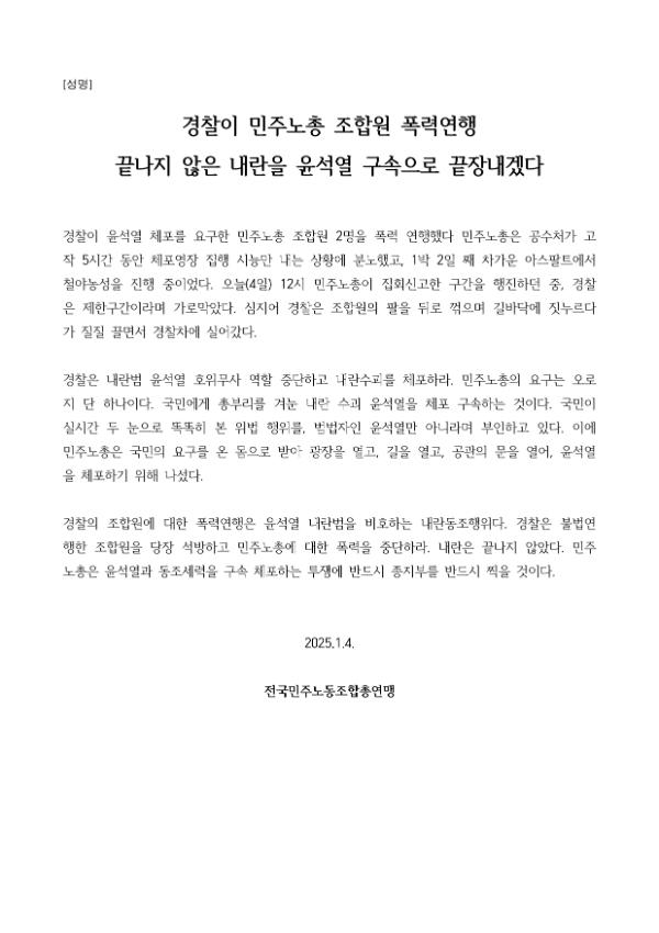 경찰과 공수처는 하루 전날, 대통령 경호처의 저항에 부딪혀 윤석열을 체포하지 못했다. 경호처 인원이 500여 명이었음에도 경찰과 공수처는 달랑 150명을 동원해 관저를 찾았던 것으로 알려졌다. 민주노총은 “윤석열을 즉각 체포하고 구속하라”고 외치며 대통령 관저 방향으로 길을 열기 위한 행진을 진행했다. 이 과정에서 경찰은 민주노총 조합원 2명(금속노조, 서비스연맹)을 폭력적으로 연행했다. 더욱이 연행된 조합원 중 한 명이 경찰 무전기를 빼앗아 머리를 가격해 경찰이 뇌사상태에 빠졌다는 근거 없는 헛소문이 돌았다. 극우세력과 경찰은 이날도 악의적으로 민주노총 집회를 폄하하기 위해 가짜뉴스를 퍼트렸다. 경찰은 은평경찰서에 수감된 두 조합원 석방을 촉구하며 은평시민들이 자발적인 은평경찰서 항의투쟁을 벌이자 이에 기겁한 듯 두 조합원을 마포경찰서로 이송수감, 조사했다. 이번에도 민주노총의 부름에 시민들이 응답했다.