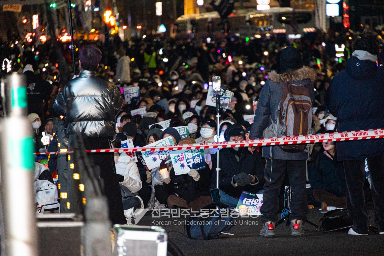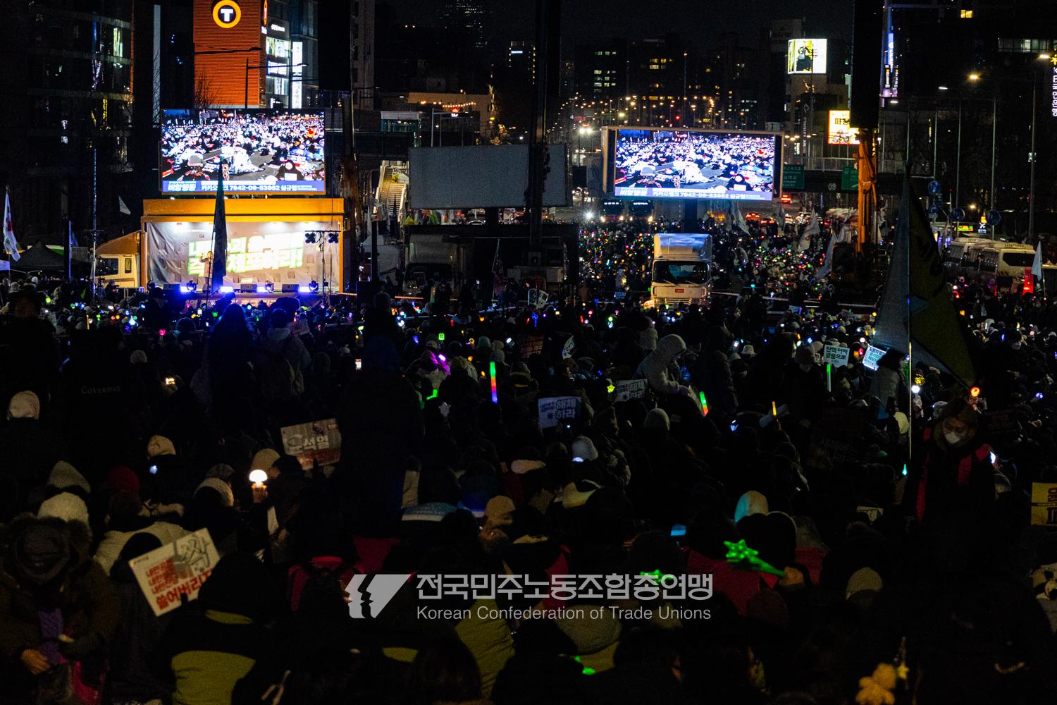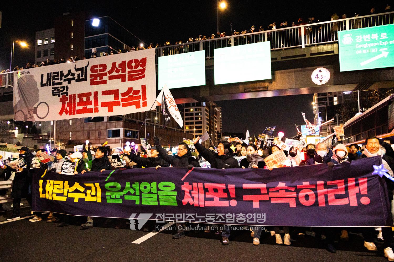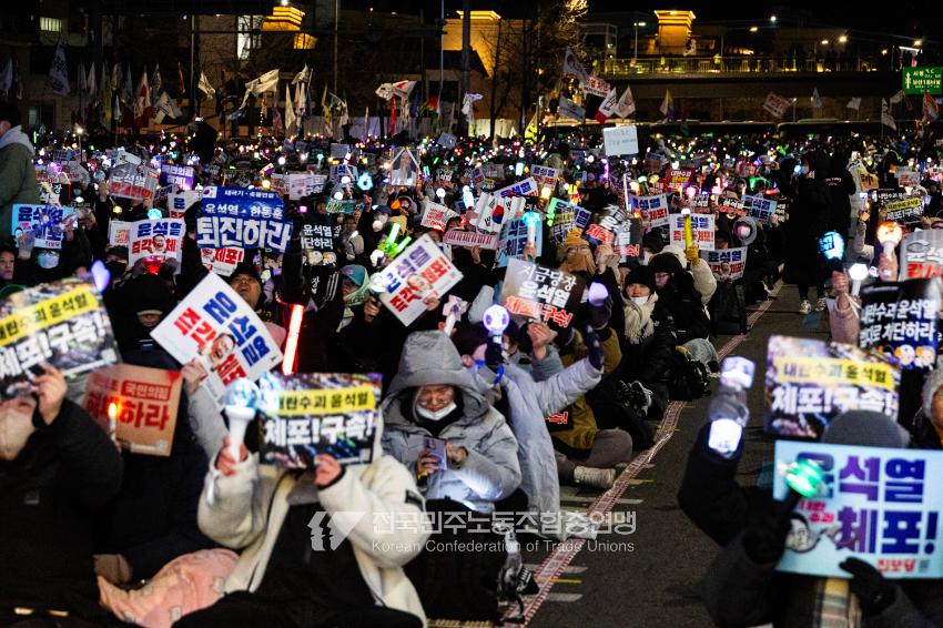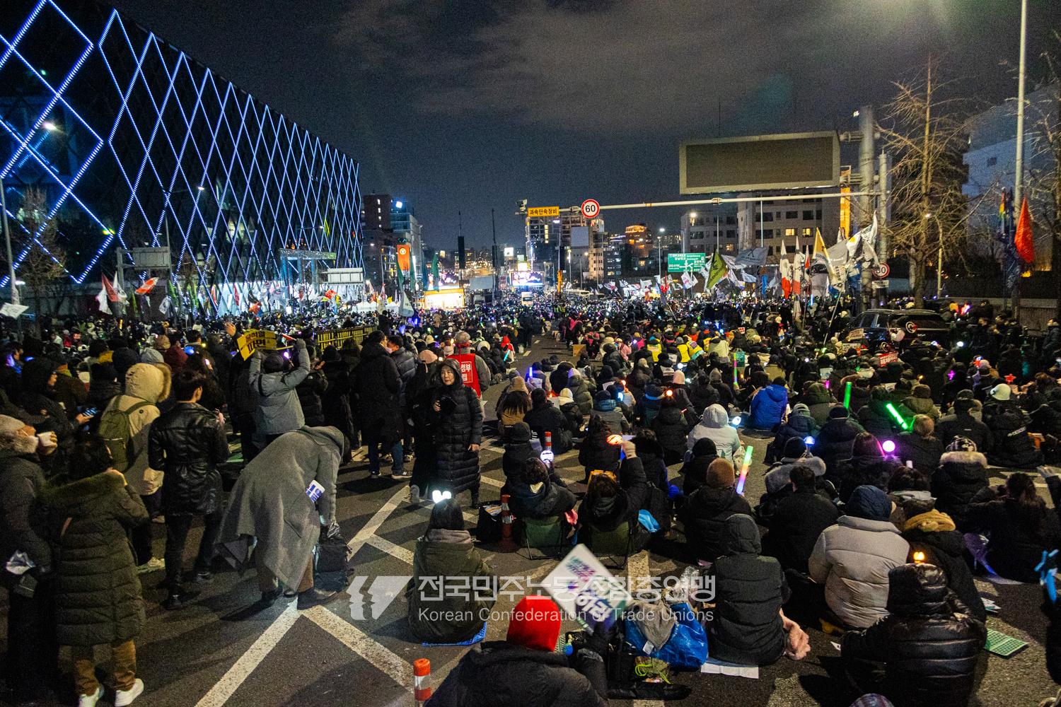 2025년 1월4일 광화문 동십자각에서 윤석열 즉각 체포! 긴급행동 집회를 마친 시민들이 한강진역 인근에 모여 함께 행진으로 집회장소에 모였다. 한남대로를 점거한 민주노총과 시민들의 노숙투쟁이 이어지는 가운데, 민주노총과 비상행동은 노숙투쟁을 하루 더 연장했다. 민주노총과 시민들의 밤샘투쟁이 지속되는 동안 전국 각지의 시민 물품후원에 이어 집회장소 인근 일신빌딩과 꼰벤뚜알 프란치스코 수도회가 시민들에게 화장실과 쉼터 등을 개방했다. 공공운수노조 화물연대본부를 비롯해 다양한 시민들이 후원한 난방버스 수 대도 도착해 밤샘투쟁에 지친 시민들의 노고를 위로했다.