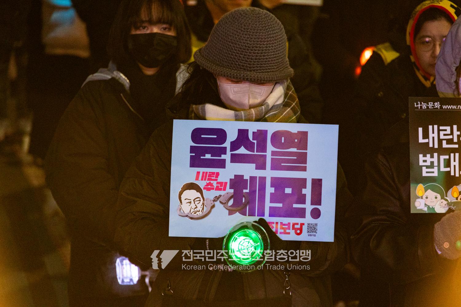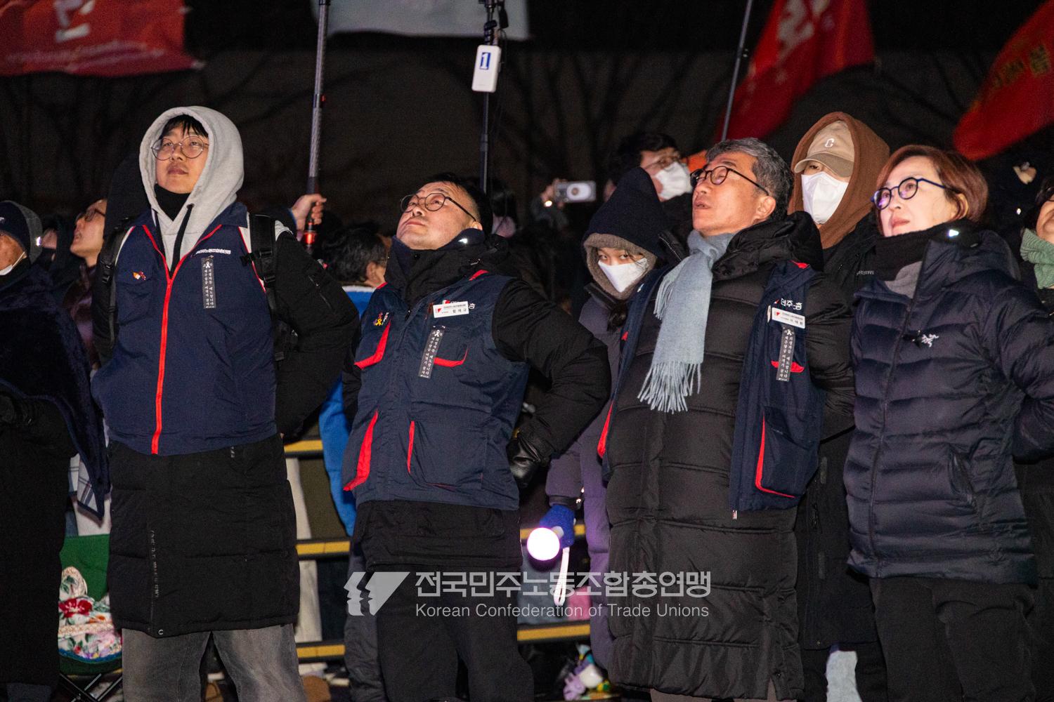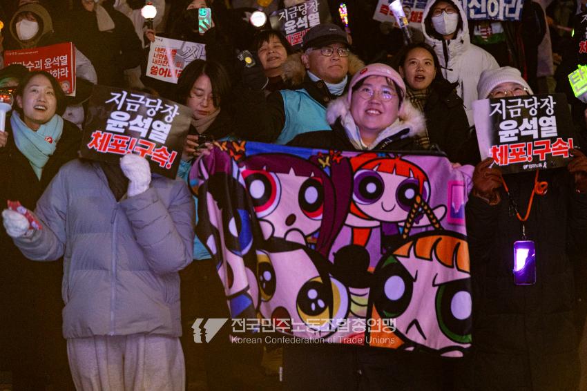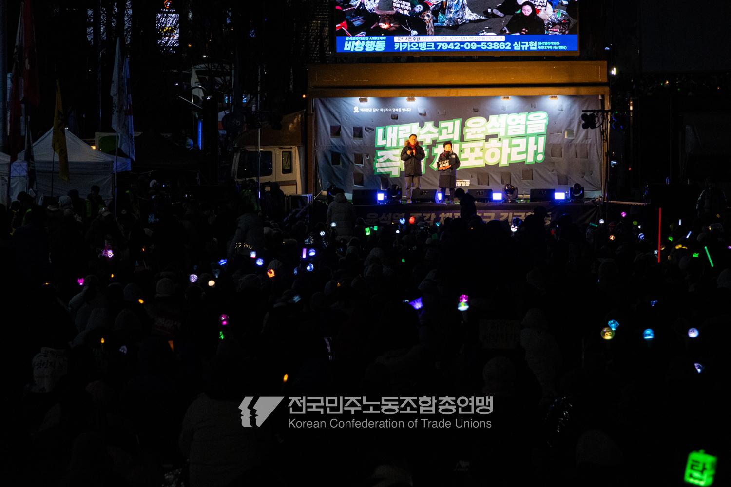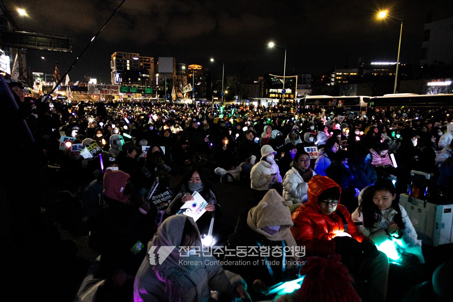 2025년 1월4일 광화문 동십자각에서 윤석열 즉각 체포! 긴급행동 집회를 마친 시민들이 한강진역 인근에 모여 함께 행진으로 집회장소에 모였다. 한남대로를 점거한 민주노총과 시민들의 노숙투쟁이 이어지는 가운데, 민주노총과 비상행동은 노숙투쟁을 하루 더 연장했다. 민주노총과 시민들의 밤샘투쟁이 지속되는 동안 전국 각지의 시민 물품후원에 이어 집회장소 인근 일신빌딩과 꼰벤뚜알 프란치스코 수도회가 시민들에게 화장실과 쉼터 등을 개방했다. 공공운수노조 화물연대본부를 비롯해 다양한 시민들이 후원한 난방버스 수 대도 도착해 밤샘투쟁에 지친 시민들의 노고를 위로했다.