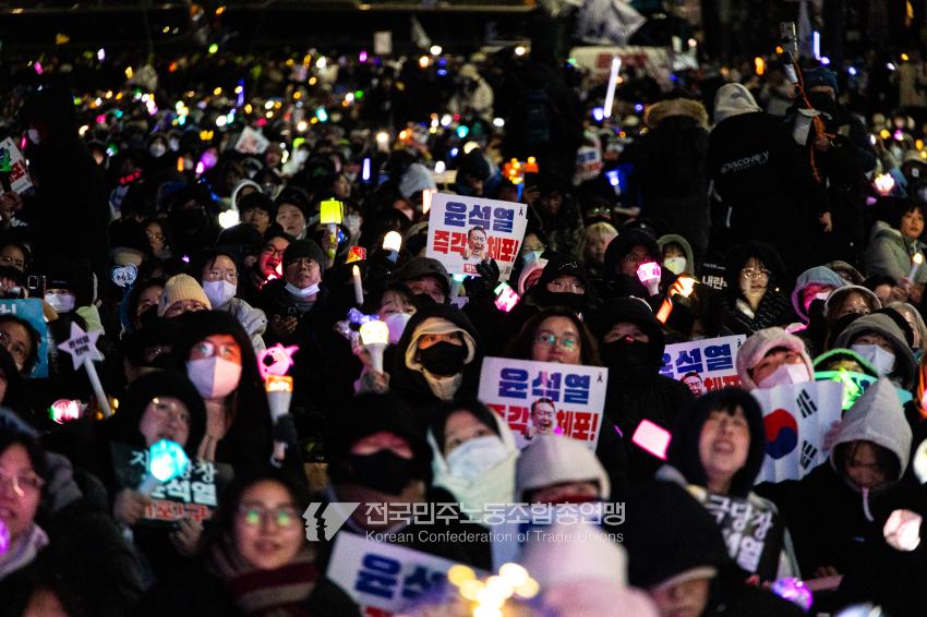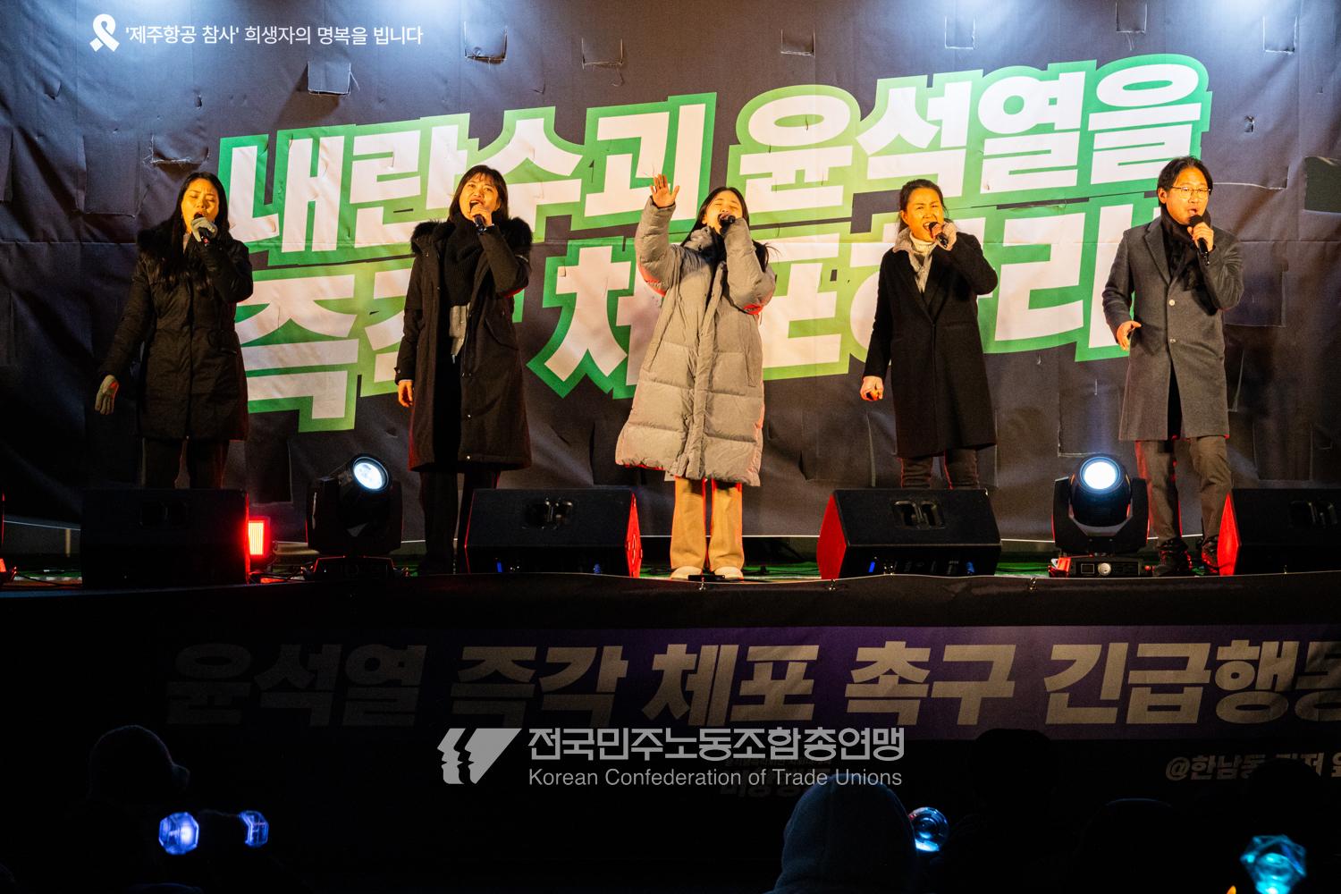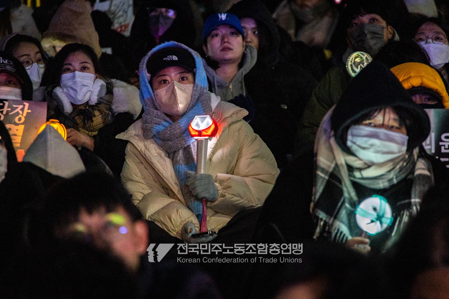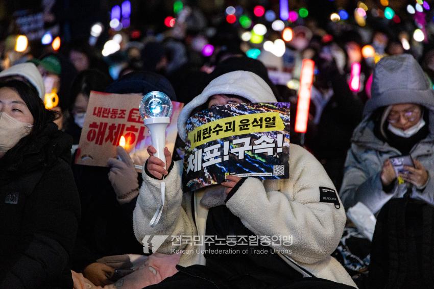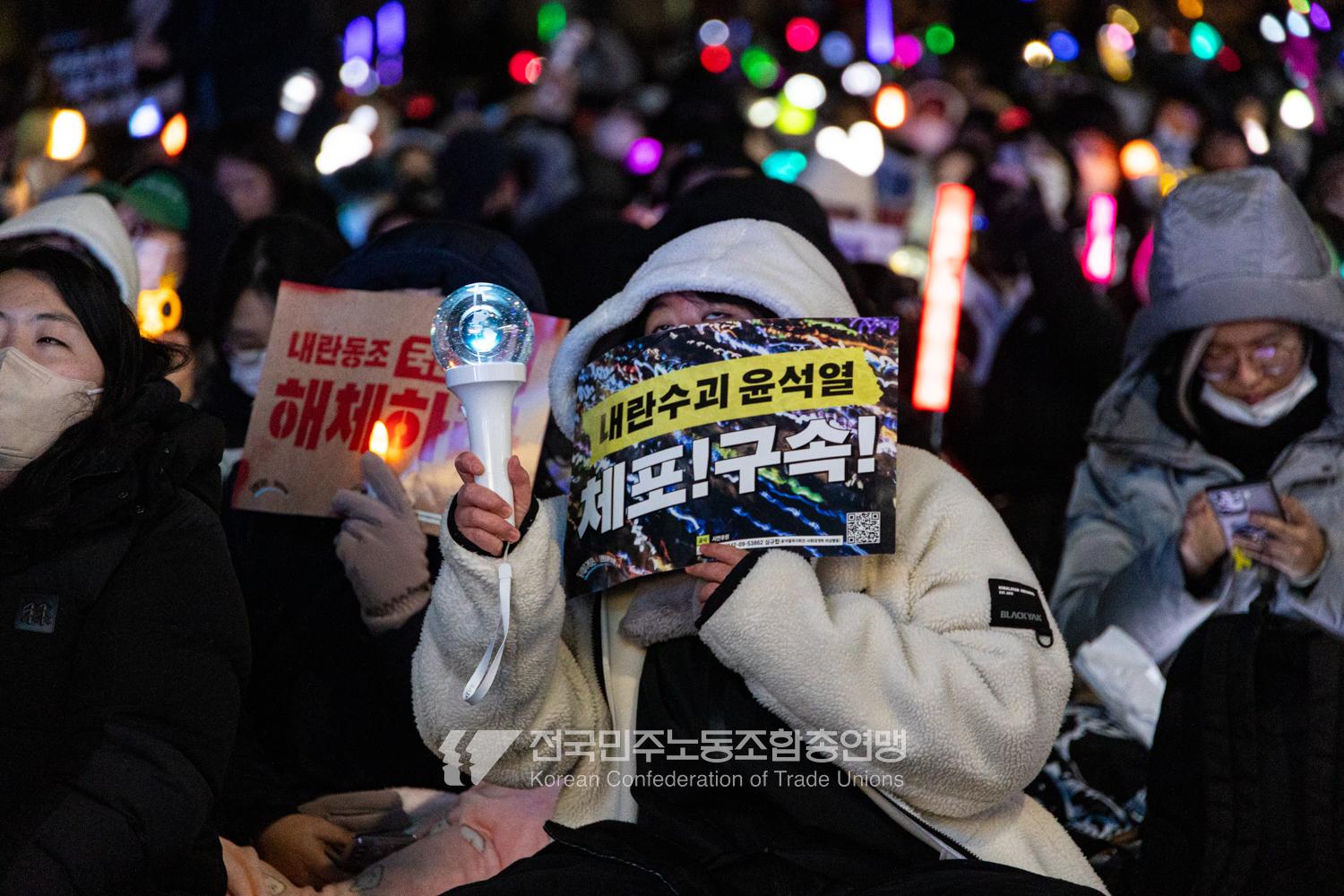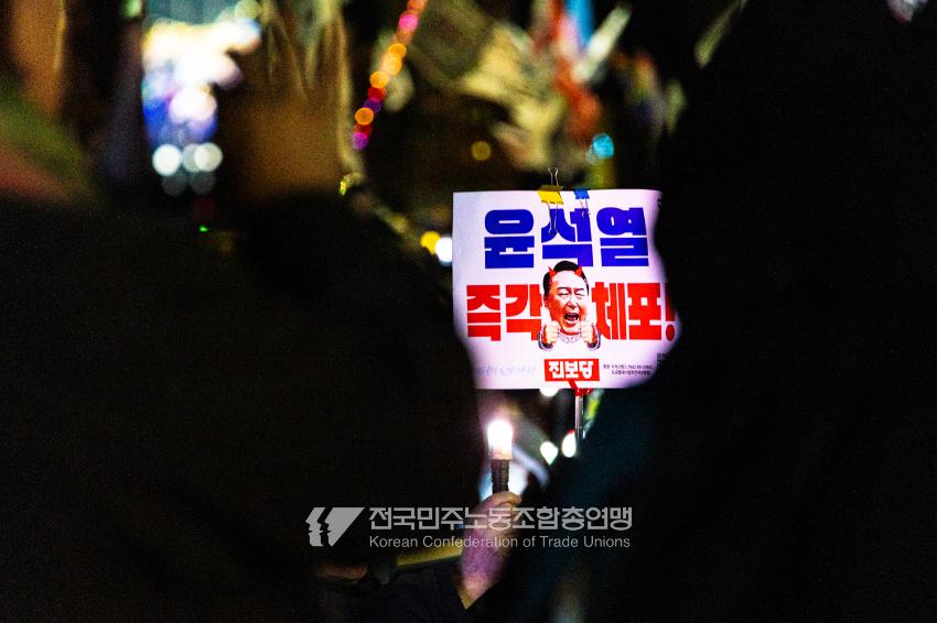 2025년 1월4일 광화문 동십자각에서 윤석열 즉각 체포! 긴급행동 집회를 마친 시민들이 한강진역 인근에 모여 함께 행진으로 집회장소에 모였다. 한남대로를 점거한 민주노총과 시민들의 노숙투쟁이 이어지는 가운데, 민주노총과 비상행동은 노숙투쟁을 하루 더 연장했다. 민주노총과 시민들의 밤샘투쟁이 지속되는 동안 전국 각지의 시민 물품후원에 이어 집회장소 인근 일신빌딩과 꼰벤뚜알 프란치스코 수도회가 시민들에게 화장실과 쉼터 등을 개방했다. 공공운수노조 화물연대본부를 비롯해 다양한 시민들이 후원한 난방버스 수 대도 도착해 밤샘투쟁에 지친 시민들의 노고를 위로했다.