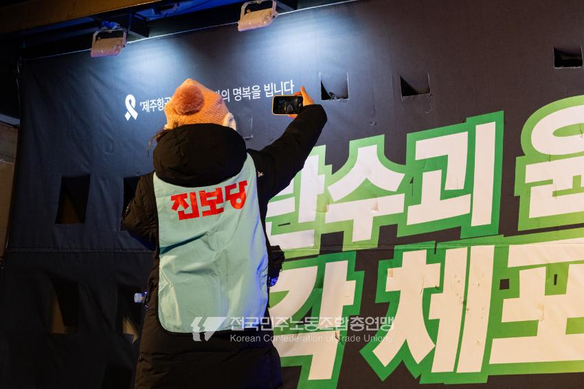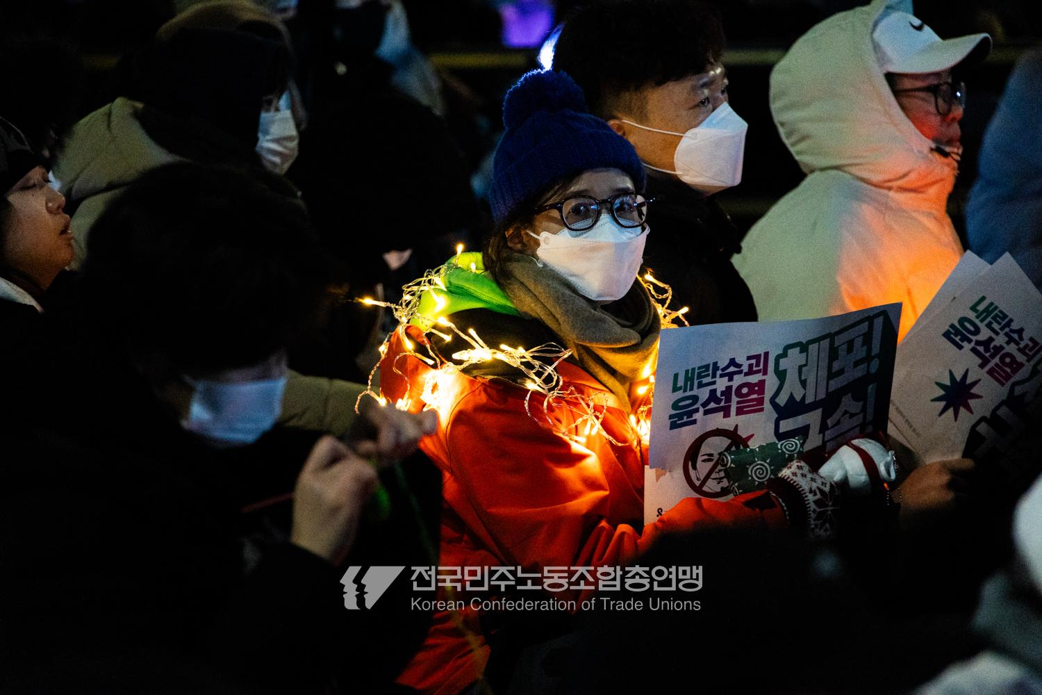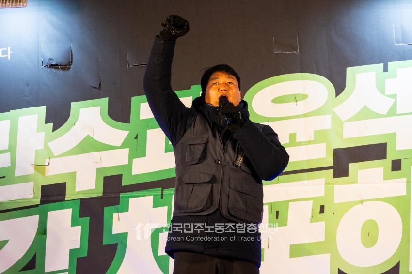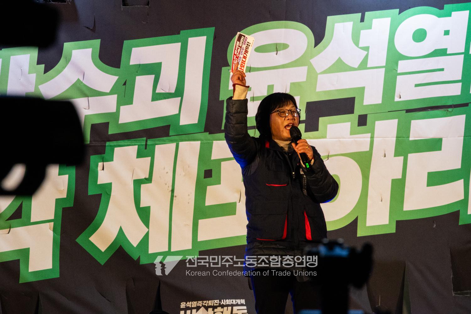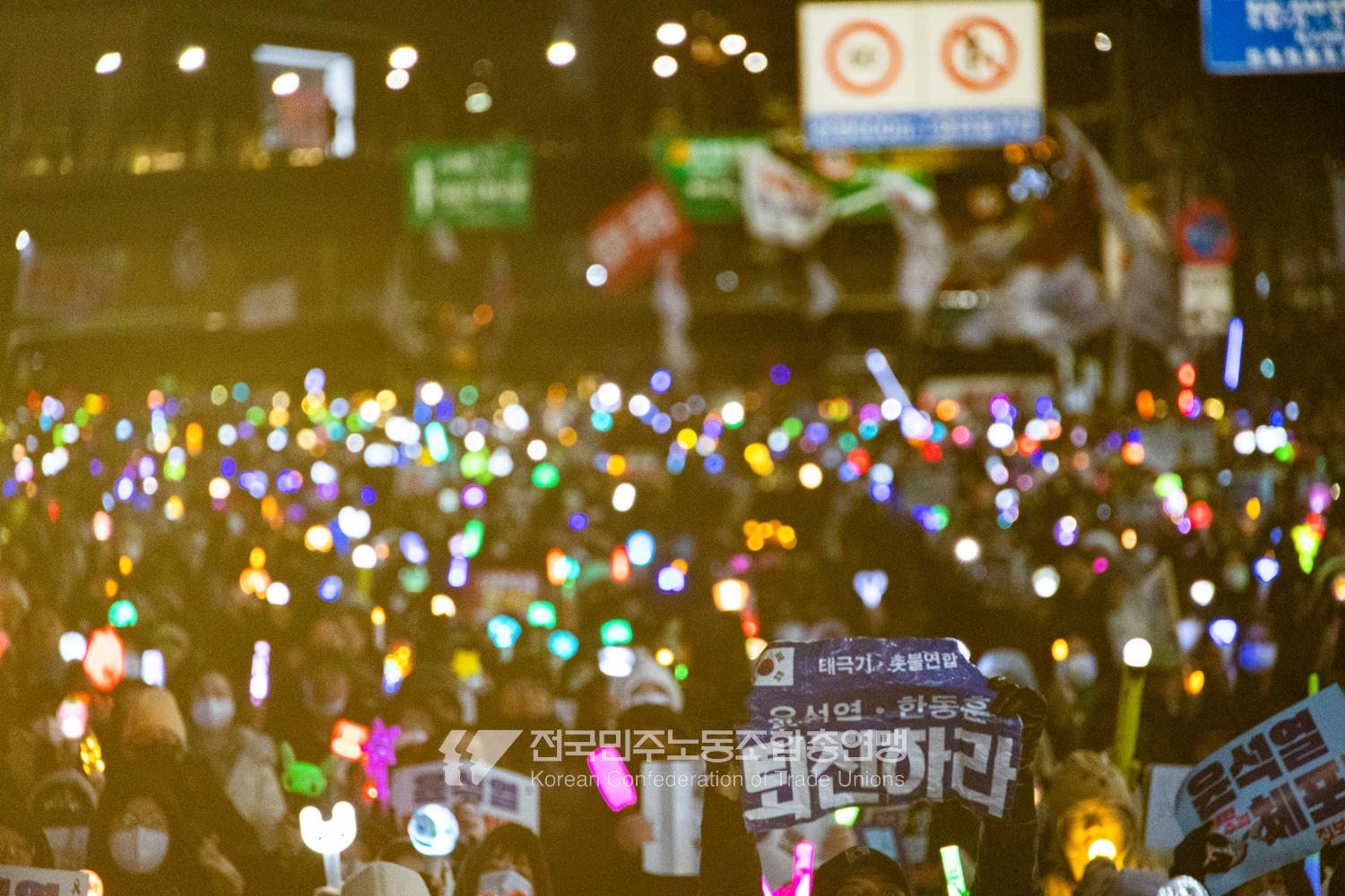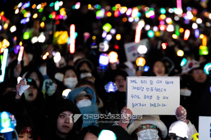 2025년 1월4일 광화문 동십자각에서 윤석열 즉각 체포! 긴급행동 집회를 마친 시민들이 한강진역 인근에 모여 함께 행진으로 집회장소에 모였다. 한남대로를 점거한 민주노총과 시민들의 노숙투쟁이 이어지는 가운데, 민주노총과 비상행동은 노숙투쟁을 하루 더 연장했다. 민주노총과 시민들의 밤샘투쟁이 지속되는 동안 전국 각지의 시민 물품후원에 이어 집회장소 인근 일신빌딩과 꼰벤뚜알 프란치스코 수도회가 시민들에게 화장실과 쉼터 등을 개방했다. 공공운수노조 화물연대본부를 비롯해 다양한 시민들이 후원한 난방버스 수 대도 도착해 밤샘투쟁에 지친 시민들의 노고를 위로했다.