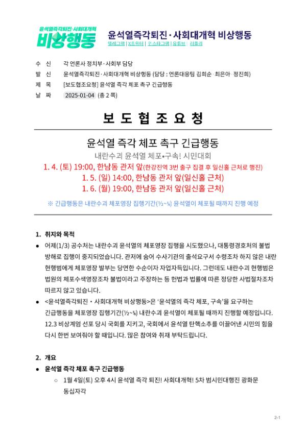 2025년 1월4일 광화문 동십자각에서 윤석열 즉각 체포! 긴급행동 집회를 마친 시민들이 한강진역 인근에 모여 함께 행진으로 집회장소에 모였다. 한남대로를 점거한 민주노총과 시민들의 노숙투쟁이 이어지는 가운데, 민주노총과 비상행동은 노숙투쟁을 하루 더 연장했다. 민주노총과 시민들의 밤샘투쟁이 지속되는 동안 전국 각지의 시민 물품후원에 이어 집회장소 인근 일신빌딩과 꼰벤뚜알 프란치스코 수도회가 시민들에게 화장실과 쉼터 등을 개방했다. 공공운수노조 화물연대본부를 비롯해 다양한 시민들이 후원한 난방버스 수 대도 도착해 밤샘투쟁에 지친 시민들의 노고를 위로했다.