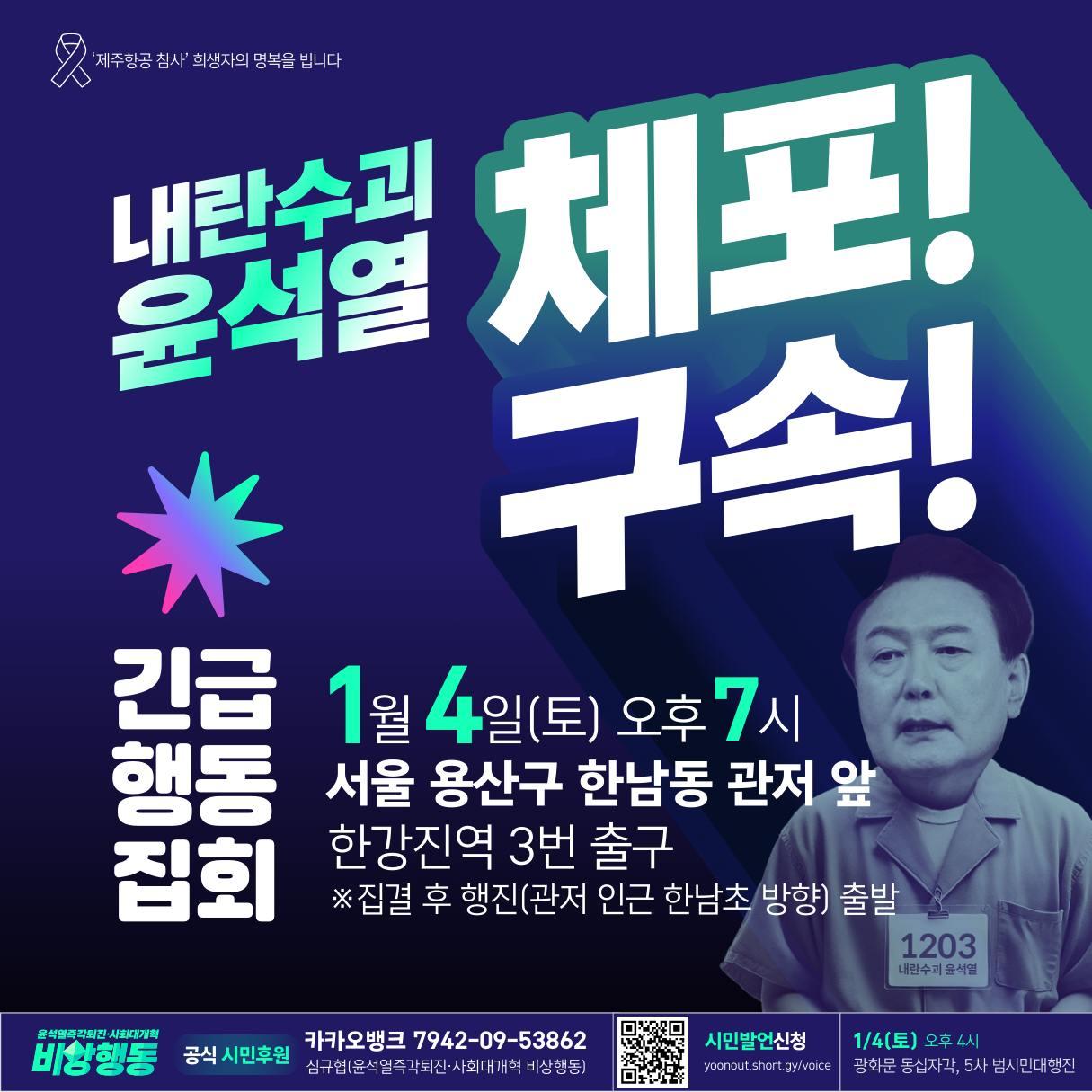 2025년 1월4일 광화문 동십자각에서 윤석열 즉각 체포! 긴급행동 집회를 마친 시민들이 한강진역 인근에 모여 함께 행진으로 집회장소에 모였다. 한남대로를 점거한 민주노총과 시민들의 노숙투쟁이 이어지는 가운데, 민주노총과 비상행동은 노숙투쟁을 하루 더 연장했다. 민주노총과 시민들의 밤샘투쟁이 지속되는 동안 전국 각지의 시민 물품후원에 이어 집회장소 인근 일신빌딩과 꼰벤뚜알 프란치스코 수도회가 시민들에게 화장실과 쉼터 등을 개방했다. 공공운수노조 화물연대본부를 비롯해 다양한 시민들이 후원한 난방버스 수 대도 도착해 밤샘투쟁에 지친 시민들의 노고를 위로했다.