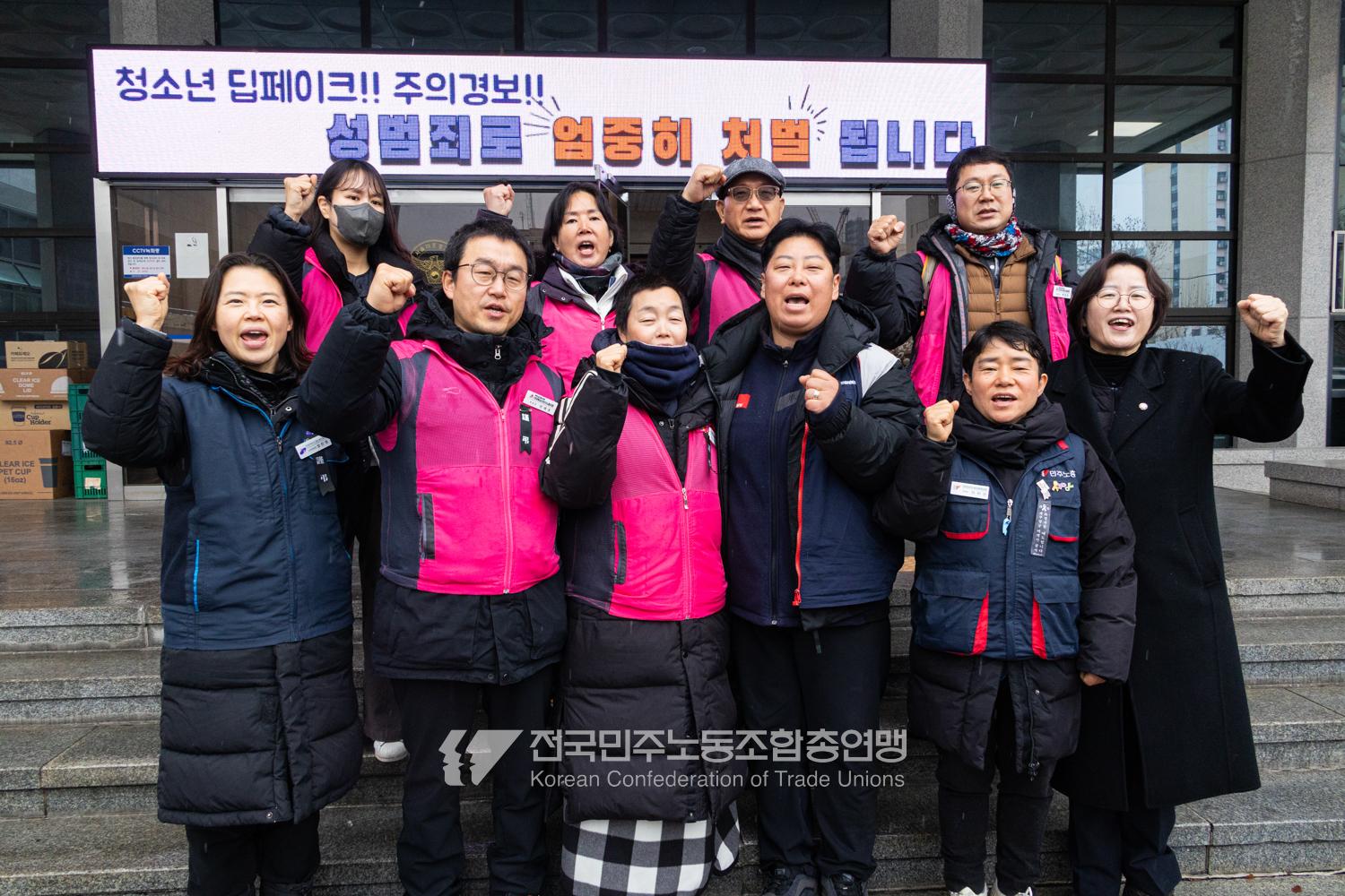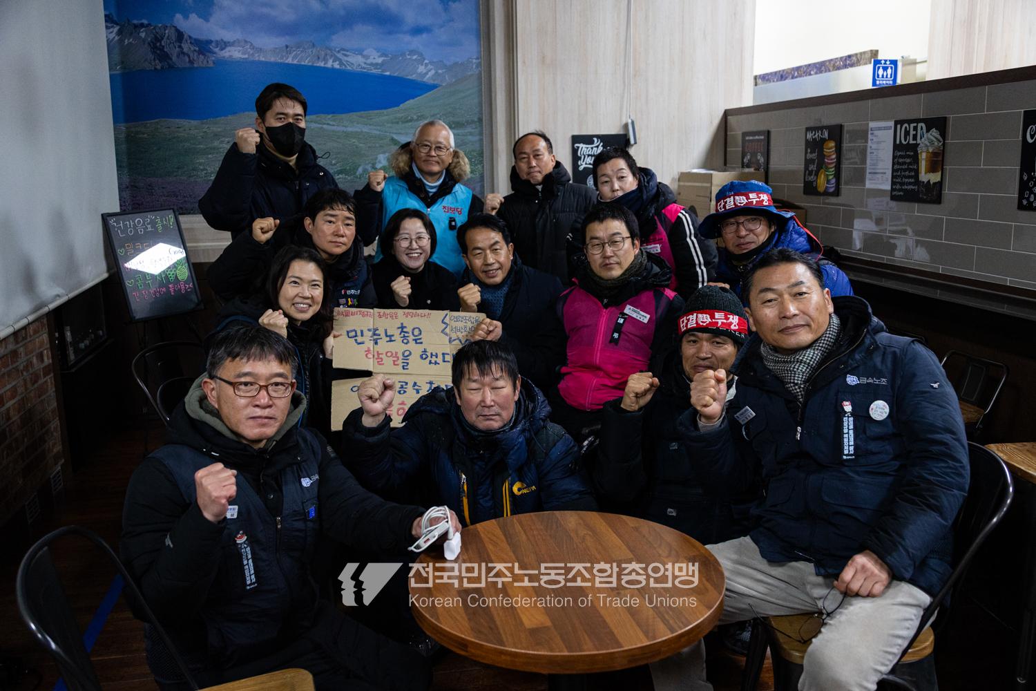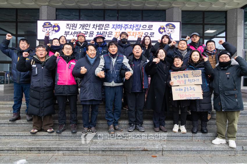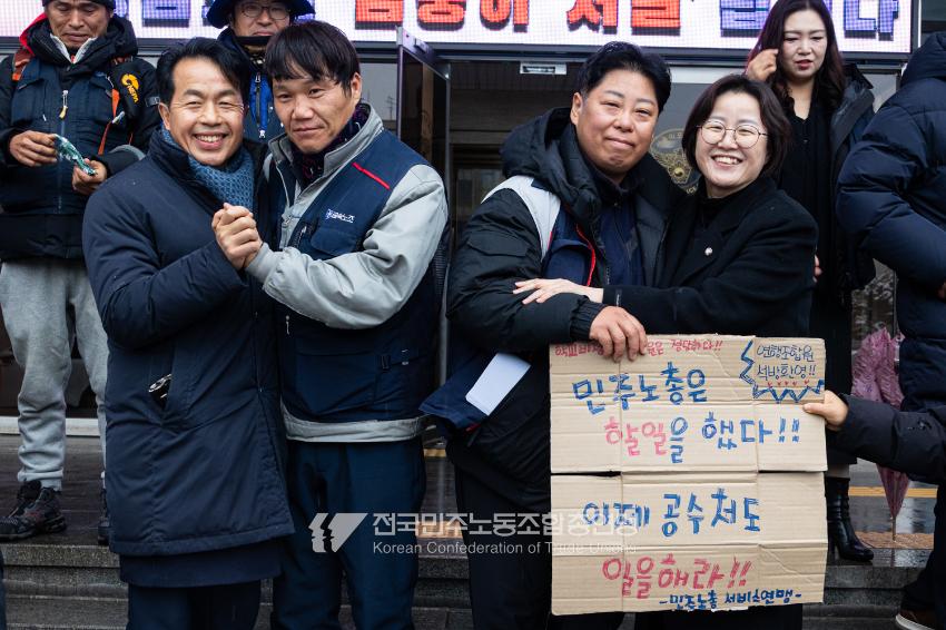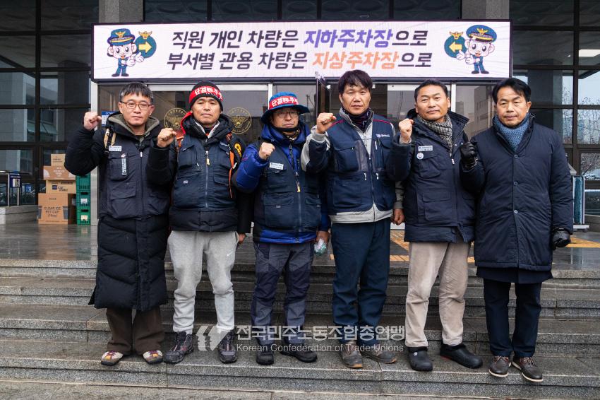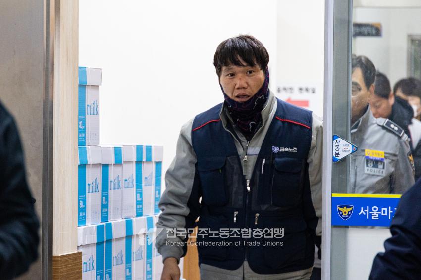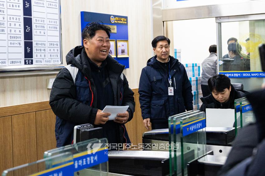 경찰이 2025년 1월4일 한남동 집회 중 민주노총 조합원 2명을 폭력적으로 연행한 상황에서 민주노총이 5일 오전 10시30분 서울 마포경찰서를 찾아 조속한 석방을 촉구하고 경찰을 규탄하는 기자회견을 열었다. 연행된 조합원은 금속노조 거제통영고성하청지회 조합원과 서비스연맹 학비노조 소속 급식노동자다. 두 조합원은 밤새 은평경찰서에 수감됐다 이날 오전 마포경찰서로 이감됐다. 민주노총과 진보정당, 시민들은 두 조합원이 연행된 순간부터 밤새 은평경찰서 앞을 지킨 것으로 알려졌다. 기자회견을 마치고 난 오후 1시경 두 조합원이 석방됐다. 이들은 마포경찰서 앞에서 ‘민주노총은 할일을 했다. 이제 공수처도 일을 해라’라고 적힌 피켓을 들었다.