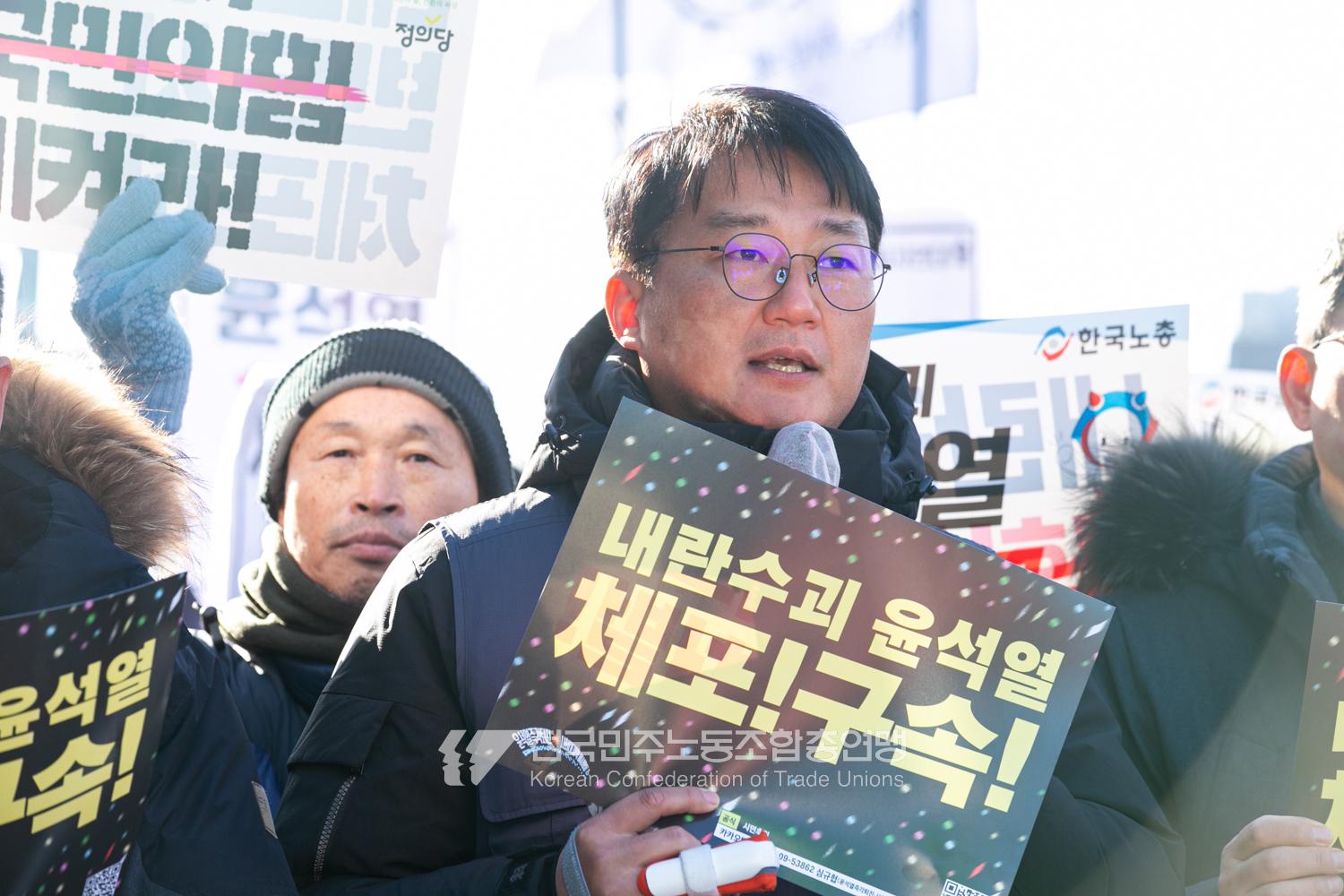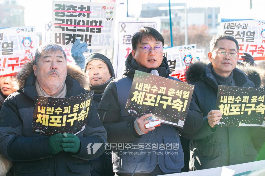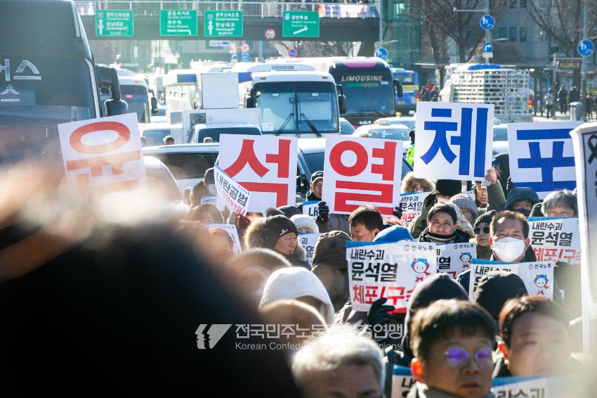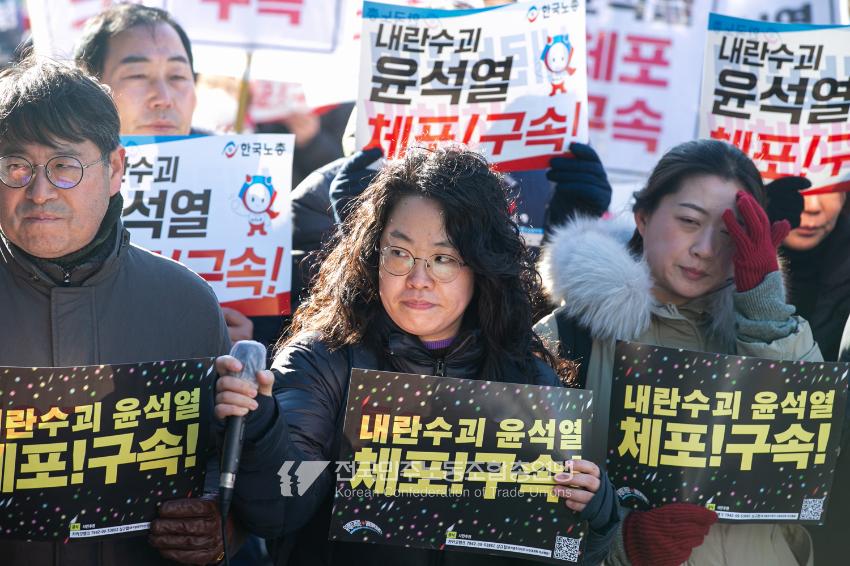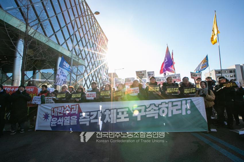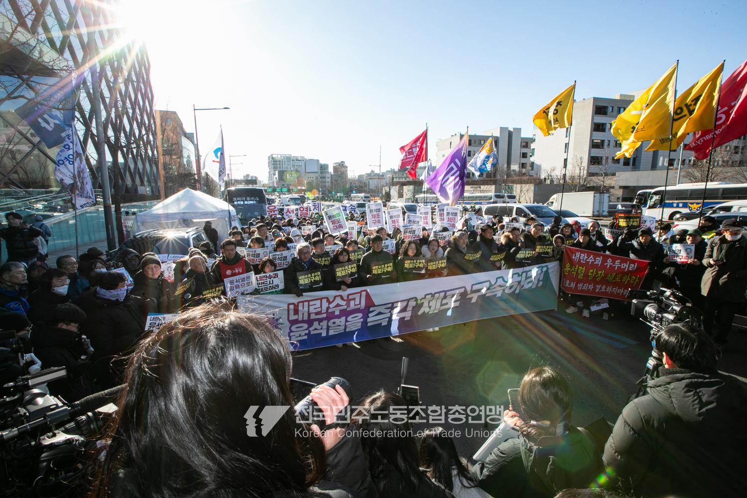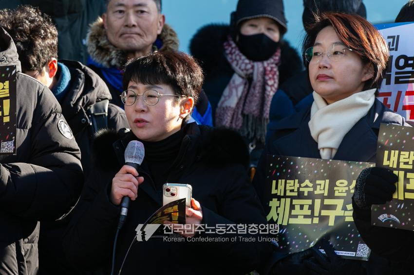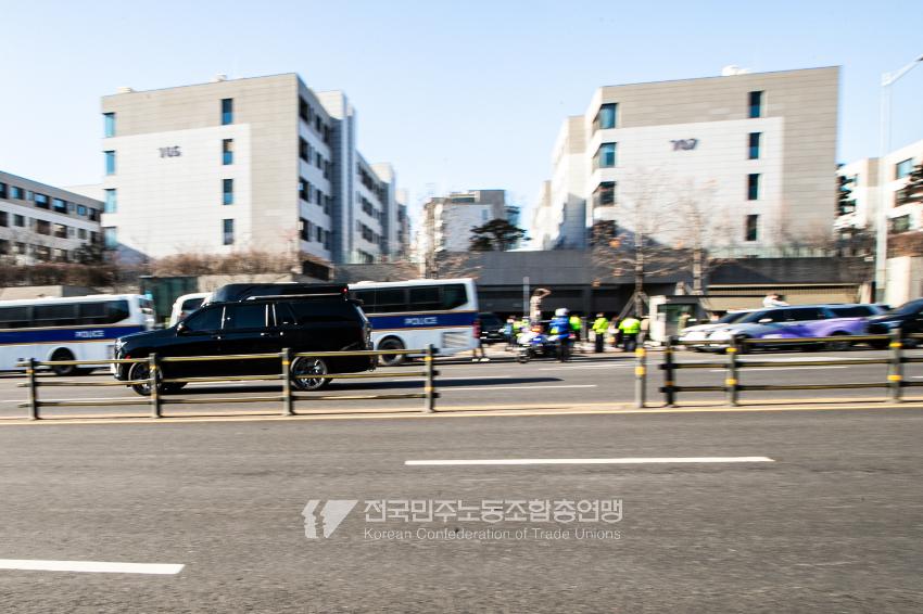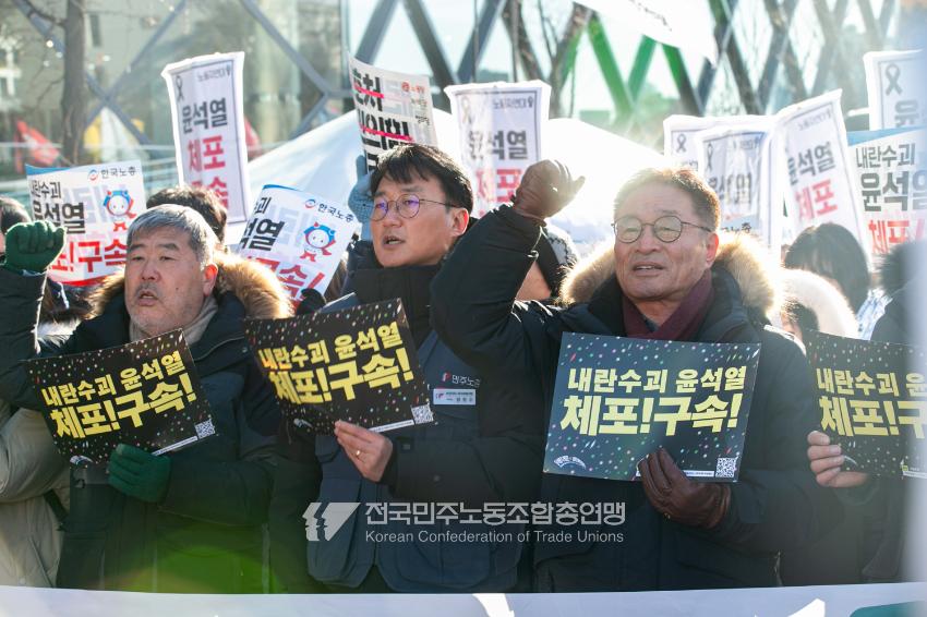 2025년 1월15일 오전 10시33분 내란수괴 윤석열이 체포됐다. 민주노총을 비롯한 노동시민사회단체들이 한남동 대통령 관저 인근에 모여 공수처의 윤석열 체포를 촉구하며 체포영장 집행에 관한 입장을 발표하는 기자회견을 열었다. 윤석열이 압송된 공수처 차량이 한남대로를 지나가자 한남동에 다시 모인 시민들은 “민주시민이 윤석열을 이겼다”라고 환호했고 곳곳에서 박수와 구호가 터져나왔다.