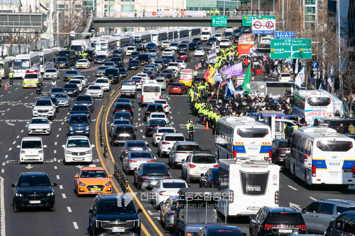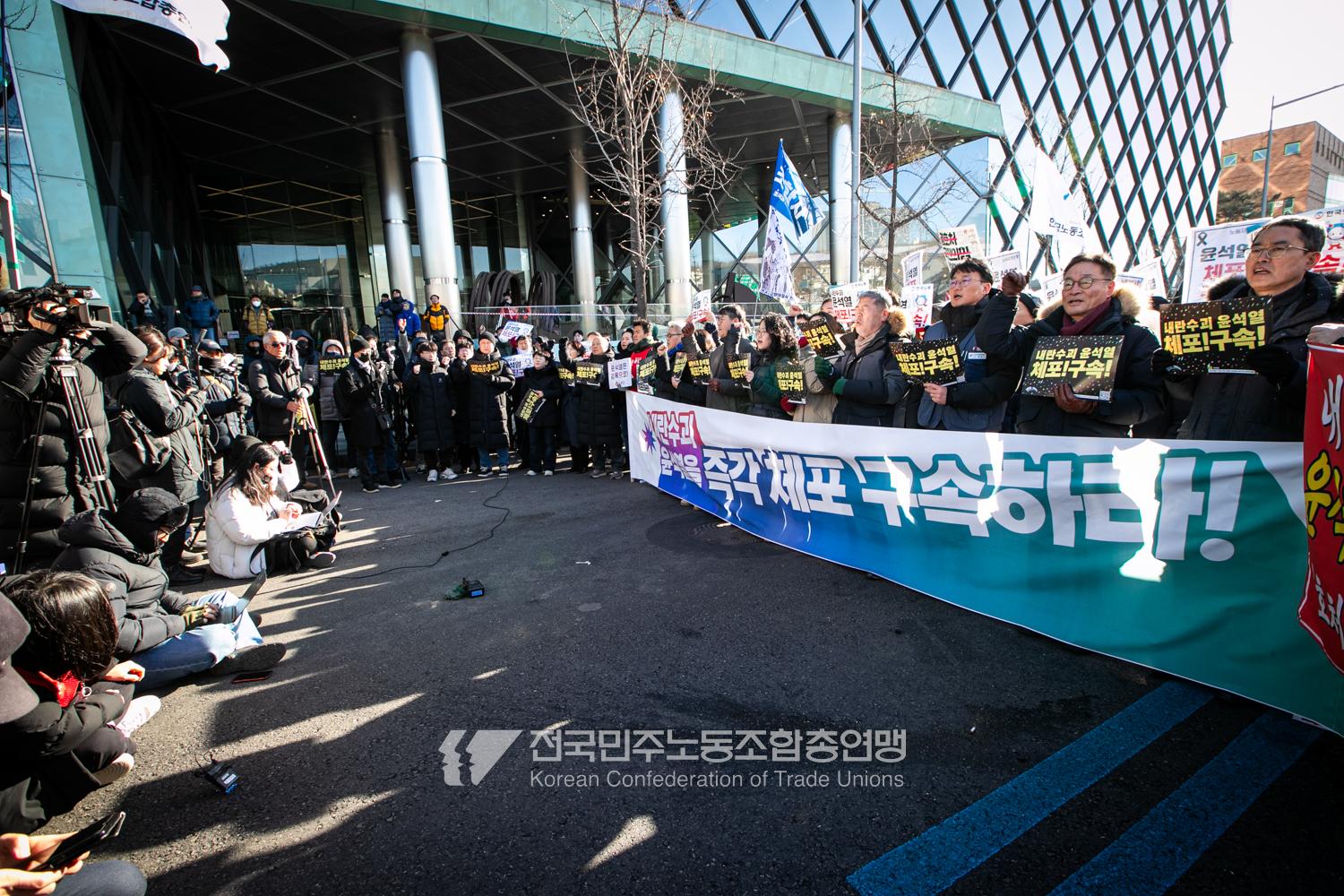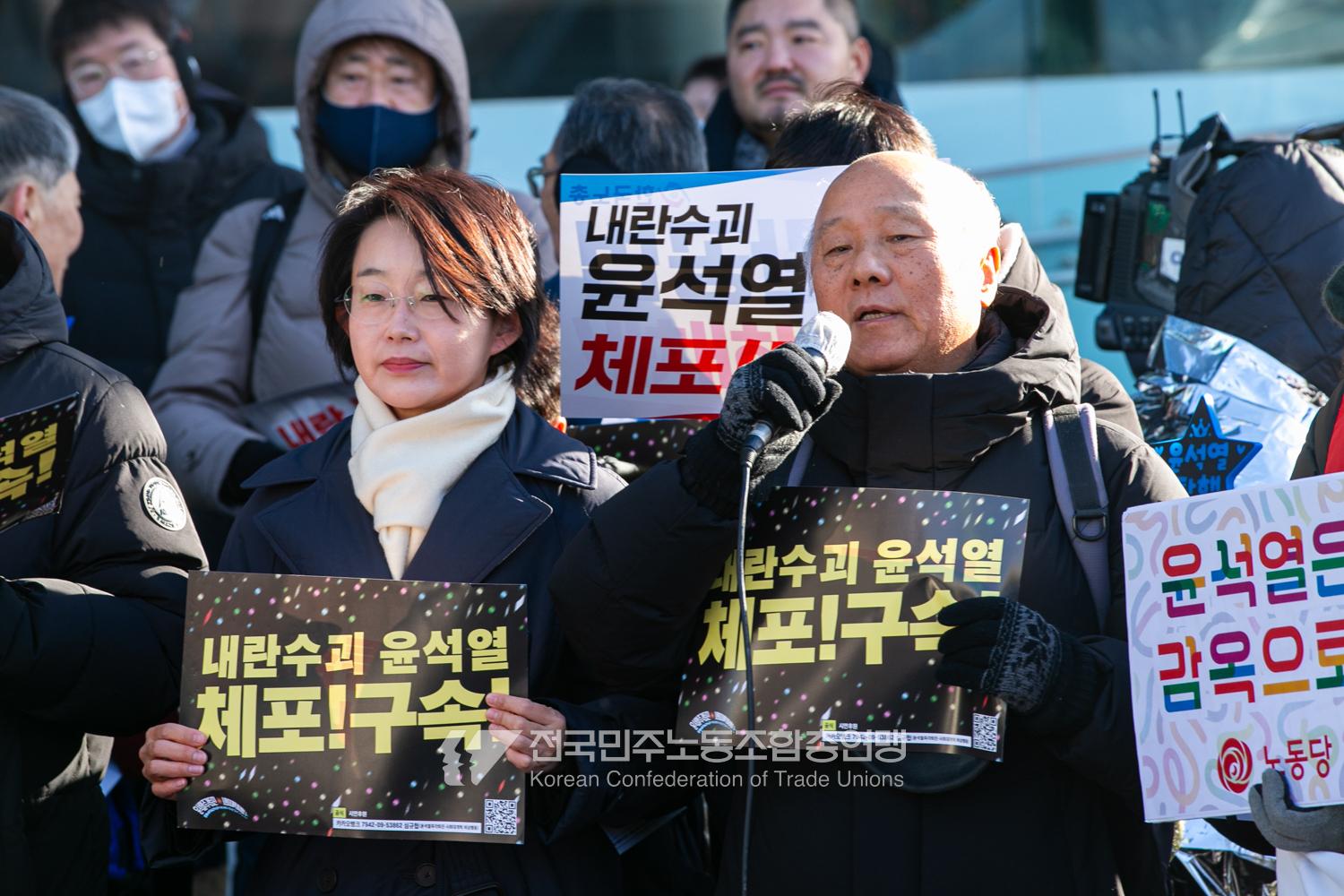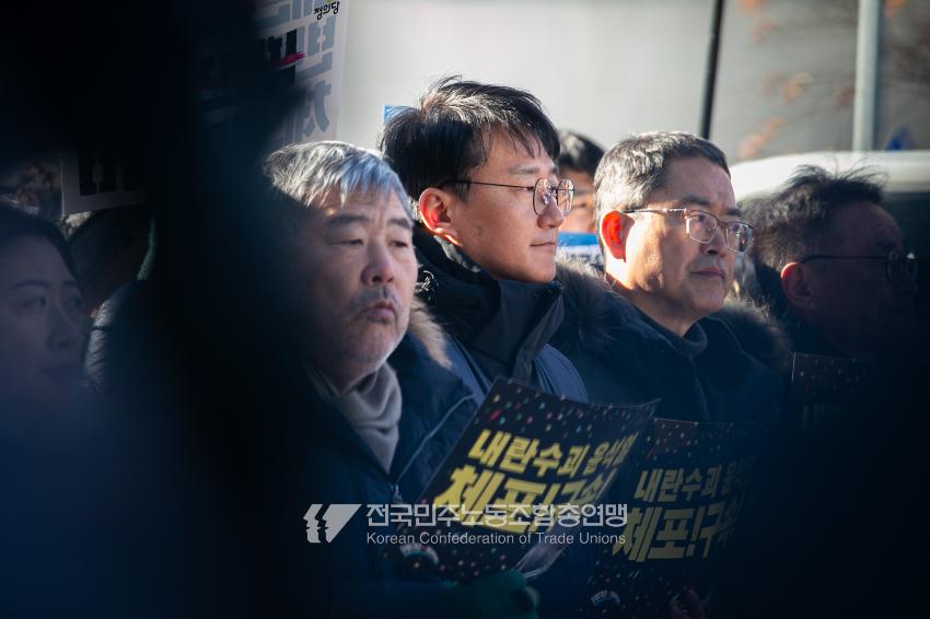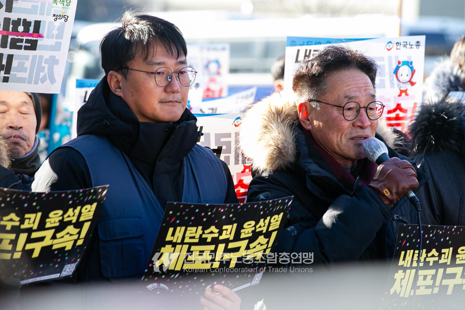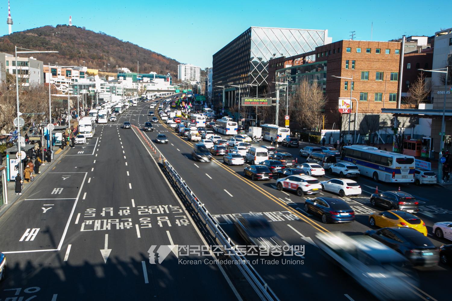 2025년 1월15일 오전 10시33분 내란수괴 윤석열이 체포됐다. 민주노총을 비롯한 노동시민사회단체들이 한남동 대통령 관저 인근에 모여 공수처의 윤석열 체포를 촉구하며 체포영장 집행에 관한 입장을 발표하는 기자회견을 열었다. 윤석열이 압송된 공수처 차량이 한남대로를 지나가자 한남동에 다시 모인 시민들은 “민주시민이 윤석열을 이겼다”라고 환호했고 곳곳에서 박수와 구호가 터져나왔다.