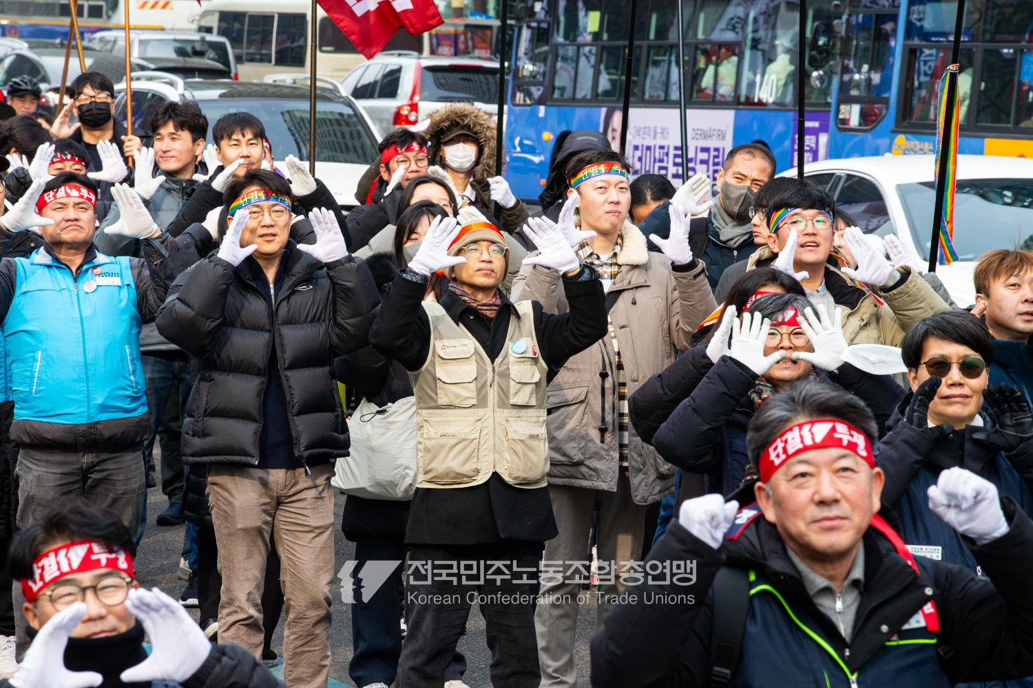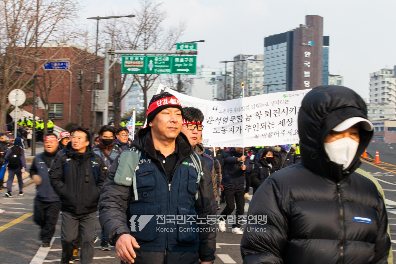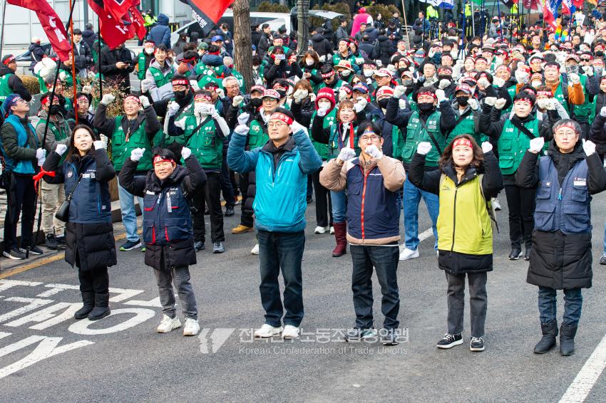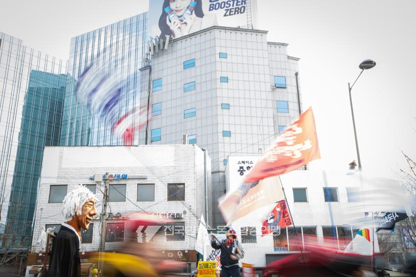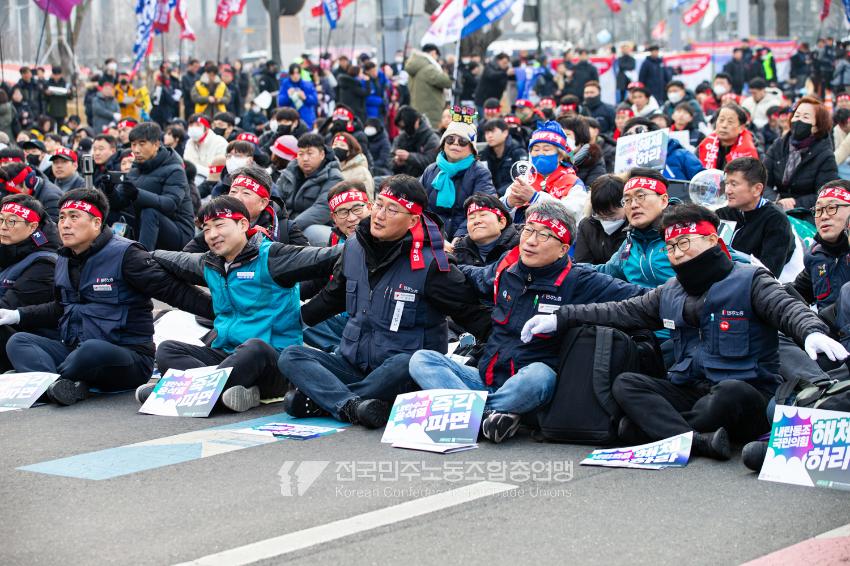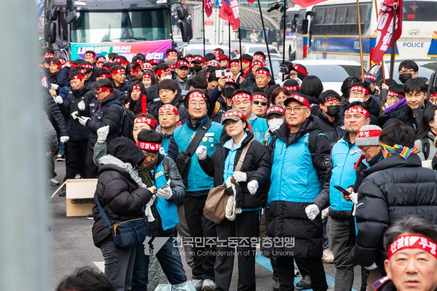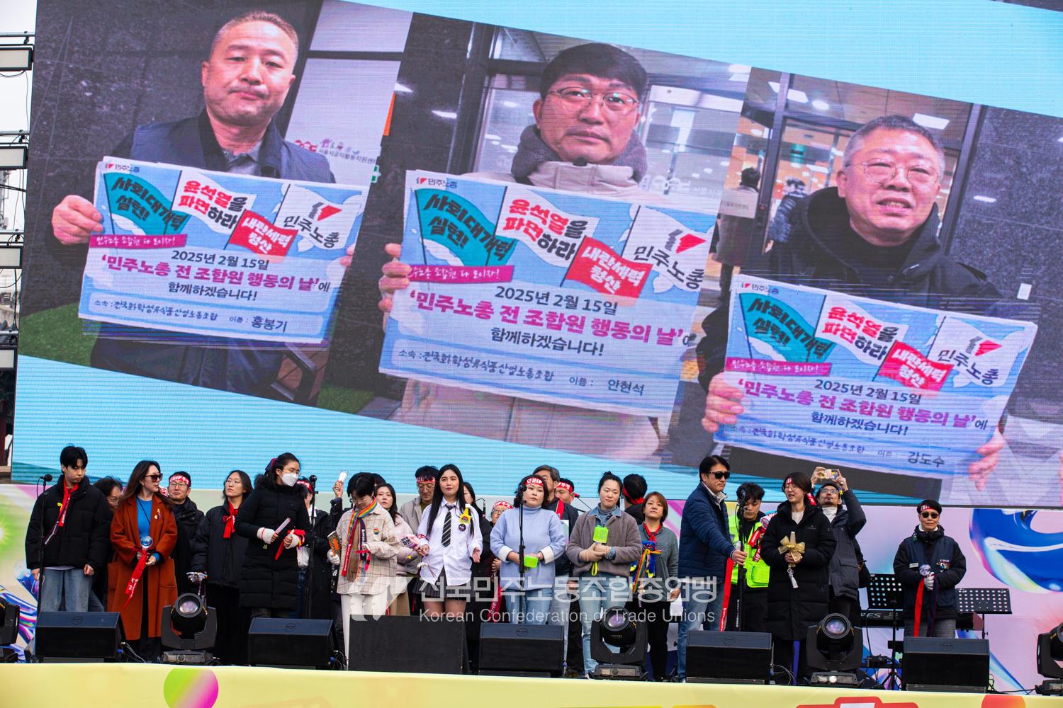 민주노총이 2025년 2월15일을 ‘민주노총 전 조합원 행동의 날’로 정하고 노동기본권 쟁취를 골자로 한 사회대개혁 요구를 전면화했다. 전국 1만5천여 조합원이 각 지역에서 동시다발로 대회를 열고 윤석열 즉각 파면과 사회대개혁 실현을 요구했다. 수도권에 모인 조합원 5천여 명은 서울지방고용노동청부터 비상행동 범시민대행진이 열리는 광화문 동십자각까지 행진했다. 행진 선두에는 거통고 조선소하청노동자의 투쟁을 지지하는 ‘무지개조선소 연대투쟁호’와 백기완 선생 4주기를 기리는 조형물이 앞장섰다. 민주노총 조합원들은 결의를 다지는 의미에서 빨간 머리띠를 둘렀고 가맹산하 조직은 저마다의 재치있는 방식으로 윤석열 득각 파면과 사회대개혁 의제를 선전했다.