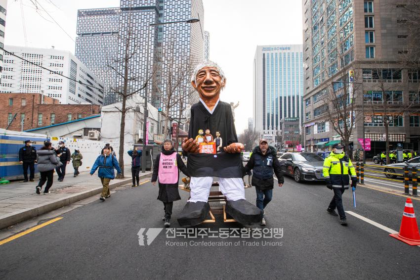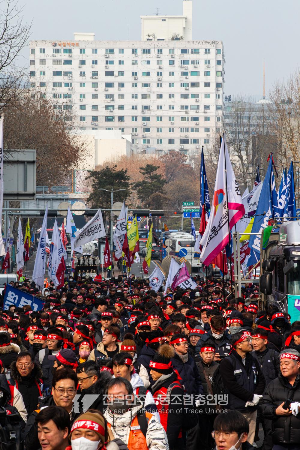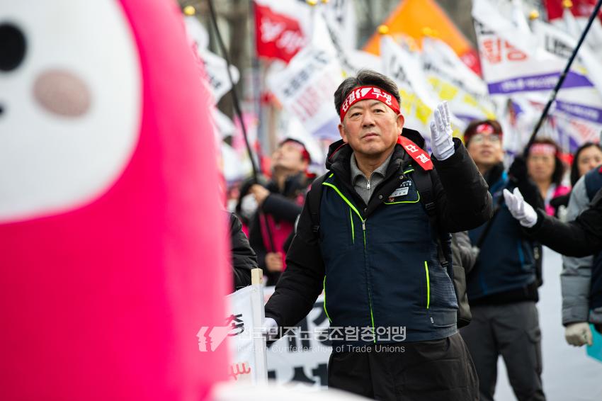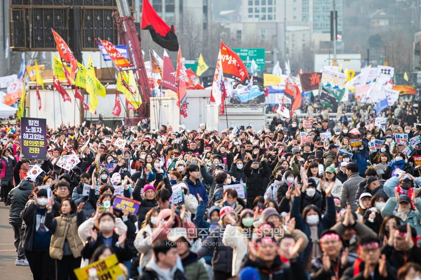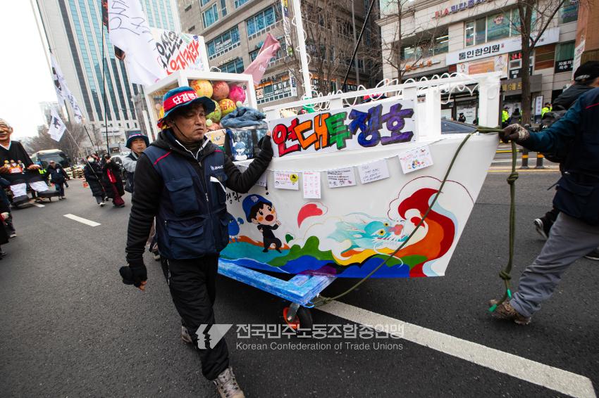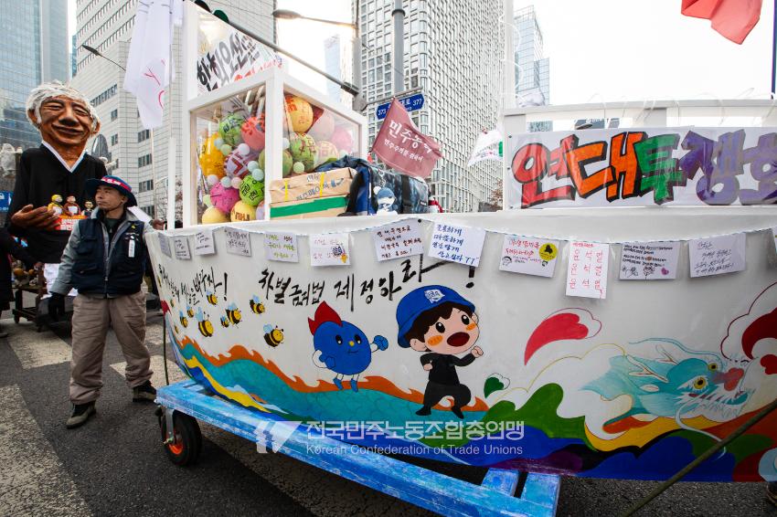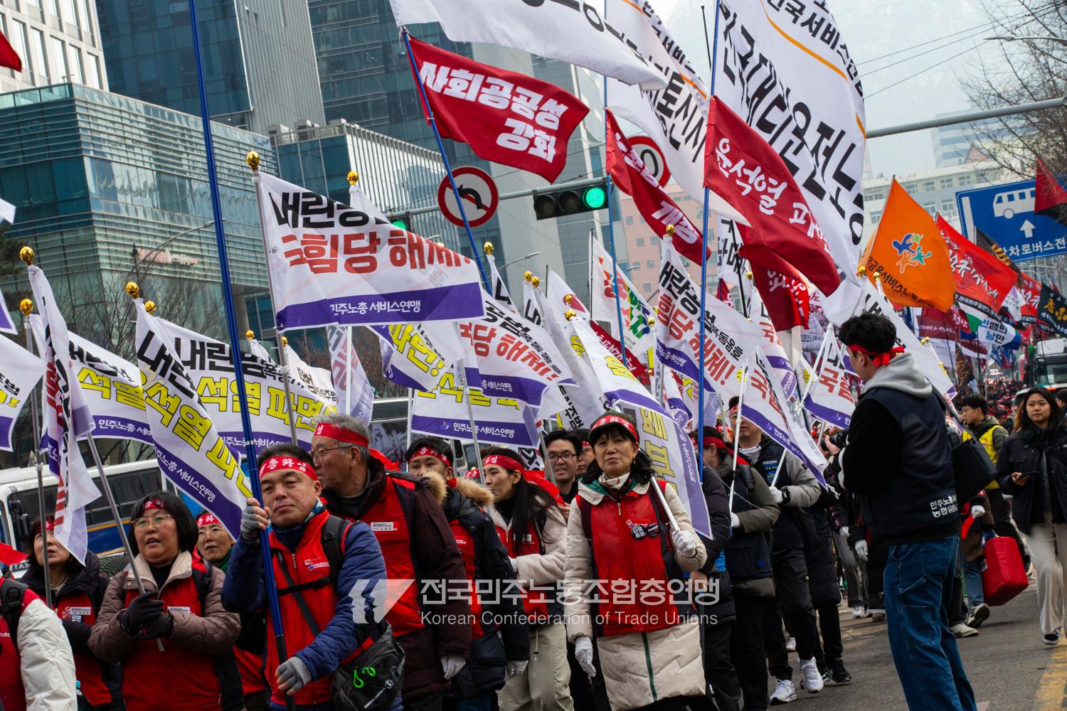 민주노총이 2025년 2월15일을 ‘민주노총 전 조합원 행동의 날’로 정하고 노동기본권 쟁취를 골자로 한 사회대개혁 요구를 전면화했다. 전국 1만5천여 조합원이 각 지역에서 동시다발로 대회를 열고 윤석열 즉각 파면과 사회대개혁 실현을 요구했다. 수도권에 모인 조합원 5천여 명은 서울지방고용노동청부터 비상행동 범시민대행진이 열리는 광화문 동십자각까지 행진했다. 행진 선두에는 거통고 조선소하청노동자의 투쟁을 지지하는 ‘무지개조선소 연대투쟁호’와 백기완 선생 4주기를 기리는 조형물이 앞장섰다. 민주노총 조합원들은 결의를 다지는 의미에서 빨간 머리띠를 둘렀고 가맹산하 조직은 저마다의 재치있는 방식으로 윤석열 득각 파면과 사회대개혁 의제를 선전했다.