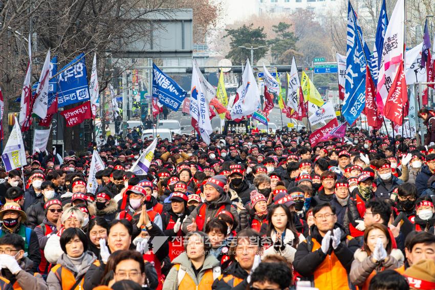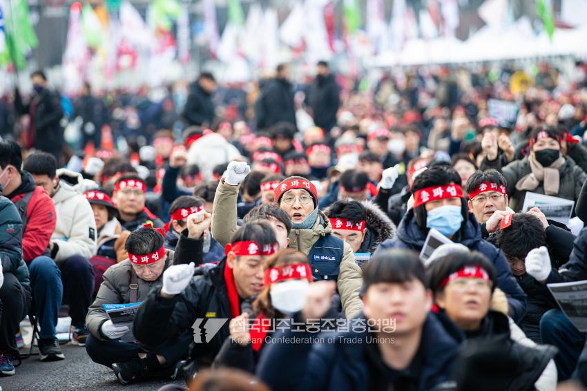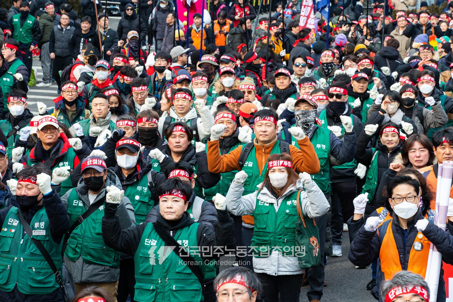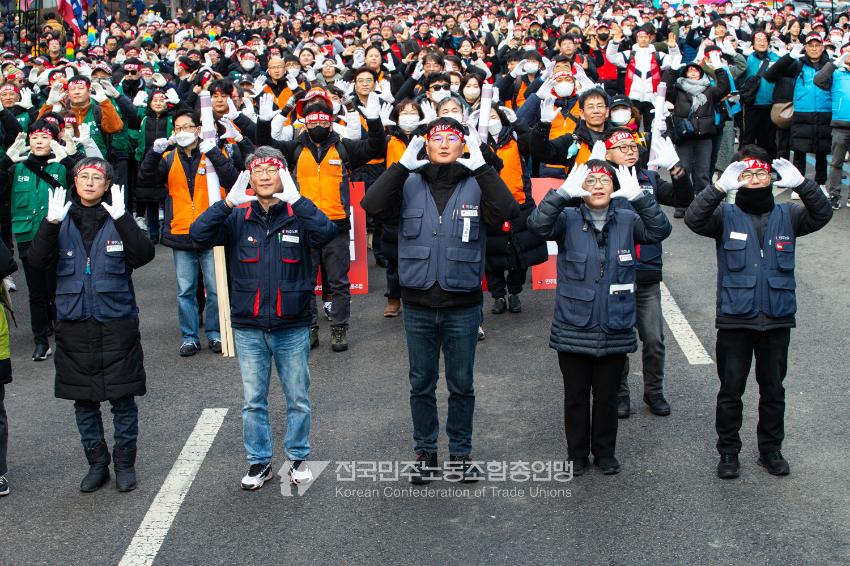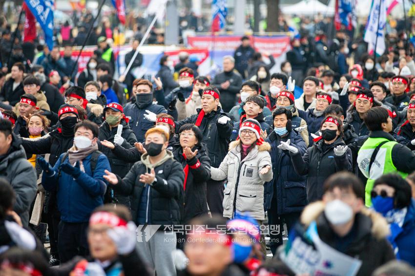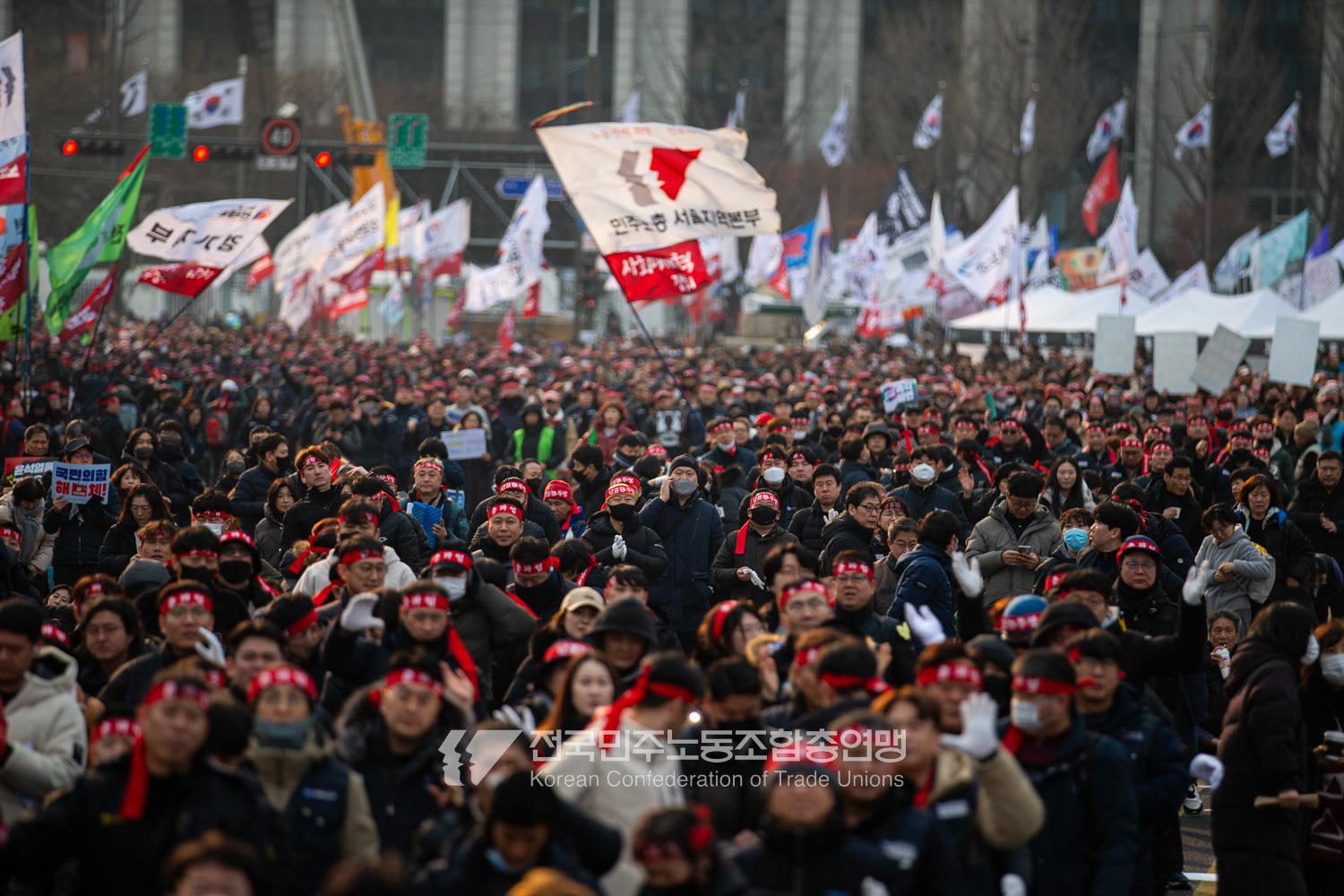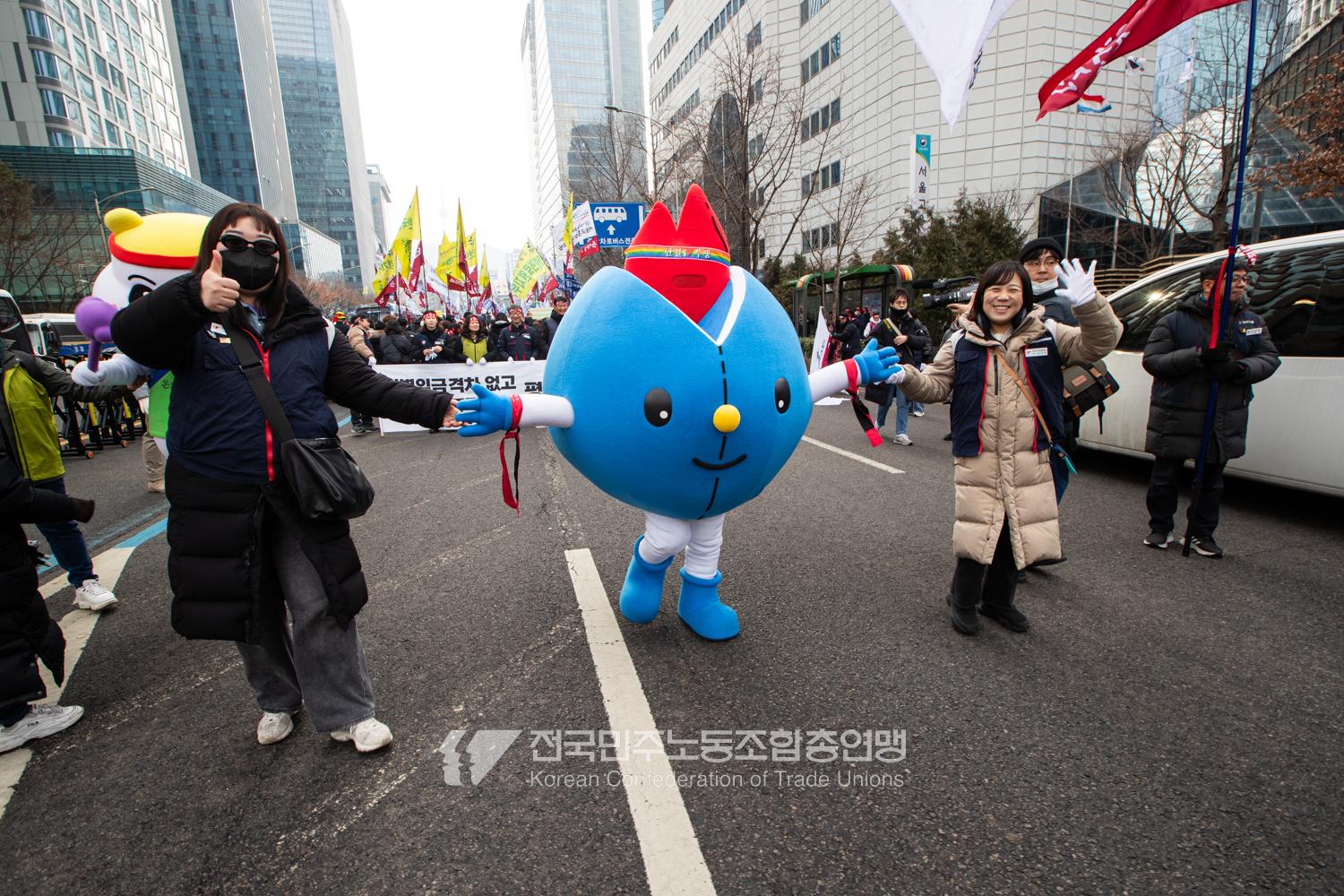 민주노총이 2025년 2월15일을 ‘민주노총 전 조합원 행동의 날’로 정하고 노동기본권 쟁취를 골자로 한 사회대개혁 요구를 전면화했다. 전국 1만5천여 조합원이 각 지역에서 동시다발로 대회를 열고 윤석열 즉각 파면과 사회대개혁 실현을 요구했다. 수도권에 모인 조합원 5천여 명은 서울지방고용노동청부터 비상행동 범시민대행진이 열리는 광화문 동십자각까지 행진했다. 행진 선두에는 거통고 조선소하청노동자의 투쟁을 지지하는 ‘무지개조선소 연대투쟁호’와 백기완 선생 4주기를 기리는 조형물이 앞장섰다. 민주노총 조합원들은 결의를 다지는 의미에서 빨간 머리띠를 둘렀고 가맹산하 조직은 저마다의 재치있는 방식으로 윤석열 득각 파면과 사회대개혁 의제를 선전했다.