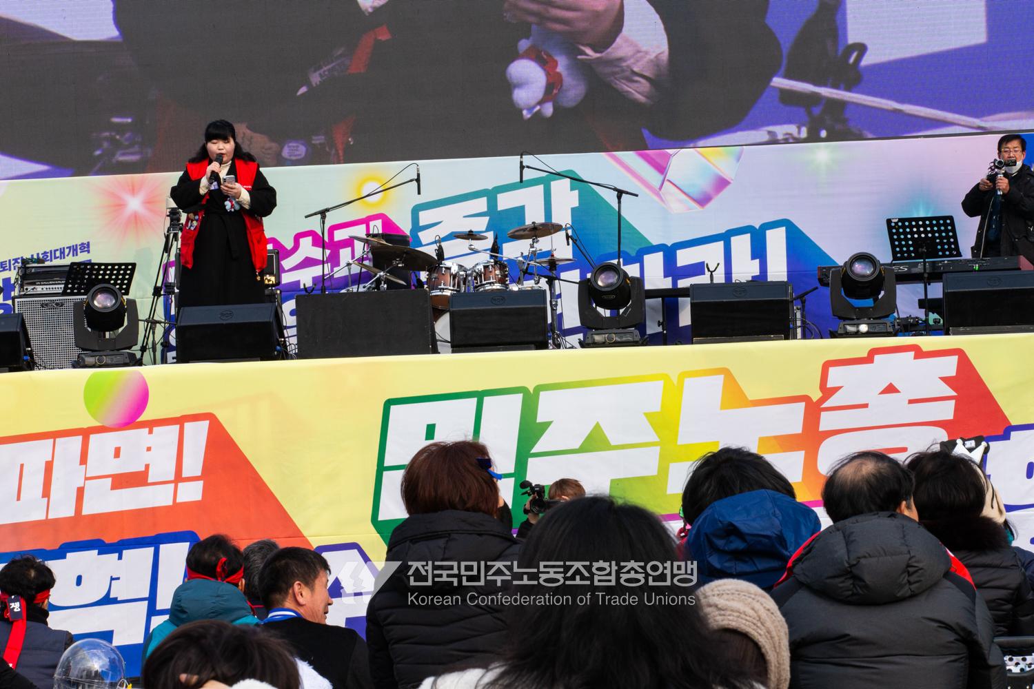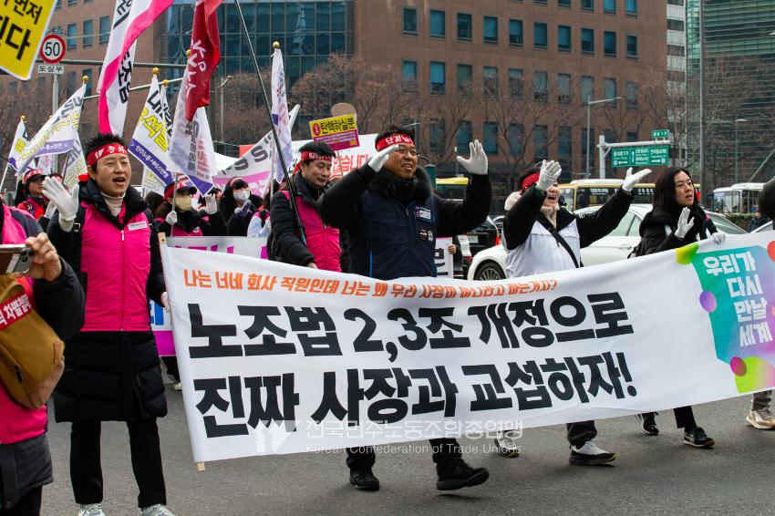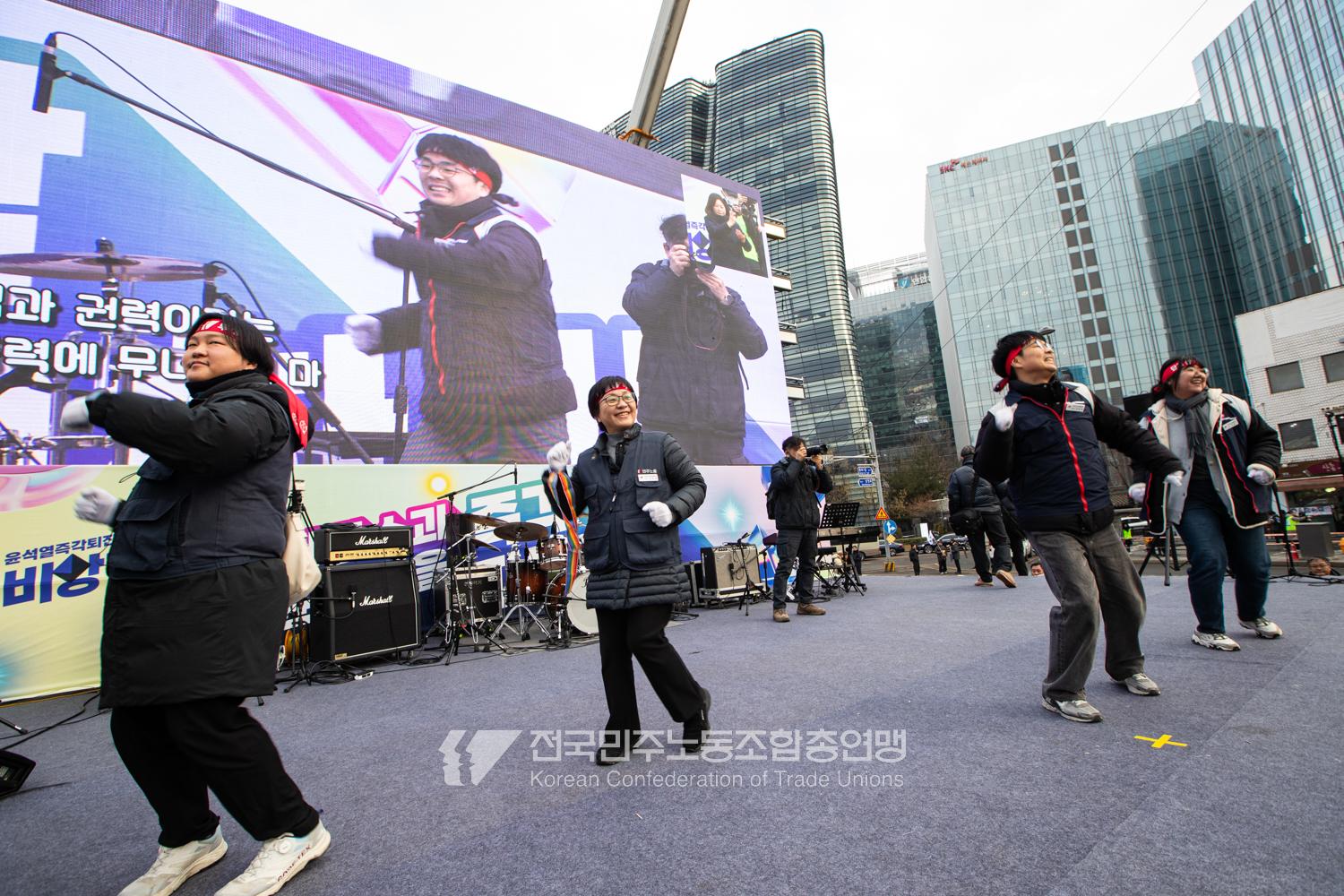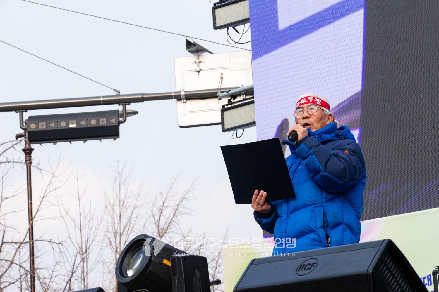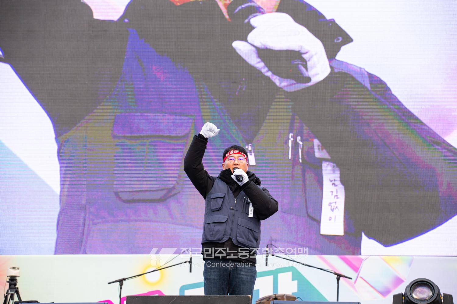 민주노총이 2025년 2월15일을 ‘민주노총 전 조합원 행동의 날’로 정하고 노동기본권 쟁취를 골자로 한 사회대개혁 요구를 전면화했다. 전국 1만5천여 조합원이 각 지역에서 동시다발로 대회를 열고 윤석열 즉각 파면과 사회대개혁 실현을 요구했다. 수도권에 모인 조합원 5천여 명은 서울지방고용노동청부터 비상행동 범시민대행진이 열리는 광화문 동십자각까지 행진했다. 행진 선두에는 거통고 조선소하청노동자의 투쟁을 지지하는 ‘무지개조선소 연대투쟁호’와 백기완 선생 4주기를 기리는 조형물이 앞장섰다. 민주노총 조합원들은 결의를 다지는 의미에서 빨간 머리띠를 둘렀고 가맹산하 조직은 저마다의 재치있는 방식으로 윤석열 득각 파면과 사회대개혁 의제를 선전했다.