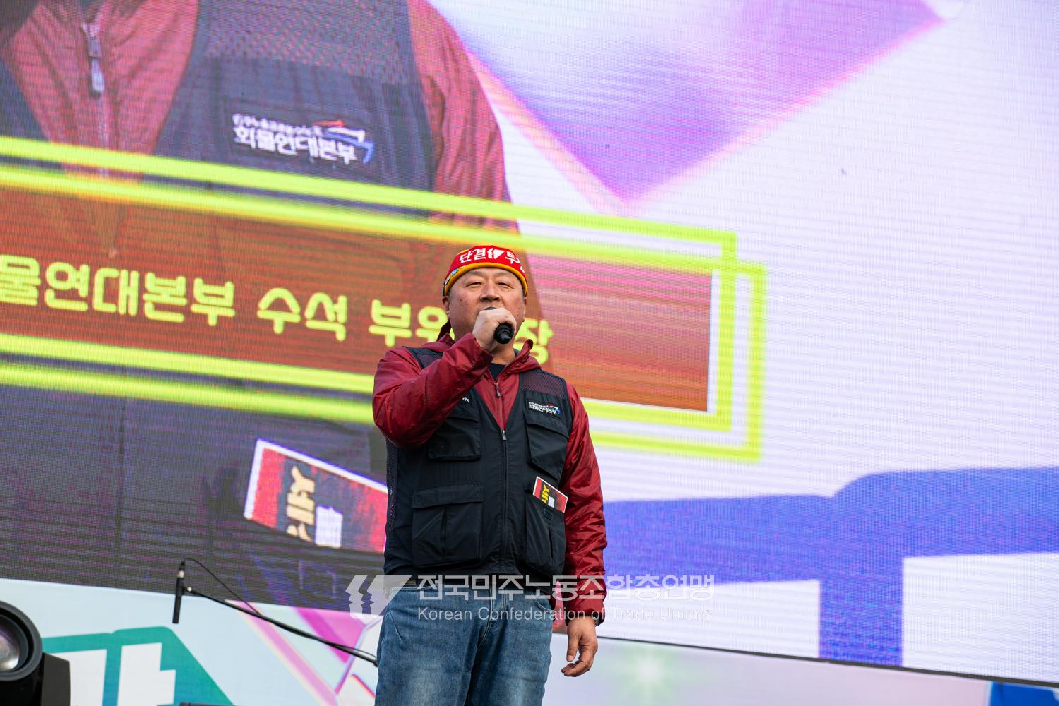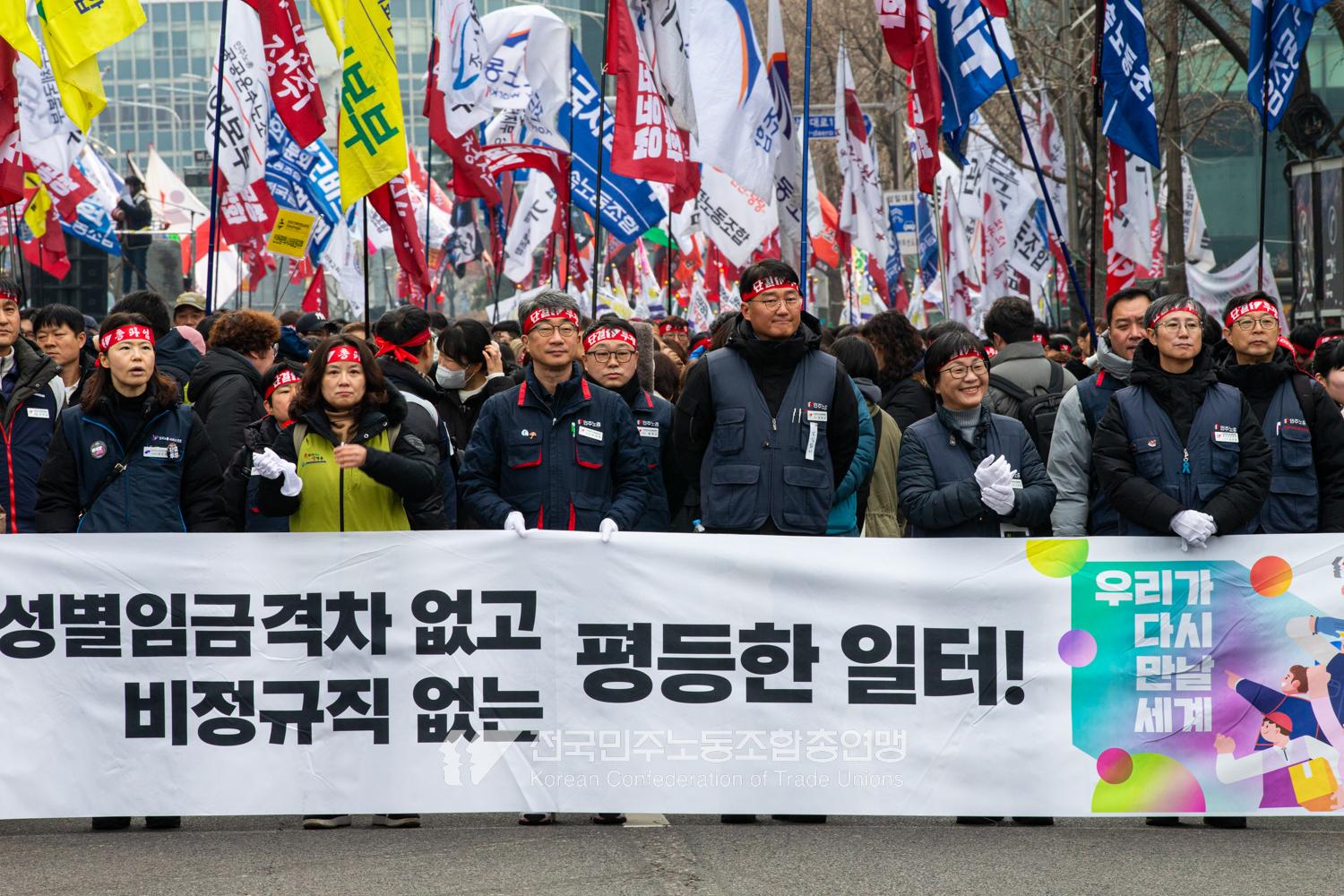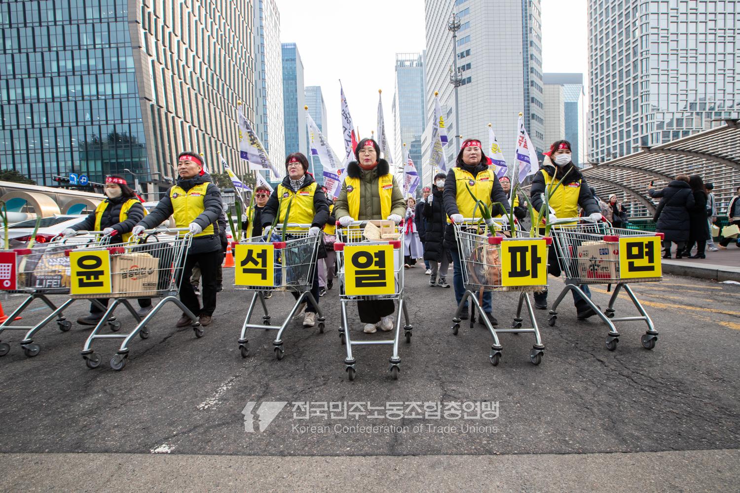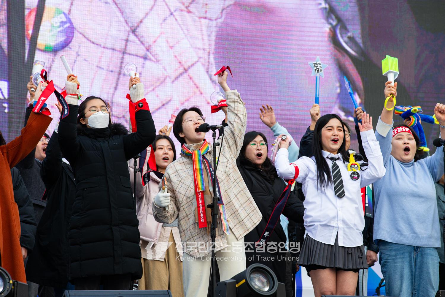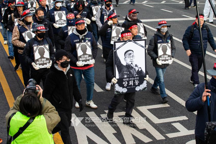 민주노총이 2025년 2월15일을 ‘민주노총 전 조합원 행동의 날’로 정하고 노동기본권 쟁취를 골자로 한 사회대개혁 요구를 전면화했다. 전국 1만5천여 조합원이 각 지역에서 동시다발로 대회를 열고 윤석열 즉각 파면과 사회대개혁 실현을 요구했다. 수도권에 모인 조합원 5천여 명은 서울지방고용노동청부터 비상행동 범시민대행진이 열리는 광화문 동십자각까지 행진했다. 행진 선두에는 거통고 조선소하청노동자의 투쟁을 지지하는 ‘무지개조선소 연대투쟁호’와 백기완 선생 4주기를 기리는 조형물이 앞장섰다. 민주노총 조합원들은 결의를 다지는 의미에서 빨간 머리띠를 둘렀고 가맹산하 조직은 저마다의 재치있는 방식으로 윤석열 득각 파면과 사회대개혁 의제를 선전했다.
