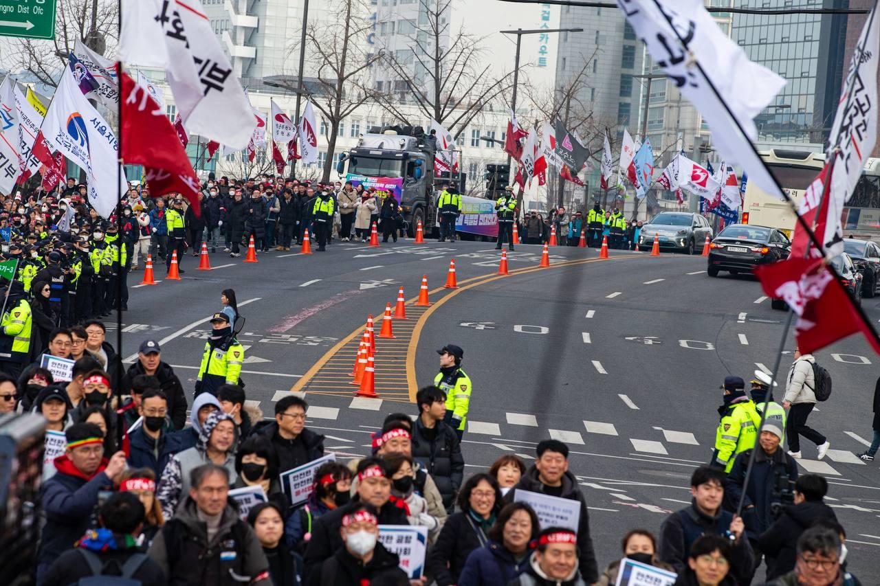 민주노총이 2025년 2월15일을 ‘민주노총 전 조합원 행동의 날’로 정하고 노동기본권 쟁취를 골자로 한 사회대개혁 요구를 전면화했다. 전국 1만5천여 조합원이 각 지역에서 동시다발로 대회를 열고 윤석열 즉각 파면과 사회대개혁 실현을 요구했다. 수도권에 모인 조합원 5천여 명은 서울지방고용노동청부터 비상행동 범시민대행진이 열리는 광화문 동십자각까지 행진했다. 행진 선두에는 거통고 조선소하청노동자의 투쟁을 지지하는 ‘무지개조선소 연대투쟁호’와 백기완 선생 4주기를 기리는 조형물이 앞장섰다. 민주노총 조합원들은 결의를 다지는 의미에서 빨간 머리띠를 둘렀고 가맹산하 조직은 저마다의 재치있는 방식으로 윤석열 득각 파면과 사회대개혁 의제를 선전했다.