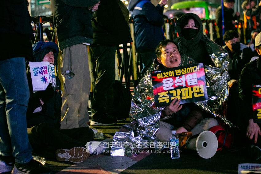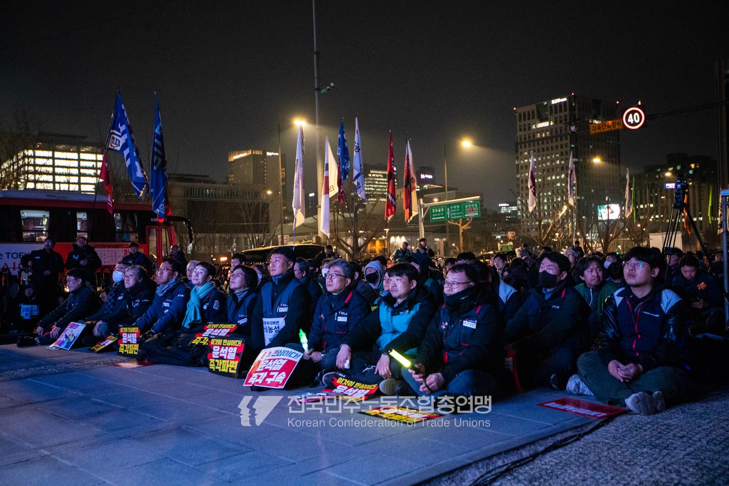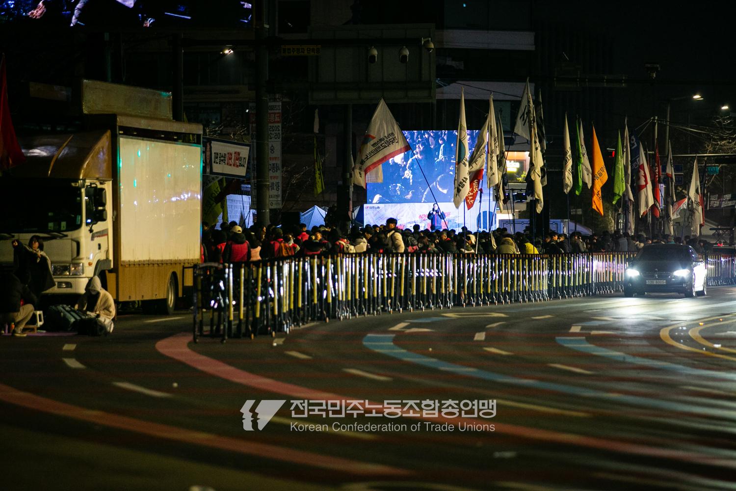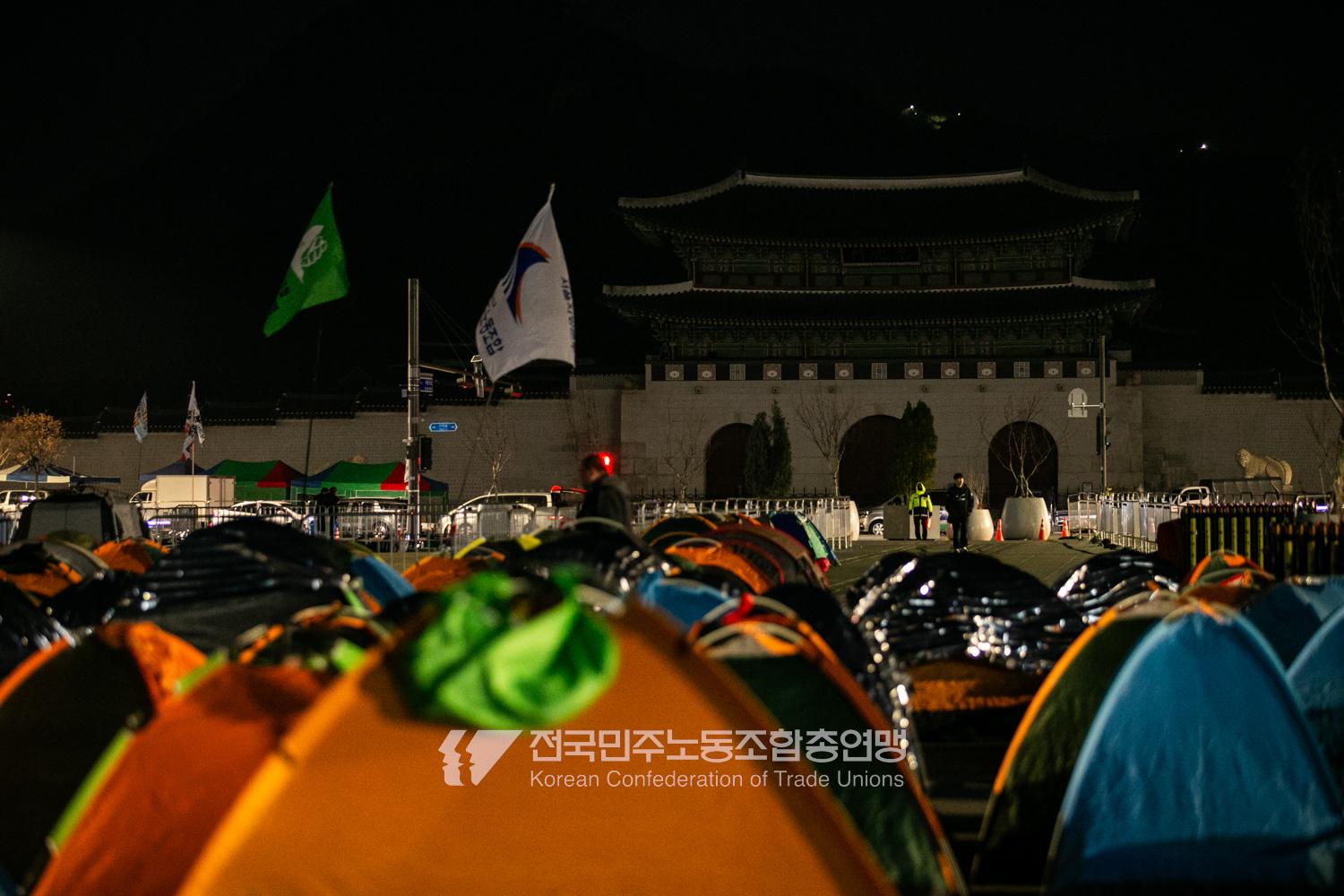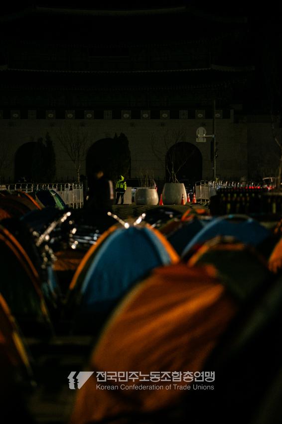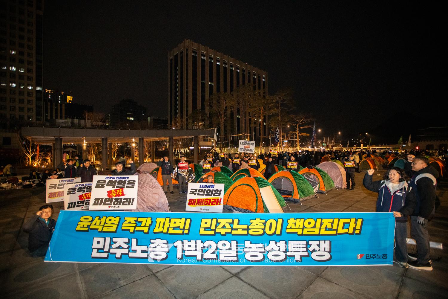 민주노총 전국단위사업장 대표자 3천여 명이 2025년 3월11일 서울 광화문에 모여 1박2일 투쟁에 나섰다. 민주노총은 광화문 동십자각 앞에서 연 비상 결의대회를 시작으로 1박2일 농성투쟁에 돌입했다. 대회를 마친 대표자들은 광화문 일대에서 ‘윤석열 즉각 파면을 위해 광장으로 모이자’라는 선전전과 피켓팅을 진행했다. 이후 비상행동이 연 집회를 거쳐 오후 10시부터 민주노총 야간집회를 열고 1박2일 농성에 돌입했다.