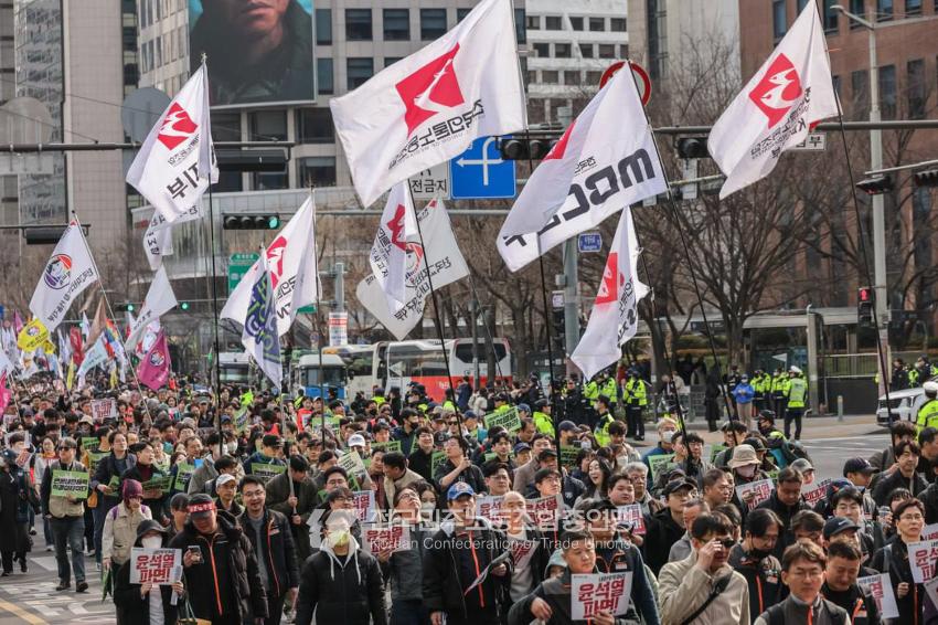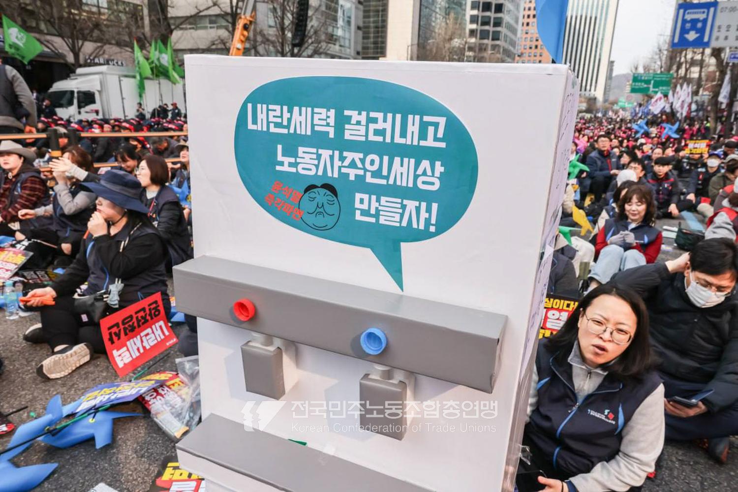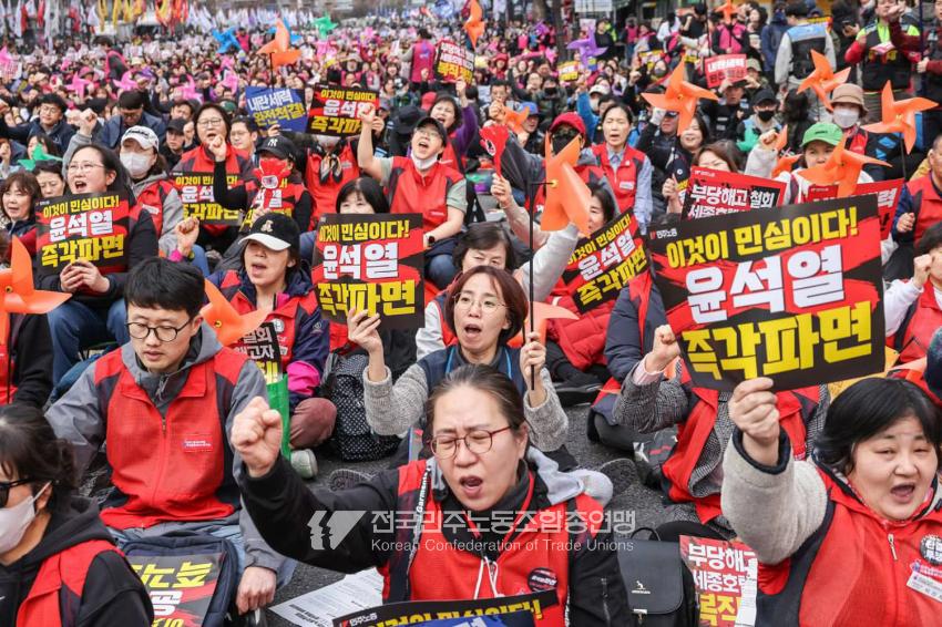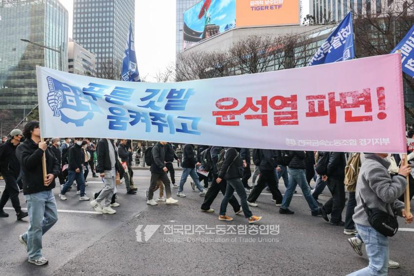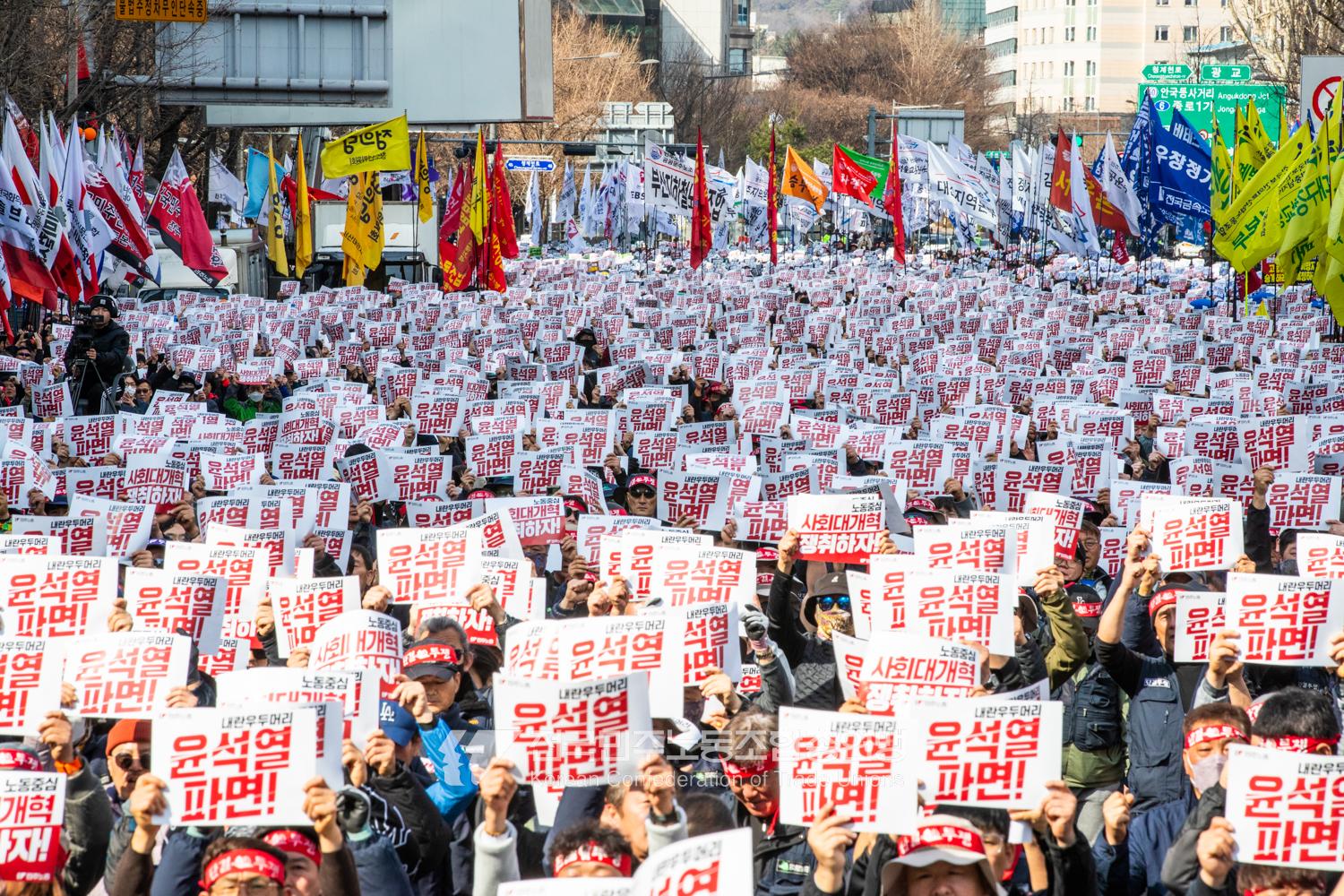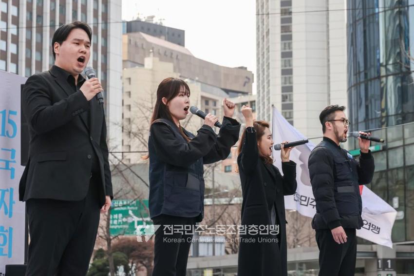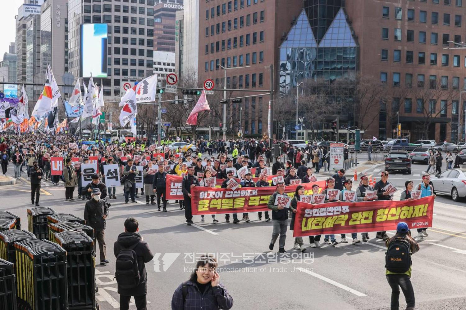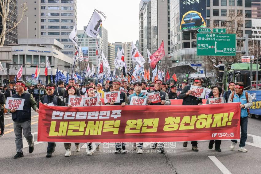윤석열이 석방된 지 일주일이 지나도록 헌법재판소의 파면 선고가 나지 않아 민주주의의 위기가 장기화된다는 우려가 나오는 가운데, 민주노총 조합원 3만여 명이 2025년 3월15일 오후 서울 중구 을지로입구에 모여 전국노동자대회를 열고 윤석열 파면과 내란 척결에 모든 것을 걸자고 결의했다. 건설산업연맹과 공공운수노조, 금속노조, 서비스연맹은 전국노동자대회에 앞서 사전대회를 열고 을지로입구로 집결했다. 대회를 마친 조합원들은 동십자각까지 행진하여 오후 5시에 열린 비상행동 집회에 참가했다.