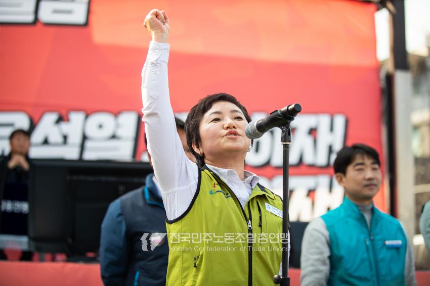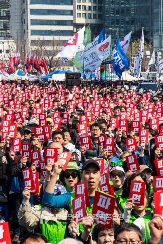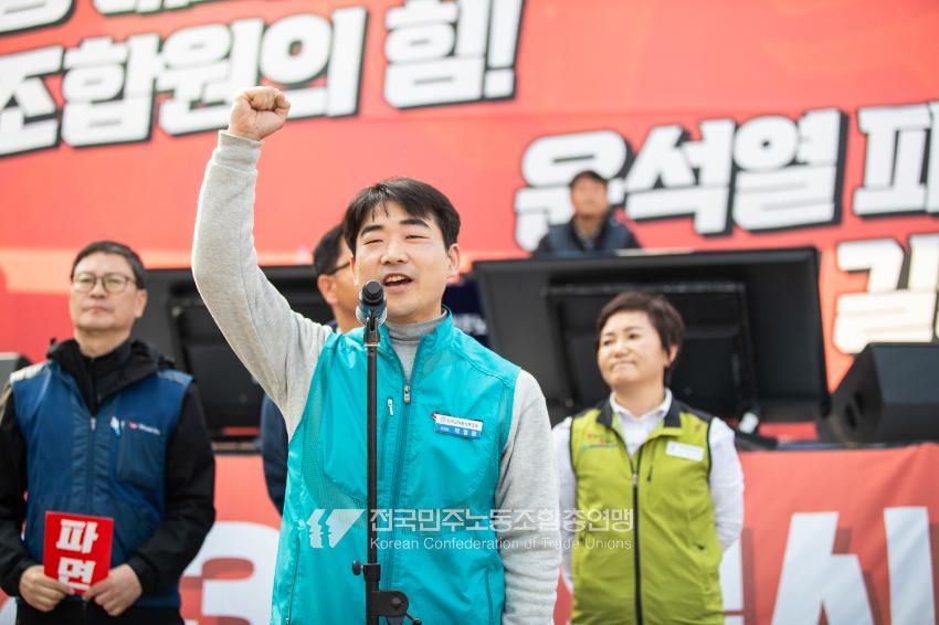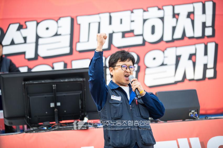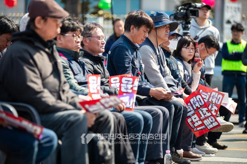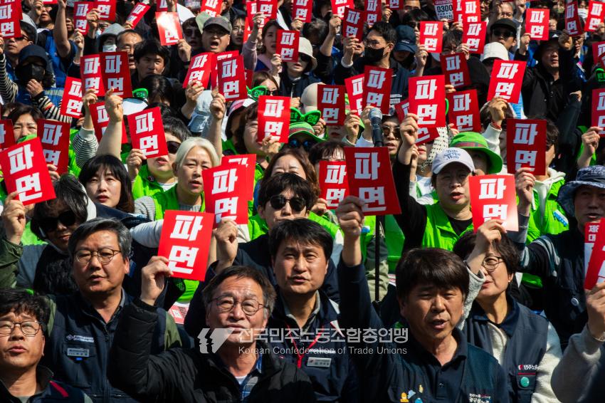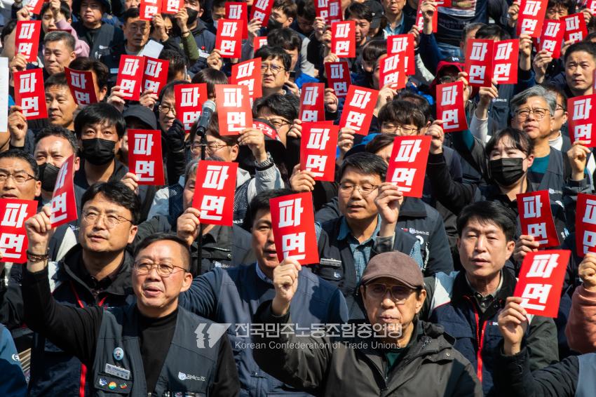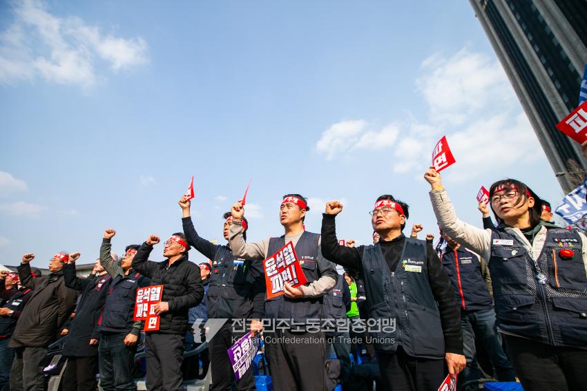 “기각이면 항쟁이다!” 민주노총 대의원들이 2025년 4월3일 오후 서울 광화문 서십자각 인근에서 제83차 임시 대의원대회를 열고 윤석열 탄핵 기각 시 즉각 투쟁에 돌입할 것을 결의했다. 헌법재판소의 8:0 전원일치 파면을 예상하면서도 상식을 뒤엎는 결정이 나오면 민주노총 또한 즉각 거리에 나와 민주주의를 사수하겠다는 의지다. 광장 대의원대회 안건은 ’윤석열 파면 투쟁 결의 건’ 단일 안건으로, 수정을 거쳐 대의원 만장일치로 통과했다. 탄핵 기각 시 즉각 전조직 총파업 투쟁에 돌입하고 탄핵 인용 시 5일 민주노총 조합원들은 각 지역에서 윤석열 파면 승리대회를 열기로 했다. 광장 대의원대회는 민주노총 산별노조 대표자들 모두의 결의 발언을 마지막으로 마무리됐다.